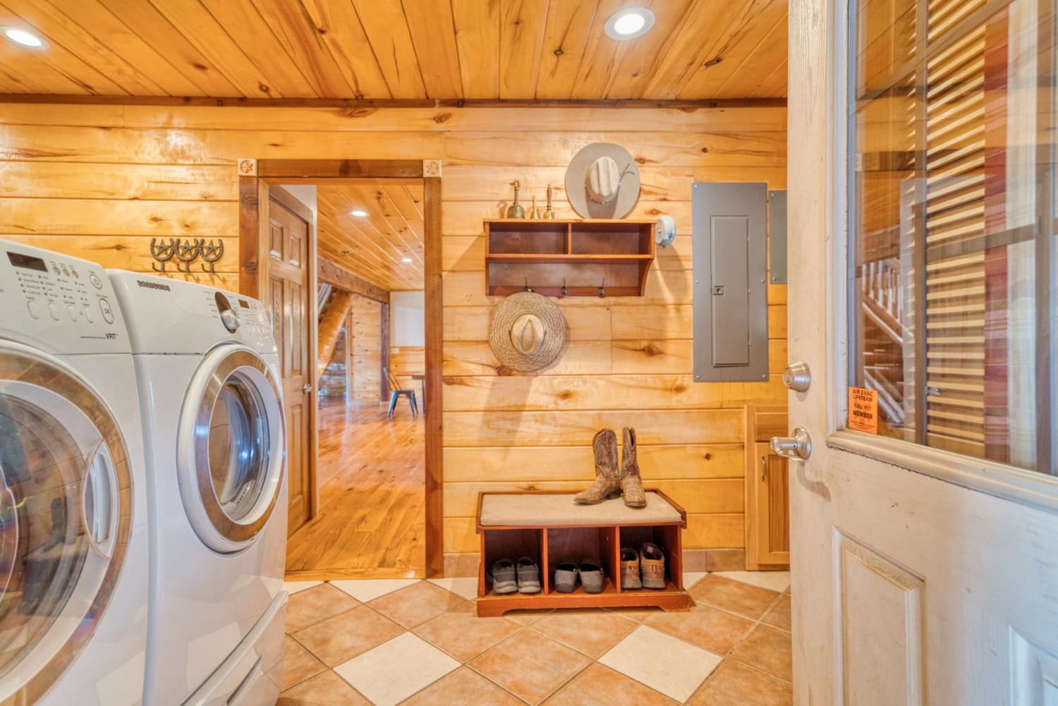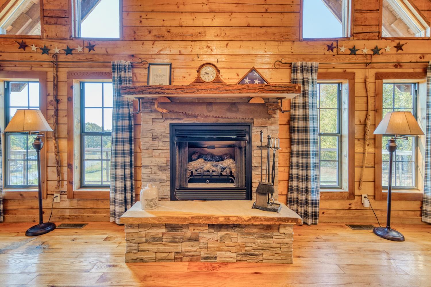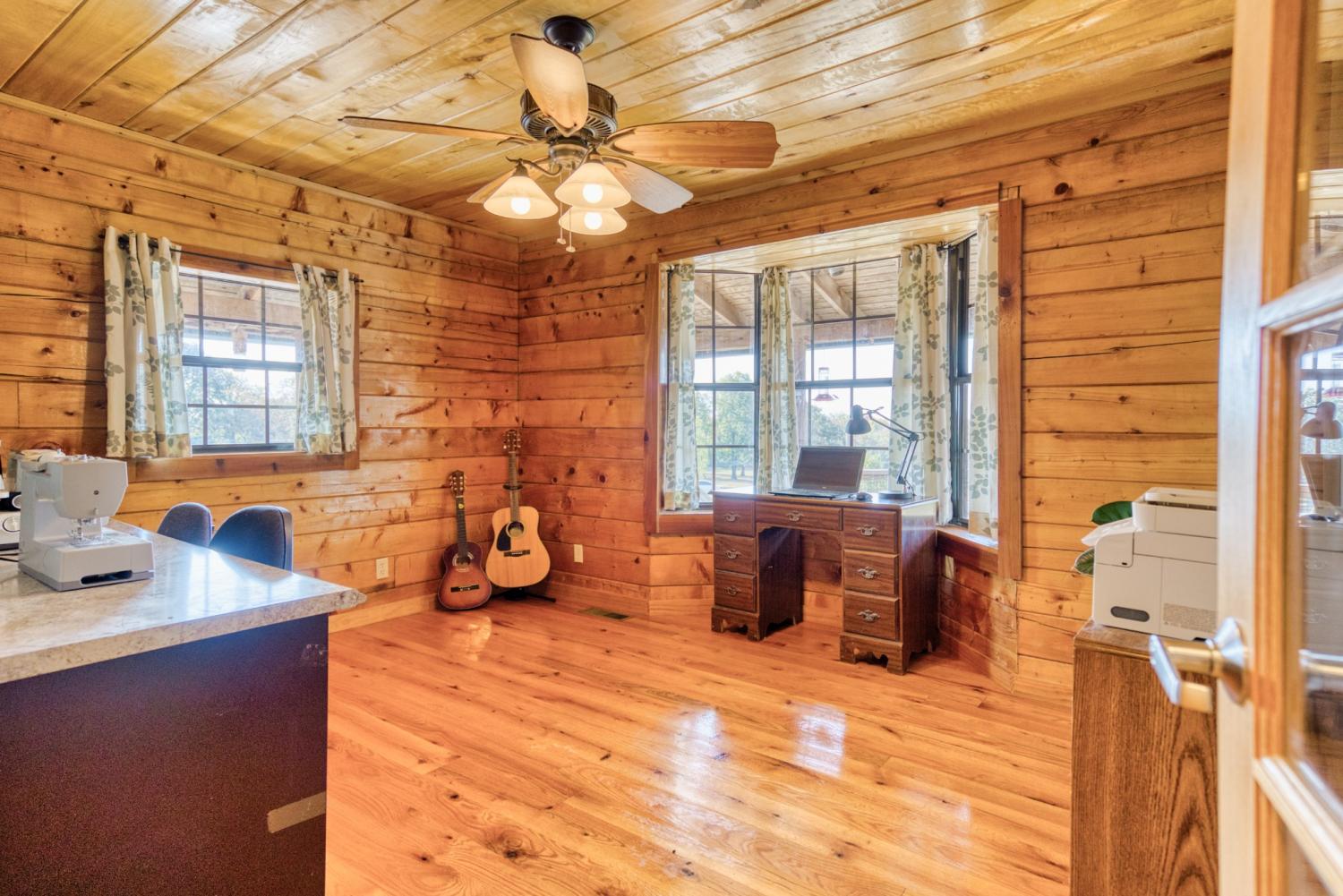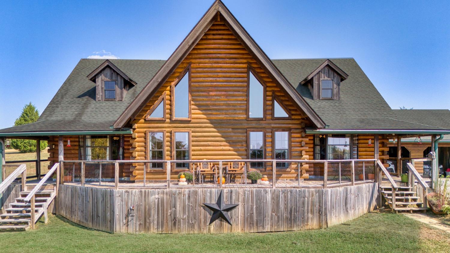 In the serene countryside of Russellville, KY and located in the Adairville school district, this stunning log home offers the perfect blend of rustic charm and modern comfort on 8.47 partially wooded acres. Crafted from hand-harvested Engleman Spruce logs sourced from the Rockies, this home boasts unmatched craftsmanship and attention to detail. A full wrap-around porch invites you to take in panoramic views that stretch all the way to the state line—on clear days, the scenery is breathtaking, and come July 4th, you’ll enjoy a front-row seat to fireworks lighting up the horizon in every direction. Inside, the home features four spacious bedrooms—two on the main floor and two upstairs—with ensuite bathrooms in both the primary and upper-level bedrooms. An additional full bathroom on the main level offers convenience for guests and easy access to the nearby laundry room, which includes a built-in ironing board. The home is equipped with two HVAC units, four skylights, and generous walk-in closets throughout. The kitchen is a chef’s delight with custom hickory cabinetry, all lower cabinets featuring pullout shelves, and a spacious pantry closet. Aspen wood ceilings and walls throughout the main floor pair beautifully with clear-coated red oak flooring. The centerpiece of the living area is a beautiful gas fireplace, featuring sandstone from local Costello Stone and finished with decorative rock. It's fully automatic and includes two emergency shut-off valves for safety. In the master suite, you'll find maple flooring and cabinetry, as well as additional aspen woodwork. The master bath includes his-and-hers walk-in closets and a luxurious Jacuzzi tub with an auxiliary heater to maintain a consistent water temperature. An oversized two-car garage offers plenty of room for vehicles and storage, while a massive 60x40 detached garage/workshop with a concrete floor is ready for your projects—already plumbed for a bathroom and wired for electricity. There’s also a fenced dog
