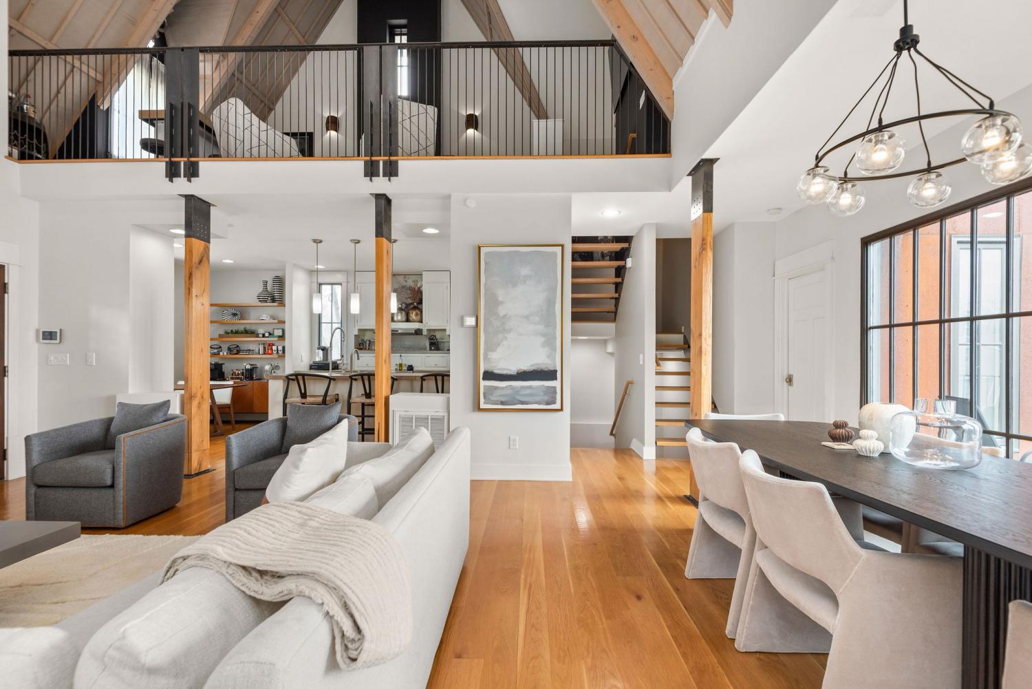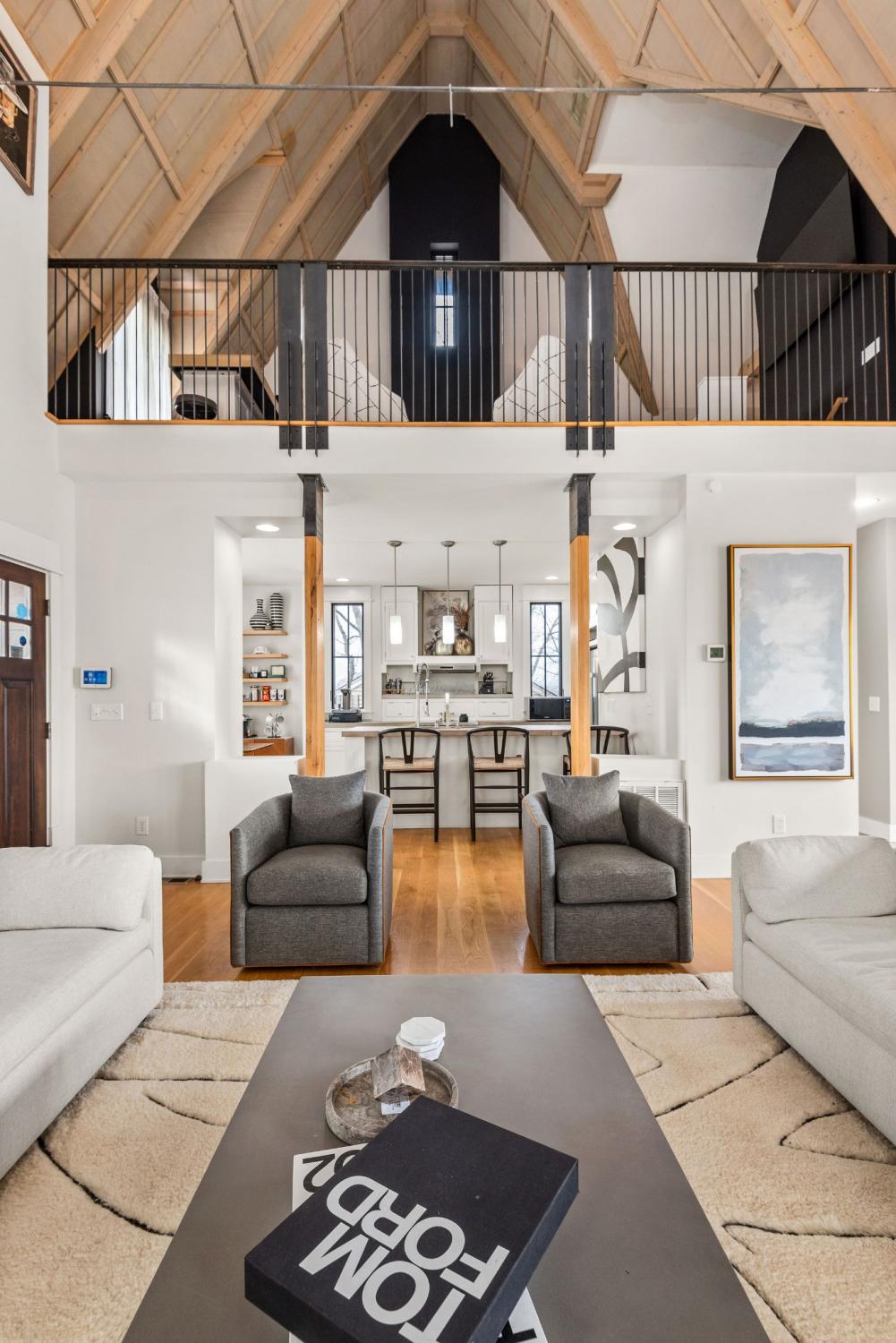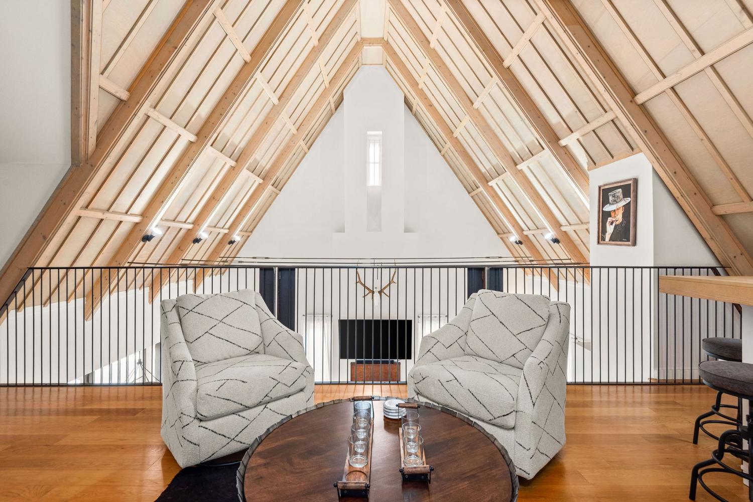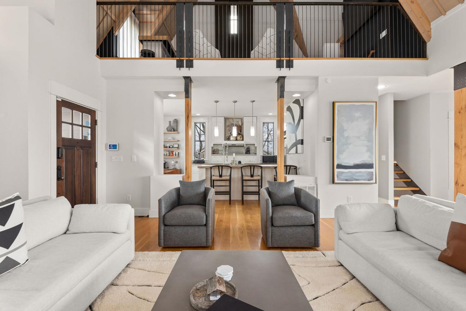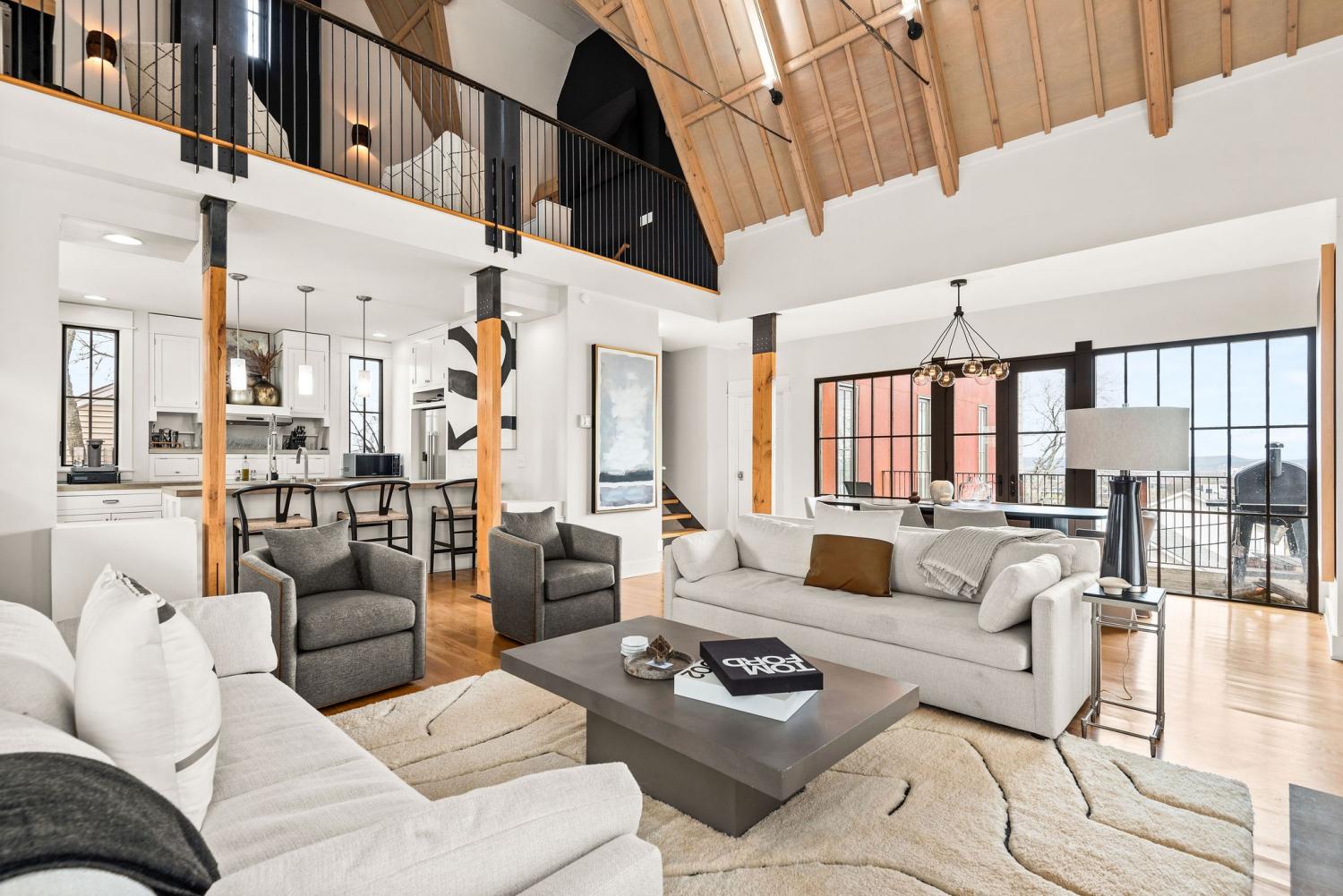Perched on a corner lot and walkable to L&L Market and Sylvan Supply, this masterpiece features 32’ oak, cathedral ceilings w/ custom ambient lighting, a magnificent rusted steel fireplace, expansive windows and entertaining opportunities galore. The main floor offers dining and breakfast spaces as well as a large balcony. The kitchen features stylish concrete countertops and a custom pantry. Completing the main floor is the master suite, featuring a renovated bathroom and walk-in closet. Upstairs, a loft overlooks the living room and provides a secondary entertaining space w/ a built-in bar. Downstairs features 533 unfinished sq ft that make for incredible storage. A new 8’ privacy fence and patio were added to the yard, elevating privacy and hosting potential. The yard also features a 275 sq ft attached storage space w/ electricity. Not just a home, but truly art. Pets accepted on case by case basis.