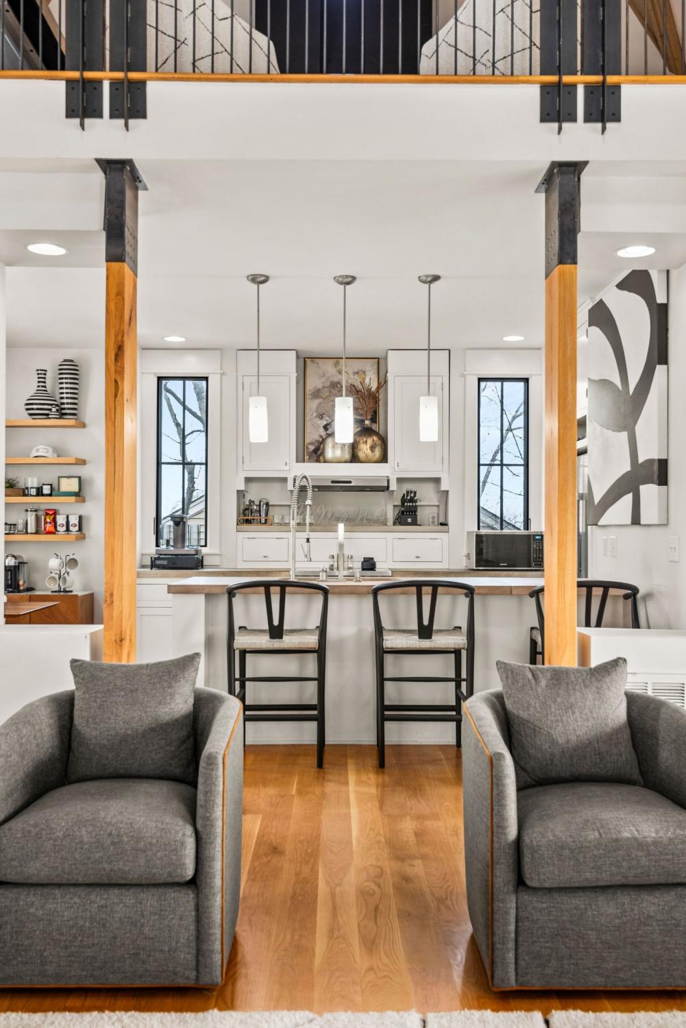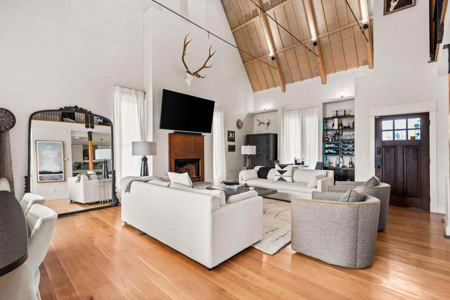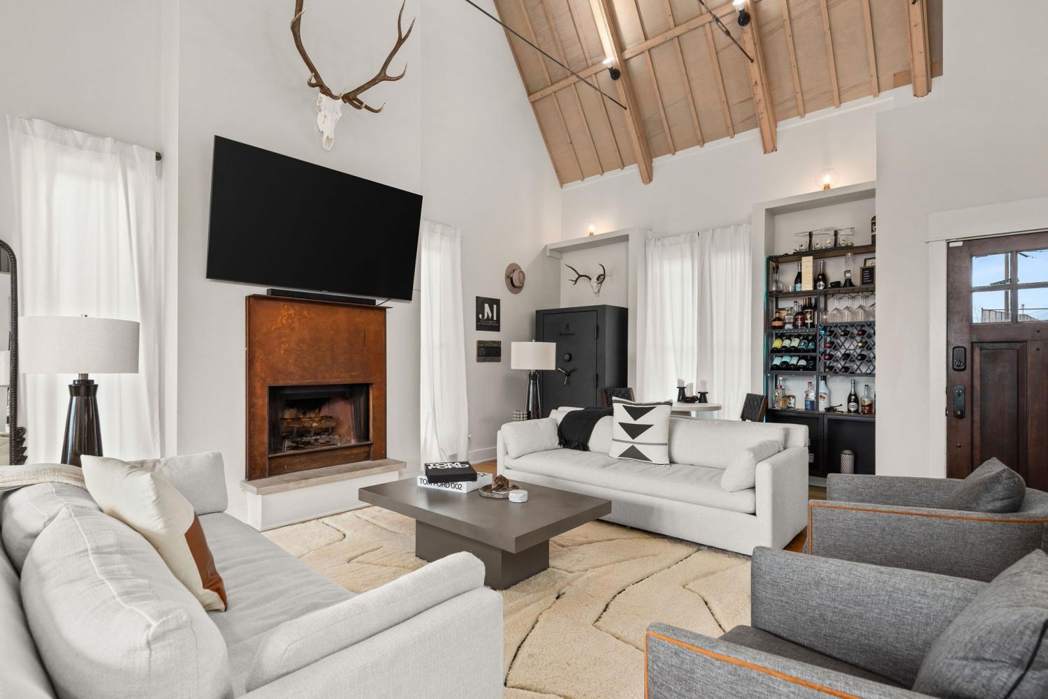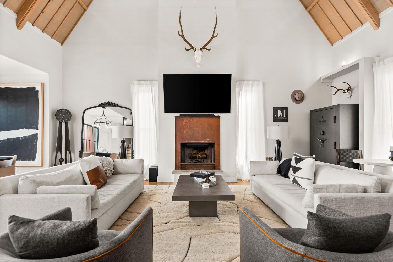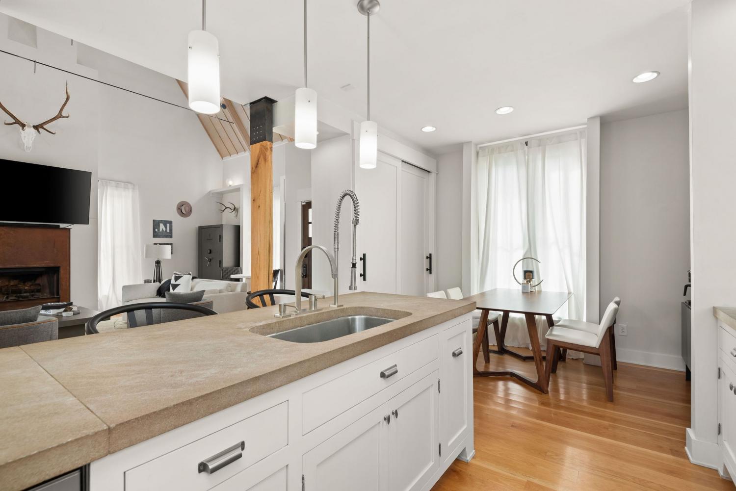 Perched on a corner lot and walkable to L&L Market and Sylvan Supply, this masterpiece features 32’ oak, cathedral ceilings w/ custom ambient lighting, a magnificent rusted steel fireplace, expansive windows and entertaining opportunities galore. The main floor offers dining and breakfast spaces as well as a large balcony. The kitchen features stylish concrete countertops and a custom pantry. Completing the main floor is the master suite, featuring a renovated bathroom and walk-in closet. Upstairs, a loft overlooks the living room and provides a secondary entertaining space w/ a built-in bar. Downstairs features 533 unfinished sq ft that make for incredible storage. A new 8’ privacy fence and patio were added to the yard, elevating privacy and hosting potential. The yard also features a 275 sq ft attached storage space w/ electricity. Not just a home, but truly art. Pets accepted on case by case basis.