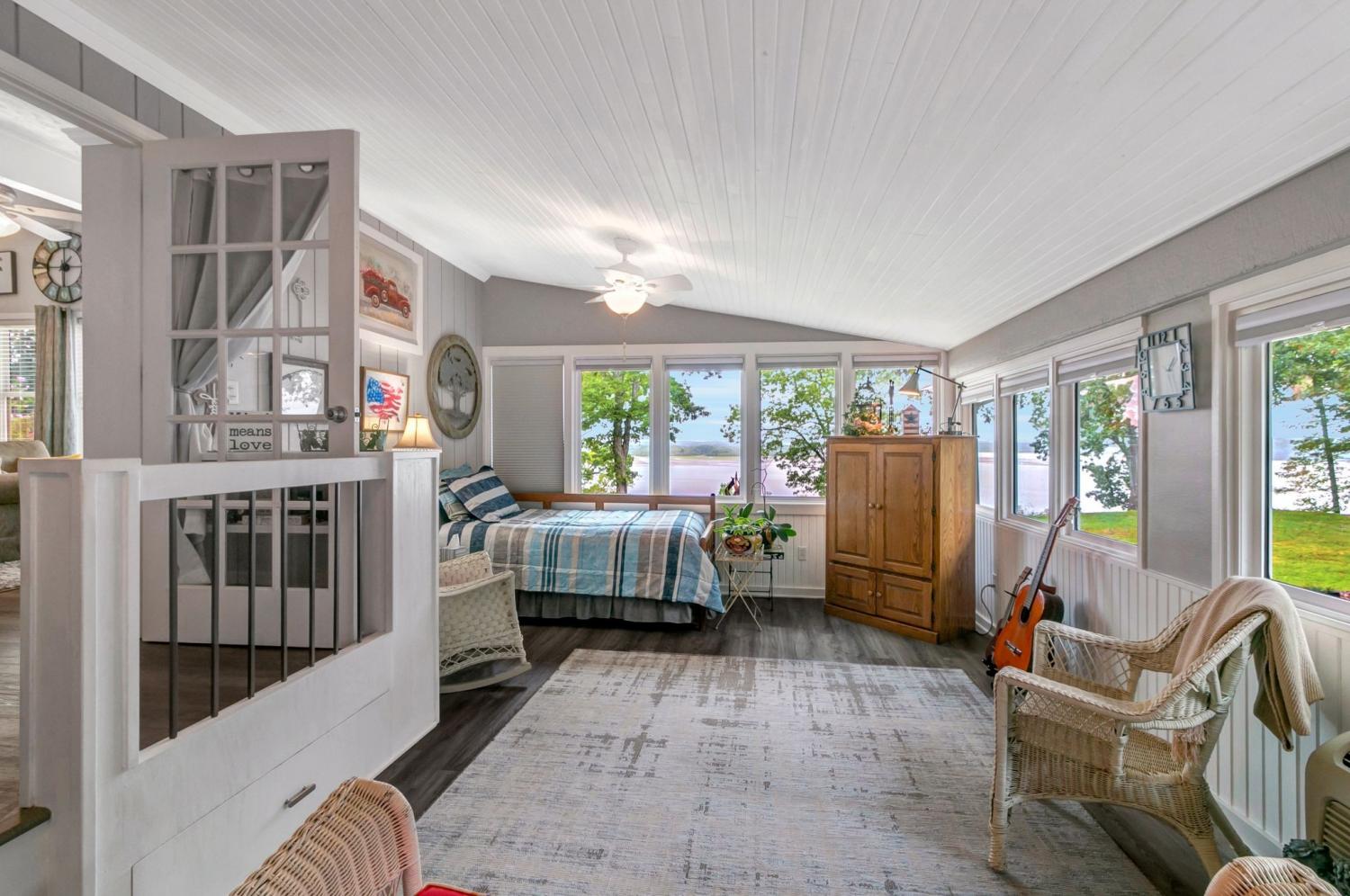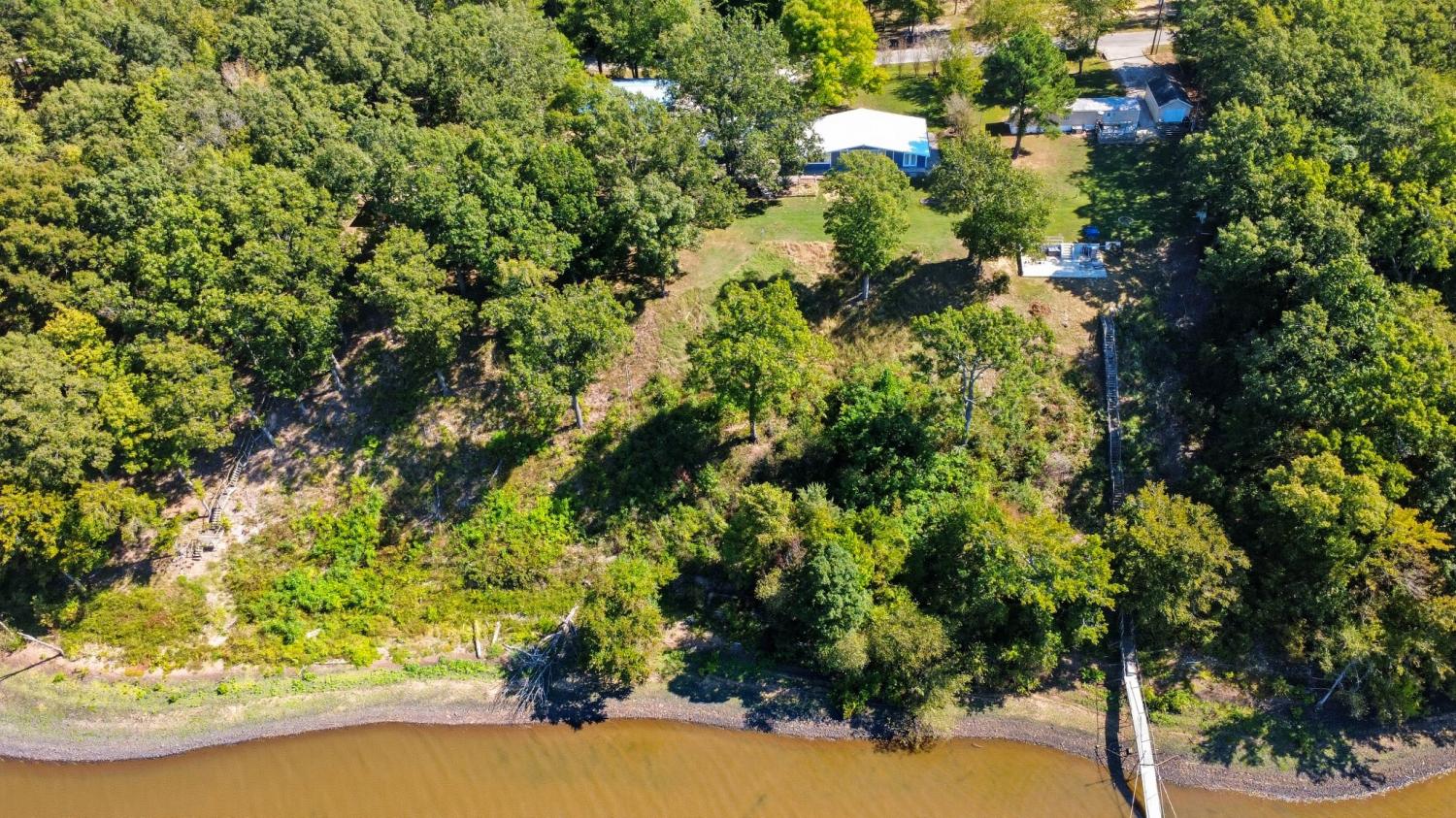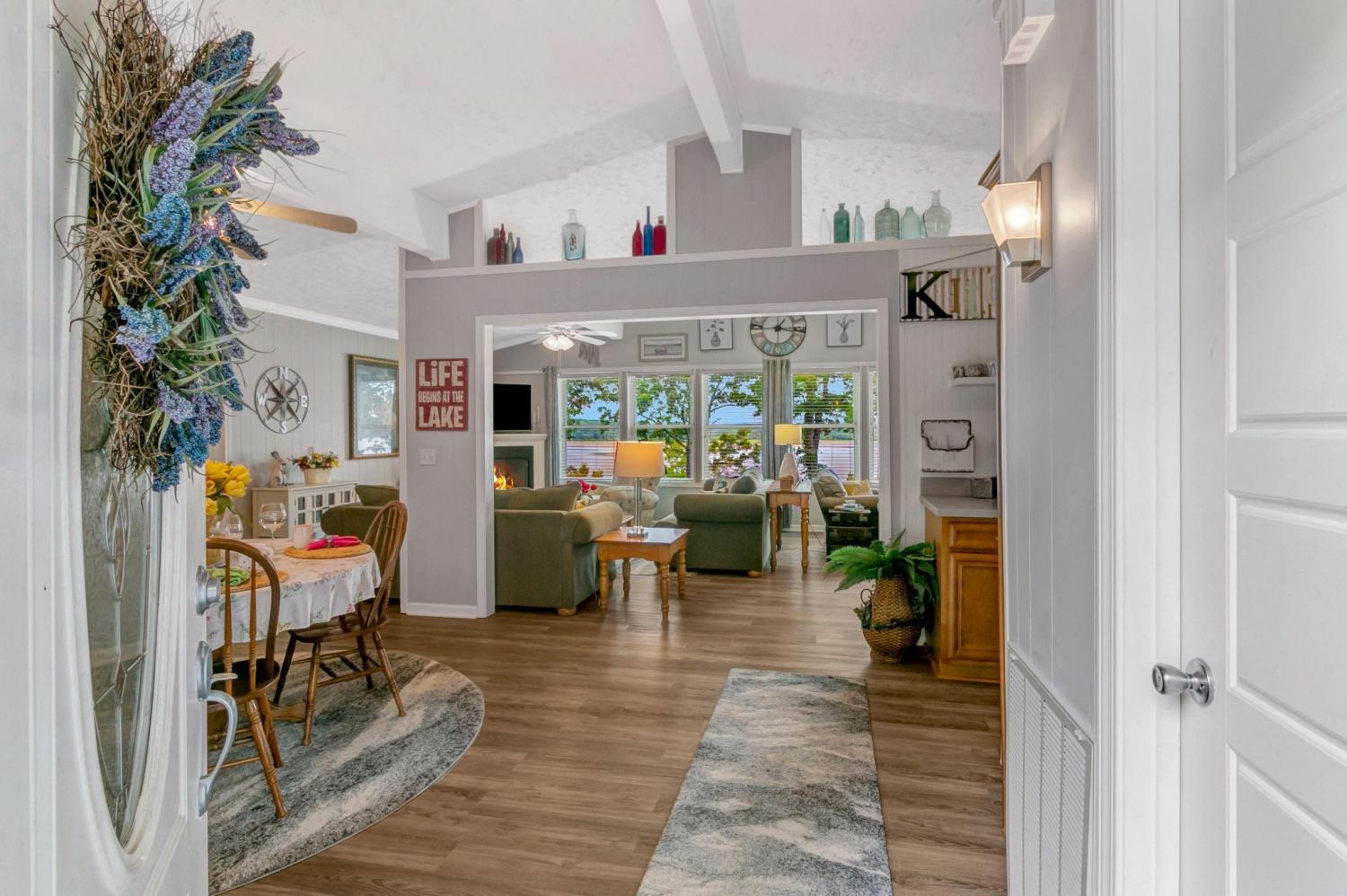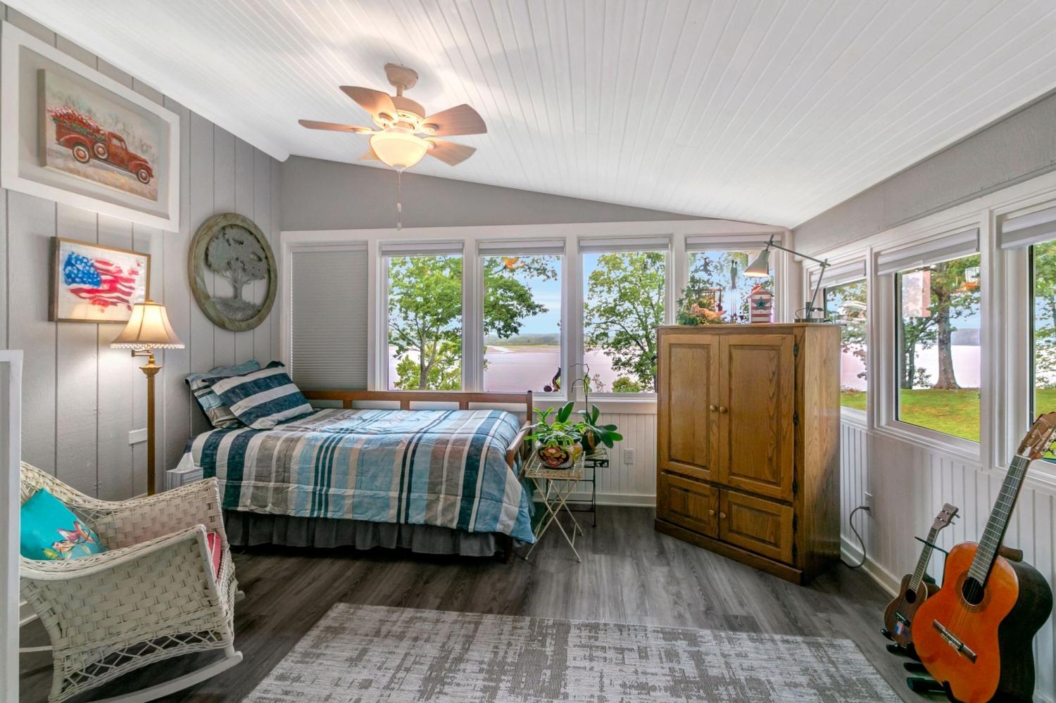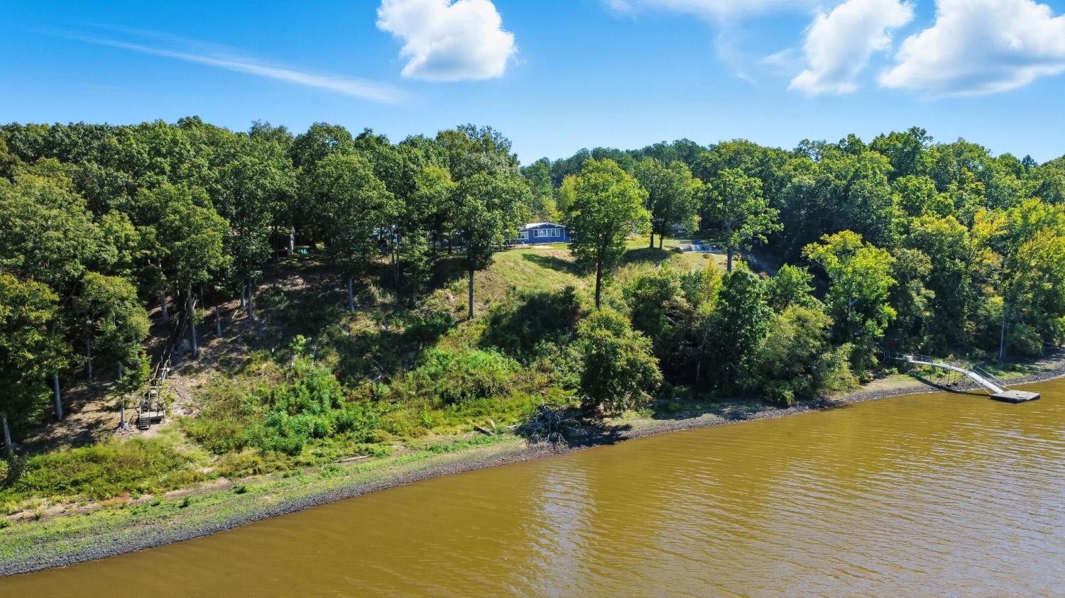 Water Views! Water Access! Kentucky Lake!! Two houses! Two lots! One price! The million-dollar water vistas from this home on the bluff are spectacular. The main house 1532 sq ft boasts scenery of the water from every room, including the owner’s retreat with tongue & groove cathedral ceilings, the living room with gas fireplace, cathedral ceilings, built-in book cases and high niche shelves, the open dining room with cathedral ceilings, the gourmet kitchen has custom cabinets in maple finish, and the private 23x13 Florida room with windows galore and white tongue & groove cathedral ceilings. The Florida room which can be used as sleeping quarters has black-out blinds on each window & a black-out curtain on the doors. The Florida room easily accommodates two twin or one double bed, a living area with TV and a secondary dining area for friendly gather. The owner's retreat has two walk-in closets, two vanities, and an elegant tile shower for two to enjoy. The half bathroom is conveniently located and houses the laundry closet. For easy cleaning, luxury vinyl floors are throughout the home and the owner’s retreat has plush carpet and beautiful tile bathroom floors. In addition, there is a private detached 437 sq ft guest house with a comfortable living room, a quiet bedroom, and a full bathroom. The separate detached oversized 40x36 three car tandem garage fits cars, boats, campers, toys & tools and has an enclosed 21x10 heated & cooled office with storage. The 2 lots total 1.20 acres. This bird lover's paradise has White Pelicans, Eagles & Egrets living in the backyard foliage and soothing waters. The views include miles of TWRA land and nearby land of the National Wildlife Refuge overseen by the U.S. Fish and Wildlife Services. Lot #22 septic system is approved for 1 bedroom, and lot #23 is approved for 3 bedrooms. For a dock permit, the new owner may apply to the TVA for a section 26a permit. Most furnishings convey making this turn key home ready for your pleasure.