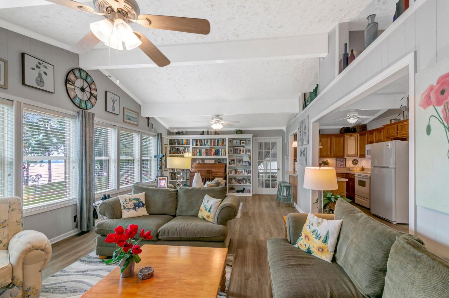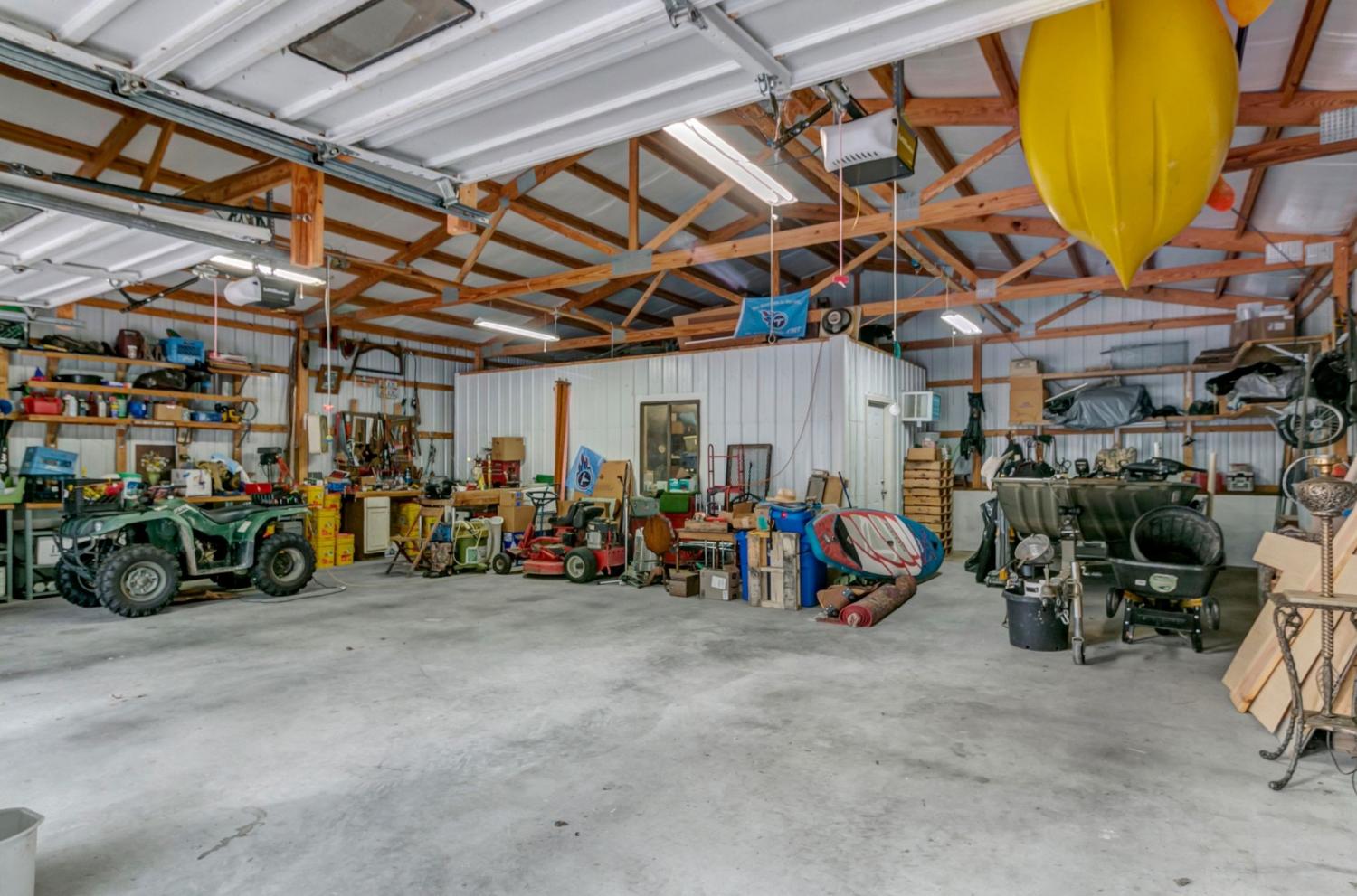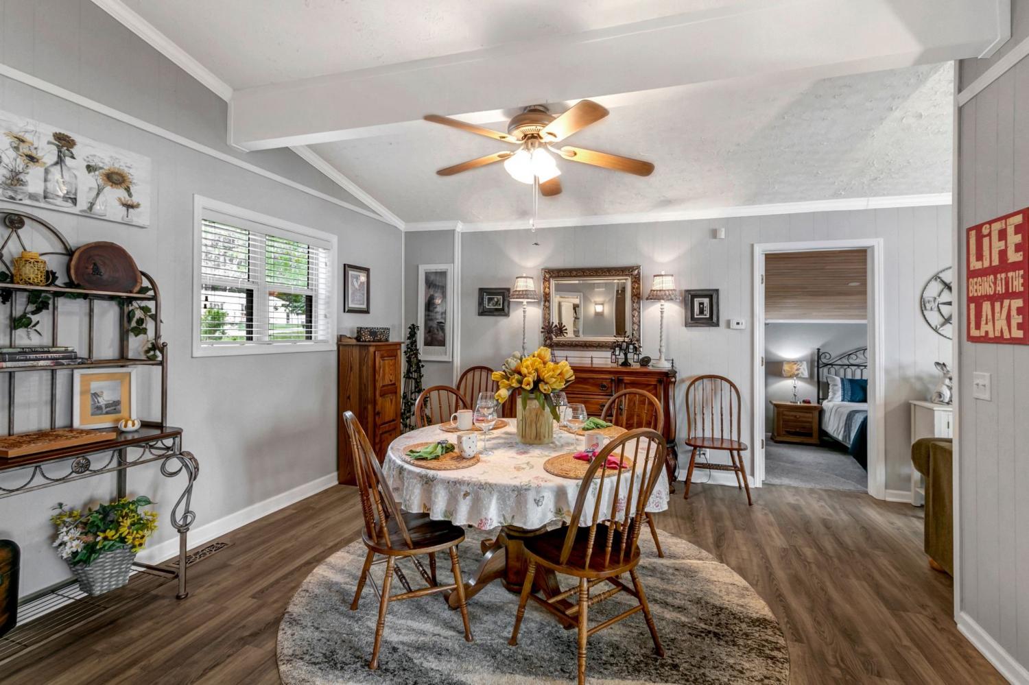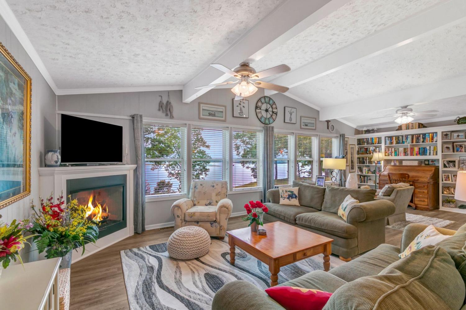 Water Views! Water Access! Kentucky Lake!! Two houses! Two lots! One price! The million-dollar water vistas from this home on the bluff are spectacular. The main house 1532 sq ft boasts scenery of the water from every room, including the owner’s retreat with tongue & groove cathedral ceilings, the living room with gas fireplace, cathedral ceilings, built-in book cases and high niche shelves, the open dining room with cathedral ceilings, the gourmet kitchen has custom cabinets in maple finish, and the private 23x13 Florida room with windows galore and white tongue & groove cathedral ceilings. The Florida room which can be used as sleeping quarters has black-out blinds on each window & a black-out curtain on the doors. The Florida room easily accommodates two twin or one double bed, a living area with TV and a secondary dining area for friendly gather. The owner's retreat has two walk-in closets, two vanities, and an elegant tile shower for two to enjoy. The half bathroom is conveniently located and houses the laundry closet. For easy cleaning, luxury vinyl floors are throughout the home and the owner’s retreat has plush carpet and beautiful tile bathroom floors. In addition, there is a private detached 437 sq ft guest house with a comfortable living room, a quiet bedroom, and a full bathroom. The separate detached oversized 40x36 three car tandem garage fits cars, boats, campers, toys & tools and has an enclosed 21x10 heated & cooled office with storage. The 2 lots total 1.20 acres. This bird lover's paradise has White Pelicans, Eagles & Egrets living in the backyard foliage and soothing waters. The views include miles of TWRA land and nearby land of the National Wildlife Refuge overseen by the U.S. Fish and Wildlife Services. Lot #22 septic system is approved for 1 bedroom, and lot #23 is approved for 3 bedrooms. For a dock permit, the new owner may apply to the TVA for a section 26a permit. Most furnishings convey making this turn key home ready for your pleasure.