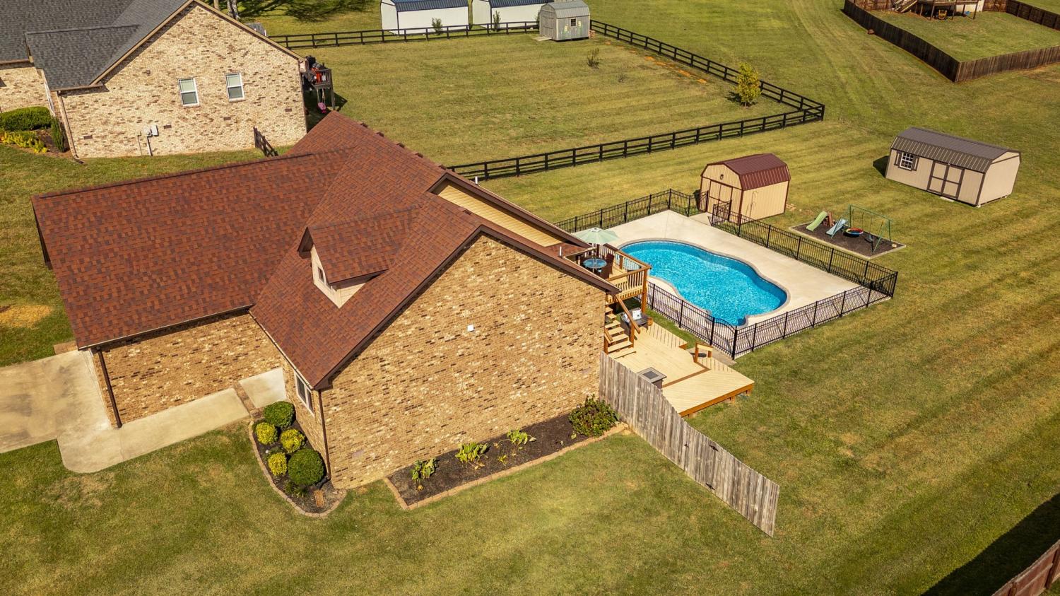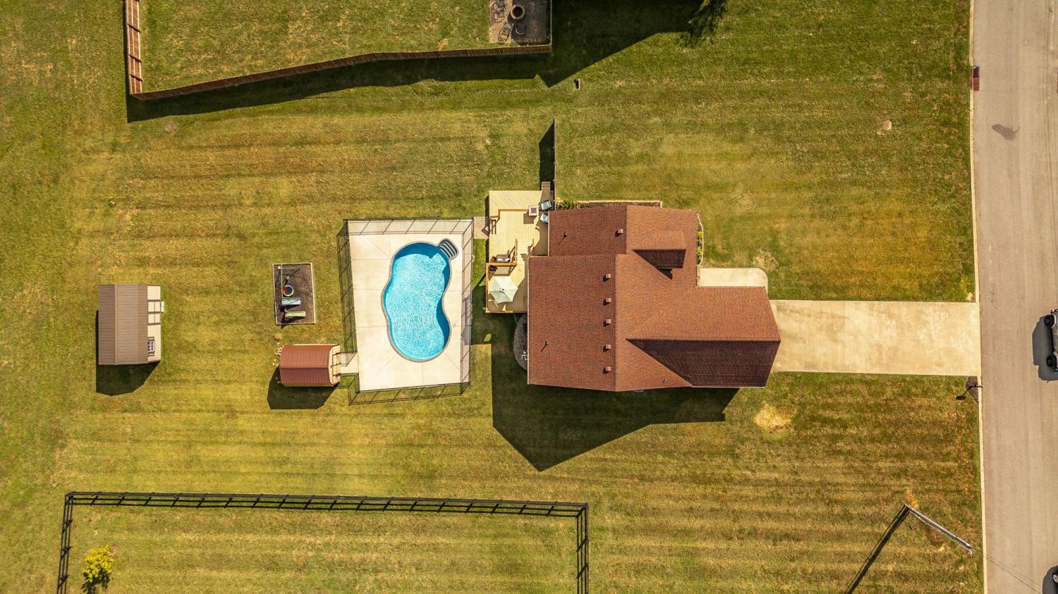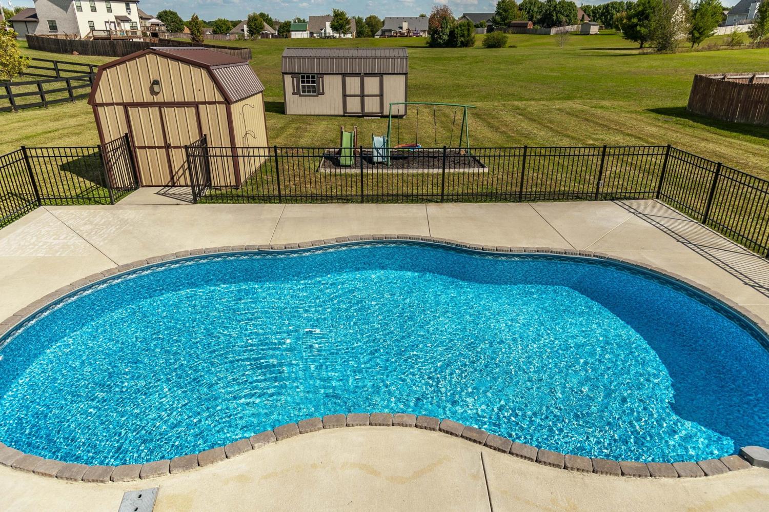Welcome to this inviting 3-bedroom, 2-bathroom home with a bonus room tucked within a well-established community known for its charm and convenience. Perfectly located just minutes from the Kentucky state line and I-65 access, this home offers the best of peaceful living with quick connectivity. Step outside to your own private retreat featuring a heated in-ground pool, fully fenced and complemented by a spacious deck and patio area—perfect for gatherings, lounging, or summer cookouts. The pool area includes a dedicated attached pool storage building, plus an additional storage building for tools, hobbies, or seasonal items. Inside, the comfortable floor plan provides plenty of room for everyday living and entertaining. The bonus room offers flexibility for an office, playroom, or extra lounge space—tailored to your needs. This property delivers the perfect blend of comfort, function, and outdoor enjoyment—ready for you to move in and make it your own. A $1,500 credit will be provided at closing for fresh paint for back porches, allowing the new owner to personalize the finish to their own style. Don’t miss virtual tour provided in the link.