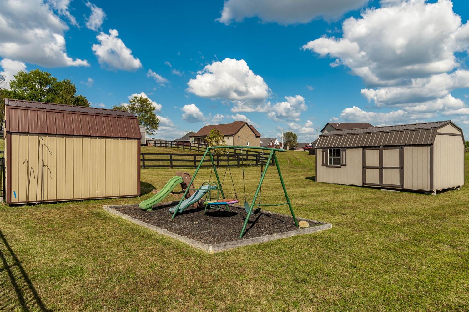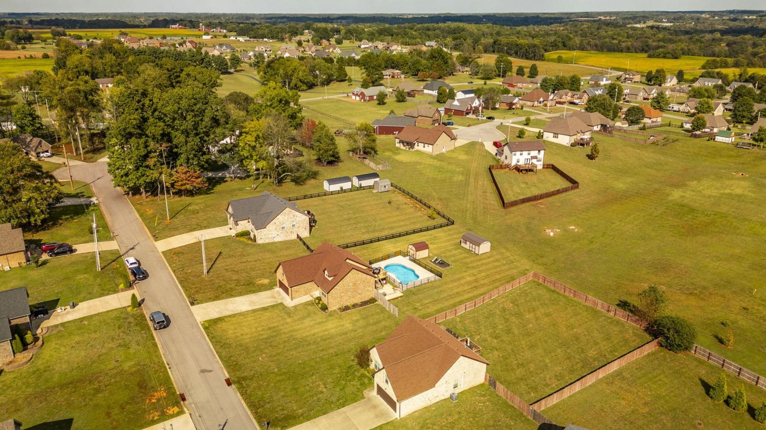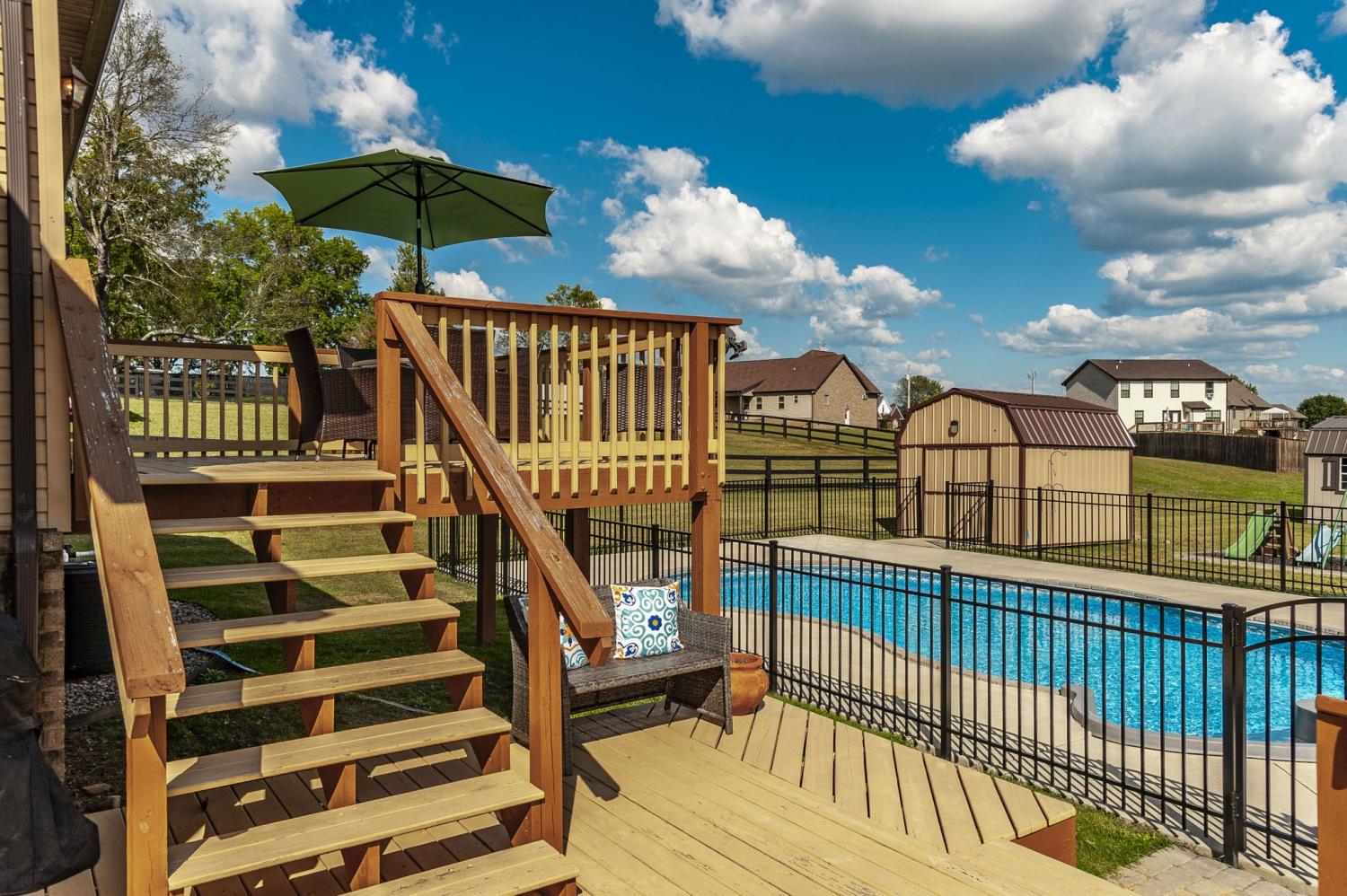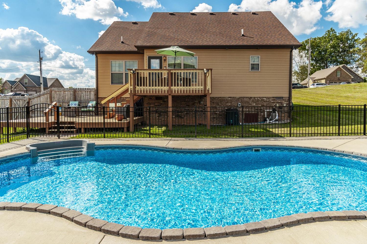 Welcome to this inviting 3-bedroom, 2-bathroom home with a bonus room tucked within a well-established community known for its charm and convenience. Perfectly located just minutes from the Kentucky state line and I-65 access, this home offers the best of peaceful living with quick connectivity. Step outside to your own private retreat featuring a heated in-ground pool, fully fenced and complemented by a spacious deck and patio area—perfect for gatherings, lounging, or summer cookouts. The pool area includes a dedicated attached pool storage building, plus an additional storage building for tools, hobbies, or seasonal items. Inside, the comfortable floor plan provides plenty of room for everyday living and entertaining. The bonus room offers flexibility for an office, playroom, or extra lounge space—tailored to your needs. This property delivers the perfect blend of comfort, function, and outdoor enjoyment—ready for you to move in and make it your own. A $1,500 credit will be provided at closing for fresh paint for back porches, allowing the new owner to personalize the finish to their own style. Don’t miss virtual tour provided in the link.