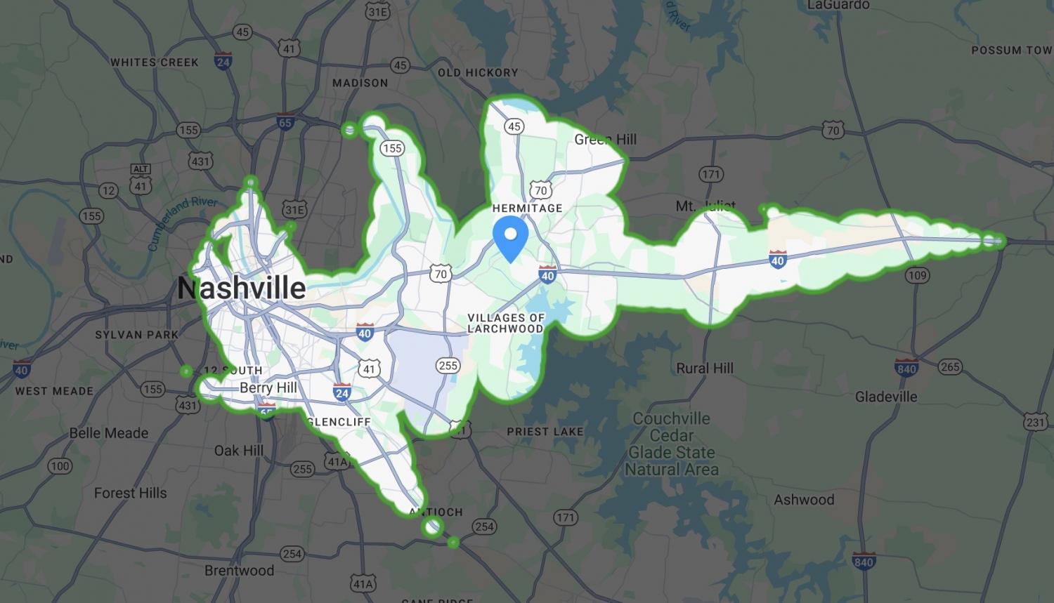 From Downtown Nashville: I-40 E, Exit 221A toward Hermitage, Keep right onto Central Pike, Turn left onto Central Pike, Left onto Dodson Chapel Rd, Right onto Hoggett Ford Rd, Right onto Elk Springs Dr, Right onto Magnolia Farms Dr and it's on your right.