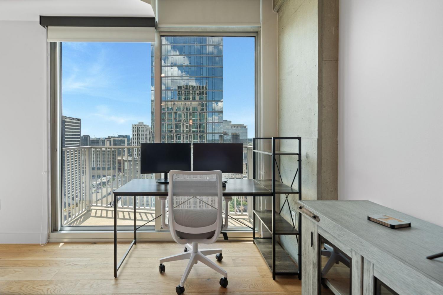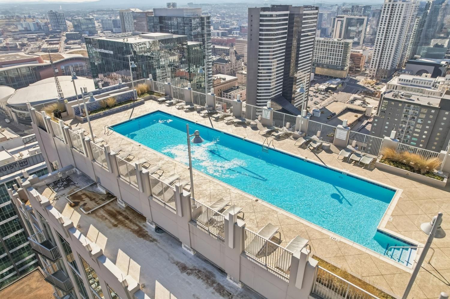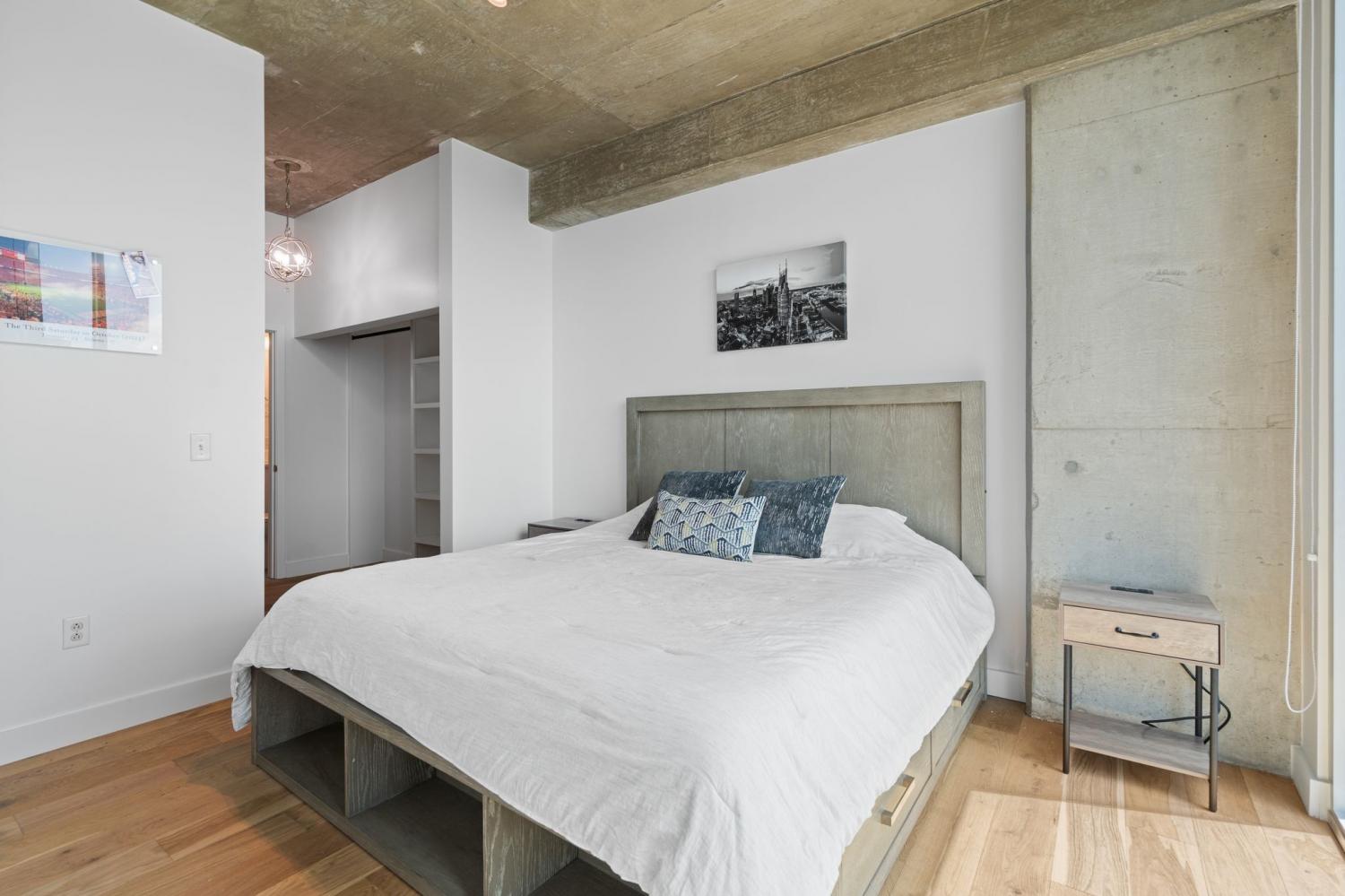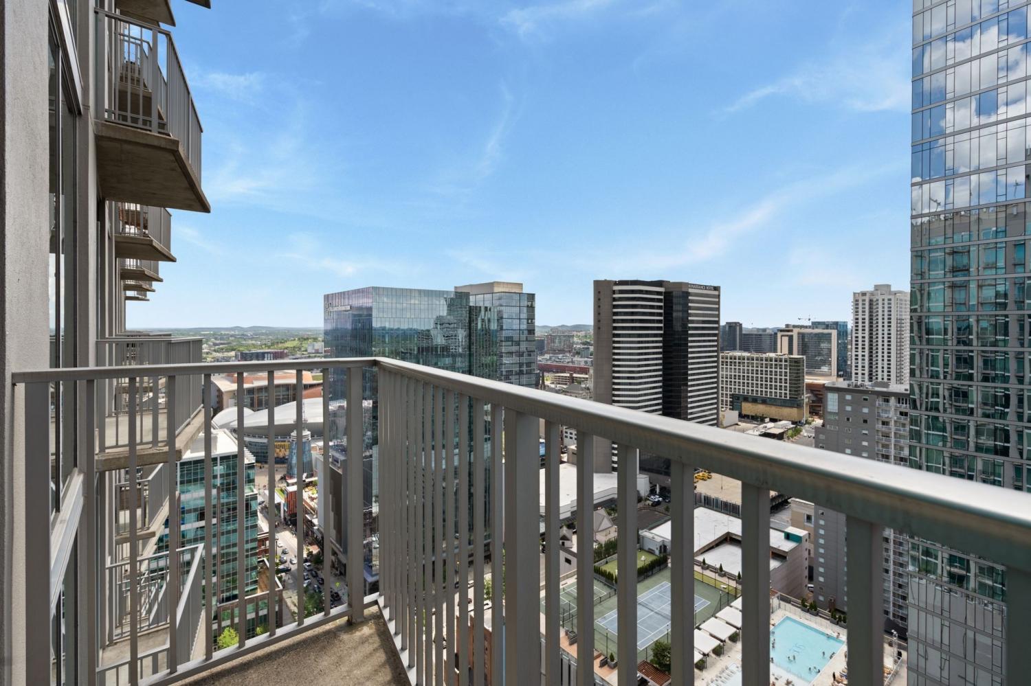 Up in the clouds sits unit 2504 in the Viridian. This west facing unit overlooks the historic church next door and has amazing views of the skyline looking due west, north and south. Just steps from Broadway, the Nashville Predators arena and Printers Alley, come see what this unit has to offer. Recent renovations including fresh paint, elegant light hardwood floors, one level quartz countertops with bar top seating and farm sink, brand-new state of the art stainless steel LG appliances, new custom blinds, Nest thermostat, custom-built closets, new tile in bathroom, and a convenient desk space, plus washer & dryer. New water heater in 2021. 24/7 security and concierge, rooftop pool, workout room and club room on 31st floor. 1 deeded parking space.