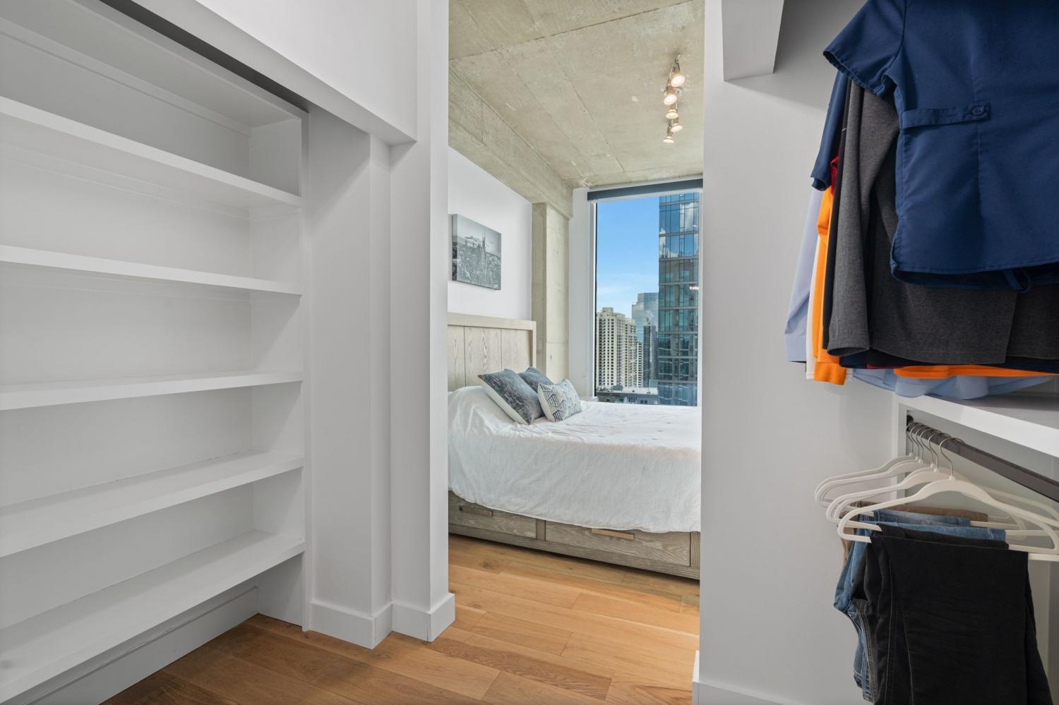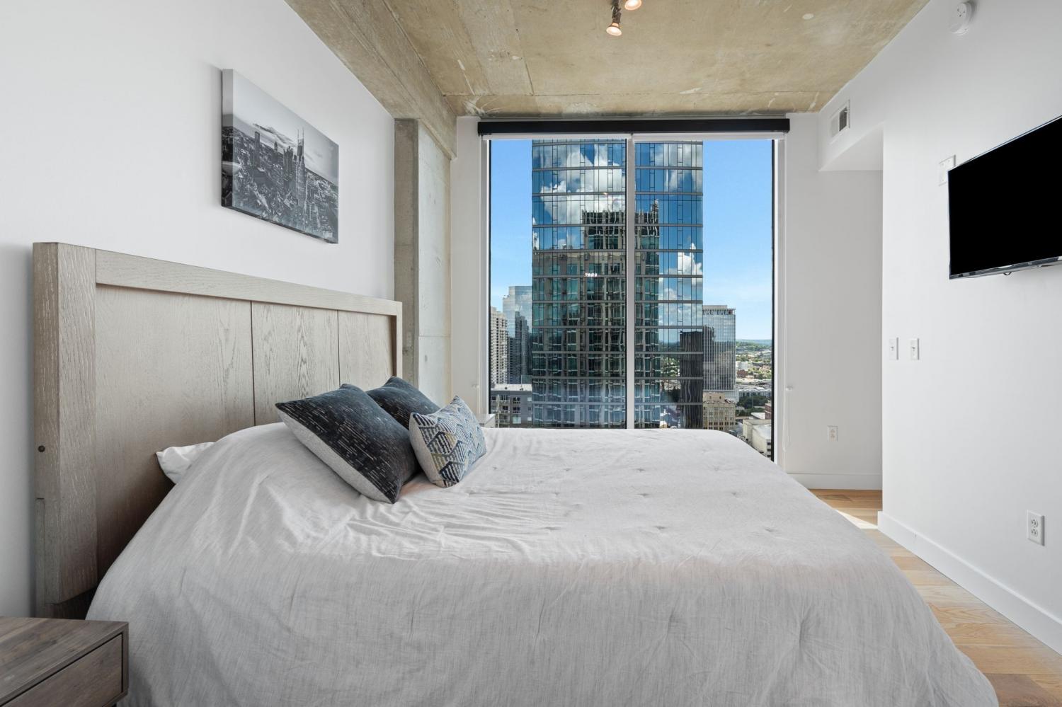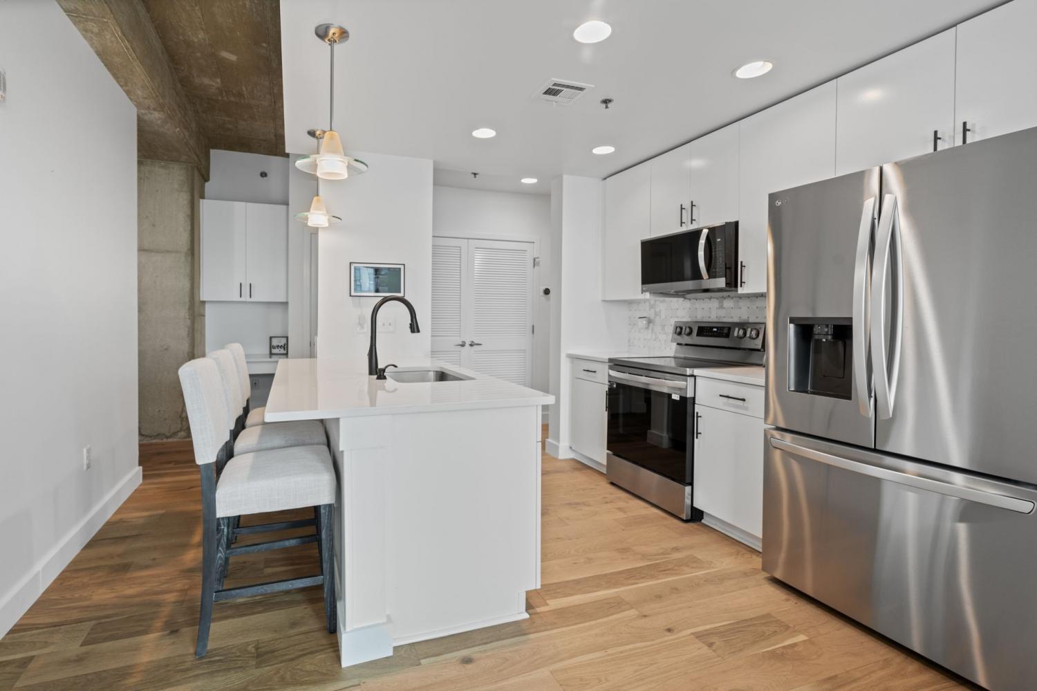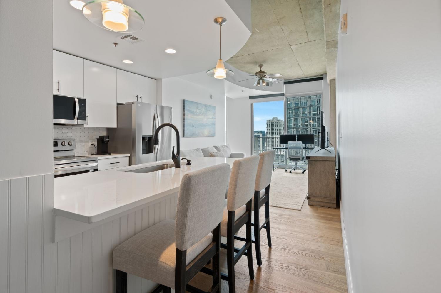 Up in the clouds sits unit 2504 in the Viridian. This west facing unit overlooks the historic church next door and has amazing views of the skyline looking due west, north and south. Just steps from Broadway, the Nashville Predators arena and Printers Alley, come see what this unit has to offer. Recent renovations including fresh paint, elegant light hardwood floors, one level quartz countertops with bar top seating and farm sink, brand-new state of the art stainless steel LG appliances, new custom blinds, Nest thermostat, custom-built closets, new tile in bathroom, and a convenient desk space, plus washer & dryer. New water heater in 2021. 24/7 security and concierge, rooftop pool, workout room and club room on 31st floor. 1 deeded parking space.