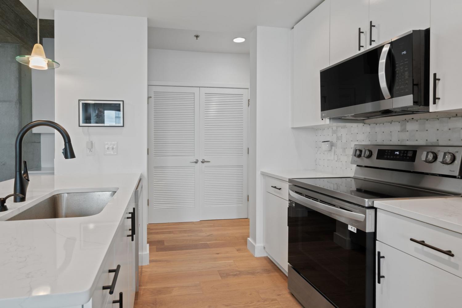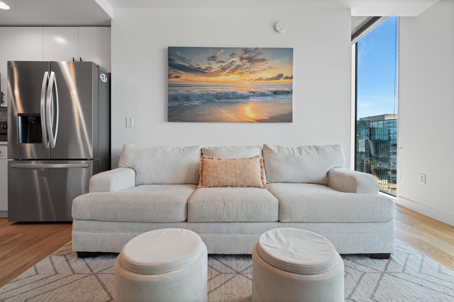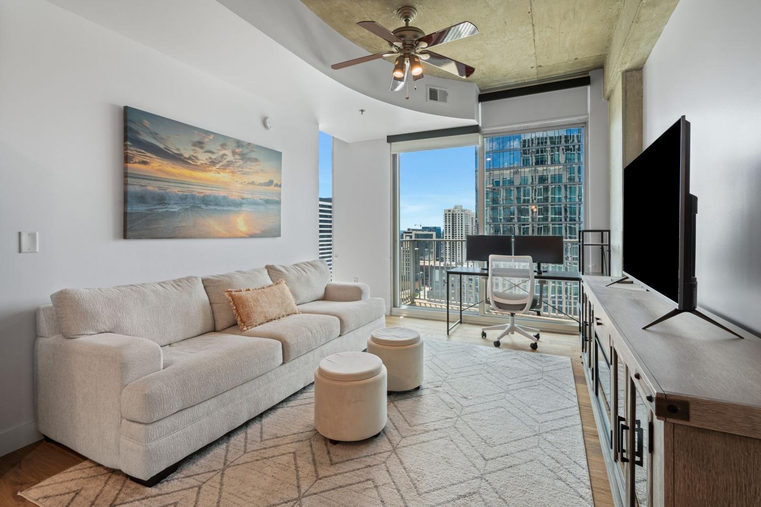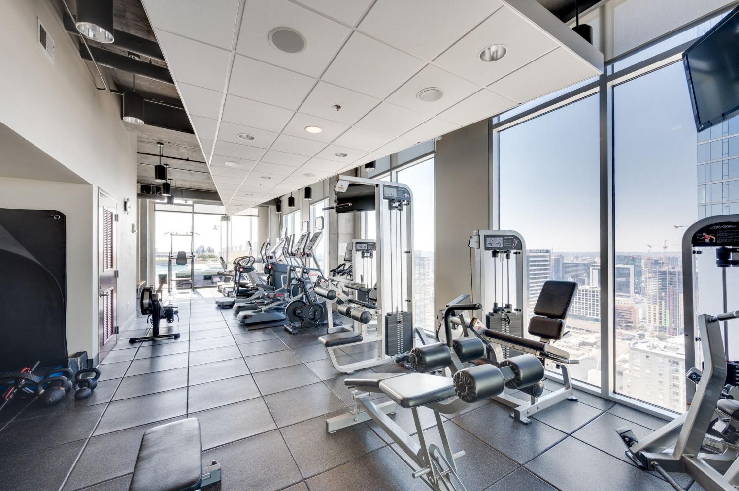 Up in the clouds sits unit 2504 in the Viridian. This west facing unit overlooks the historic church next door and has amazing views of the skyline looking due west, north and south. Just steps from Broadway, the Nashville Predators arena and Printers Alley, come see what this unit has to offer. Recent renovations including fresh paint, elegant light hardwood floors, one level quartz countertops with bar top seating and farm sink, brand-new state of the art stainless steel LG appliances, new custom blinds, Nest thermostat, custom-built closets, new tile in bathroom, and a convenient desk space, plus washer & dryer. New water heater in 2021. 24/7 security and concierge, rooftop pool, workout room and club room on 31st floor. 1 deeded parking space.
