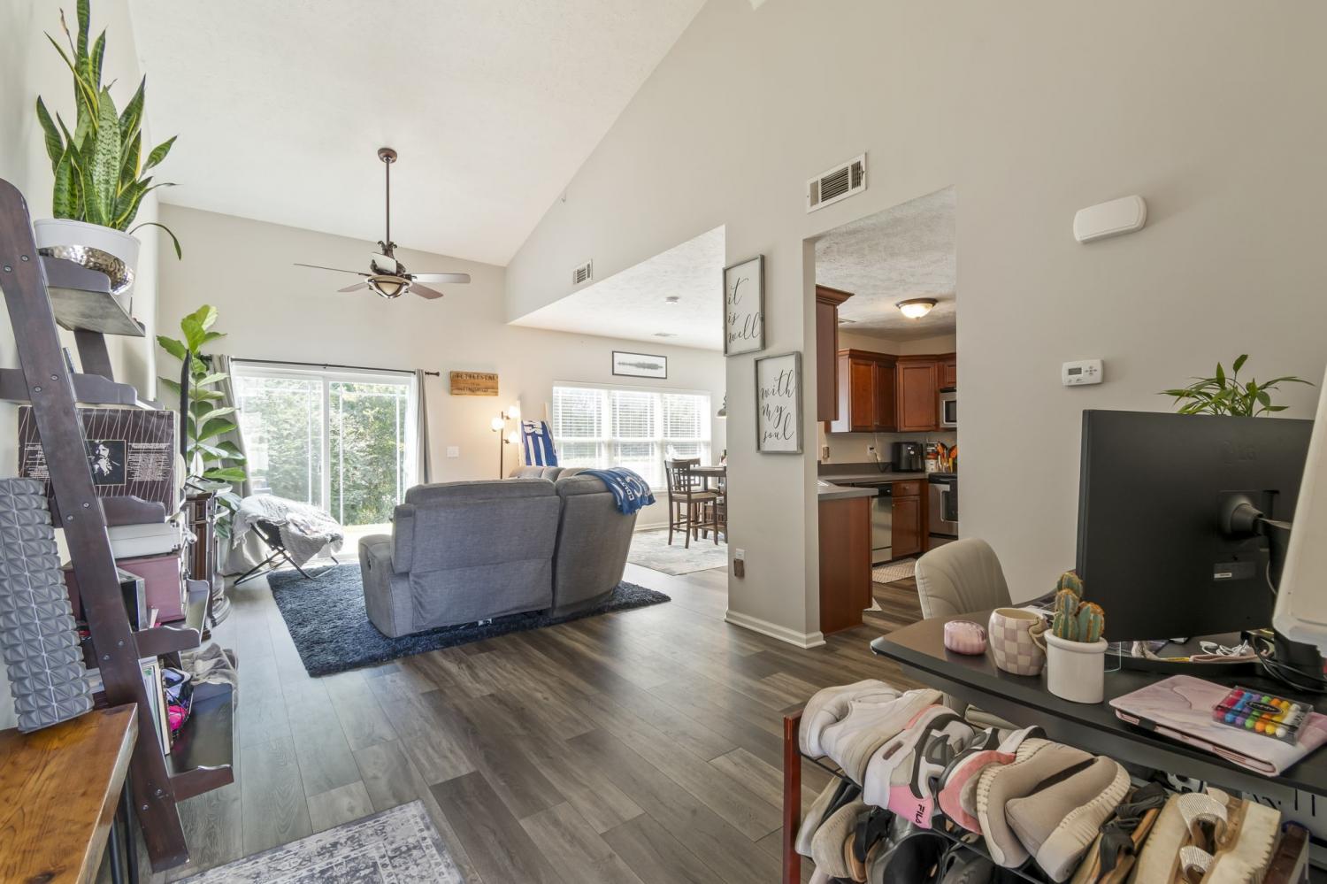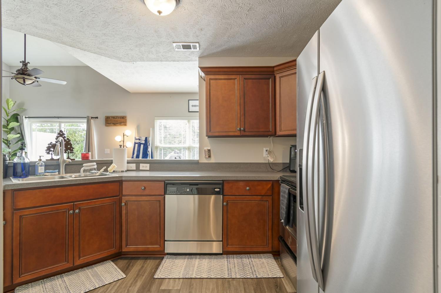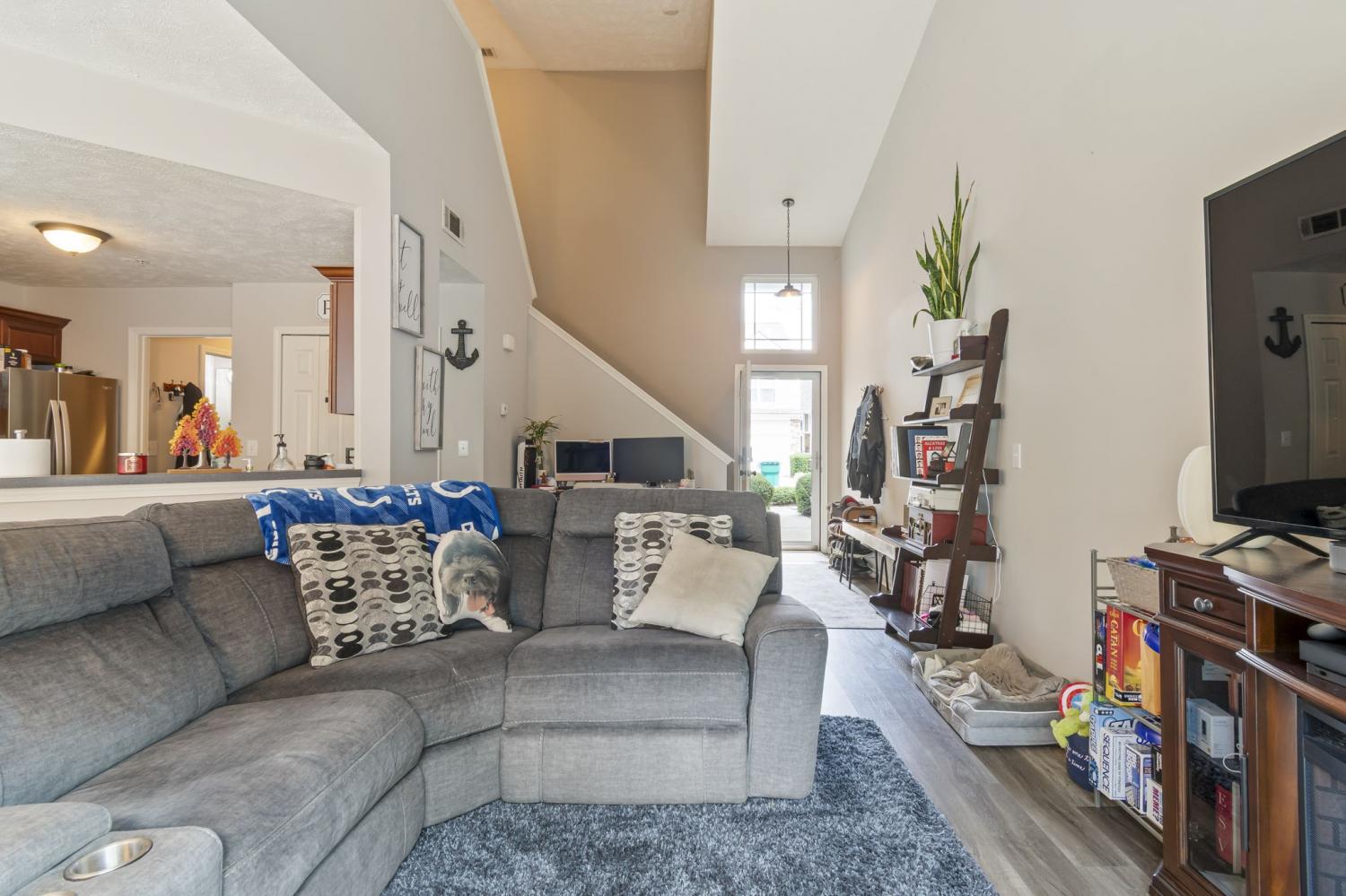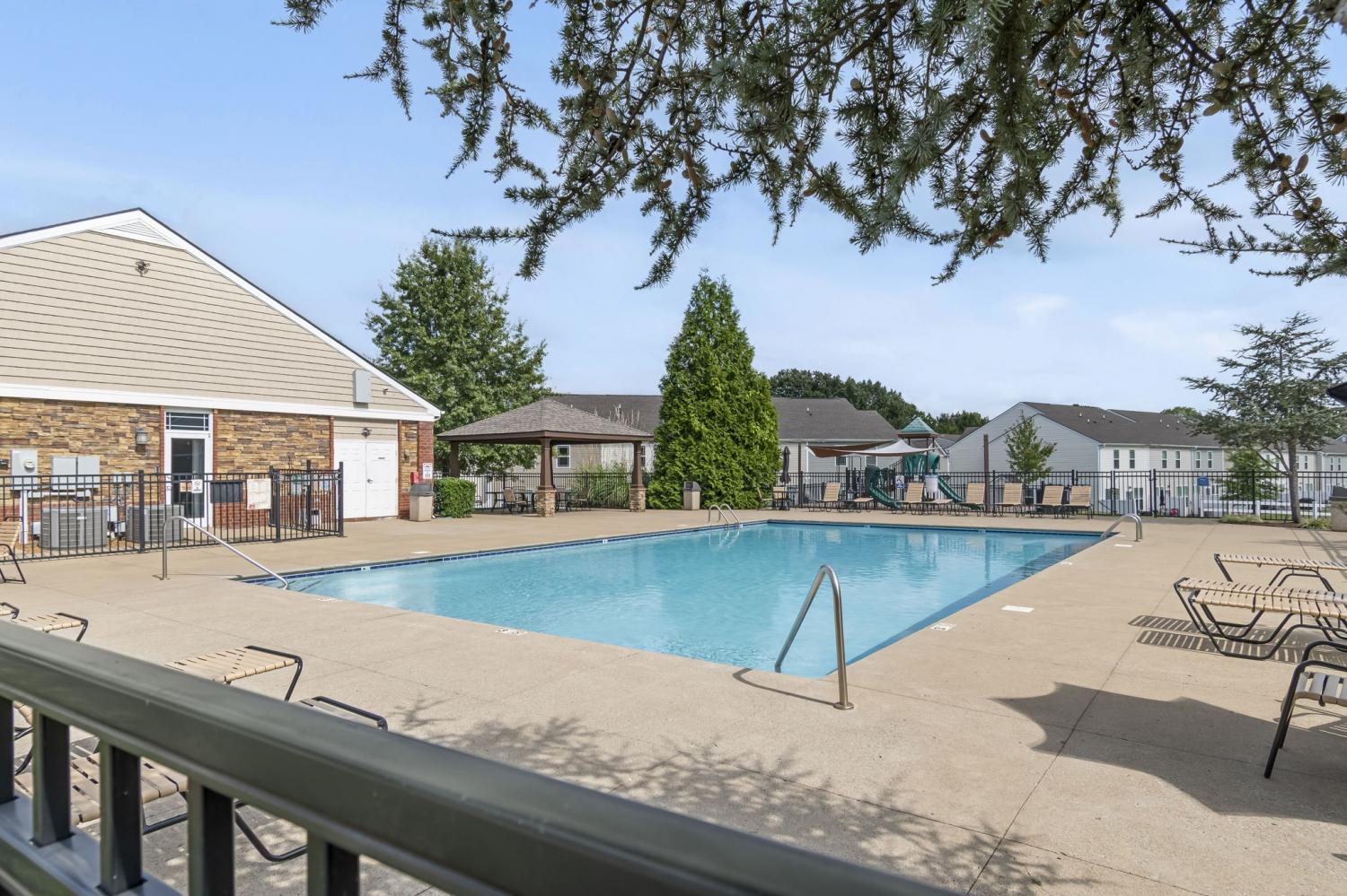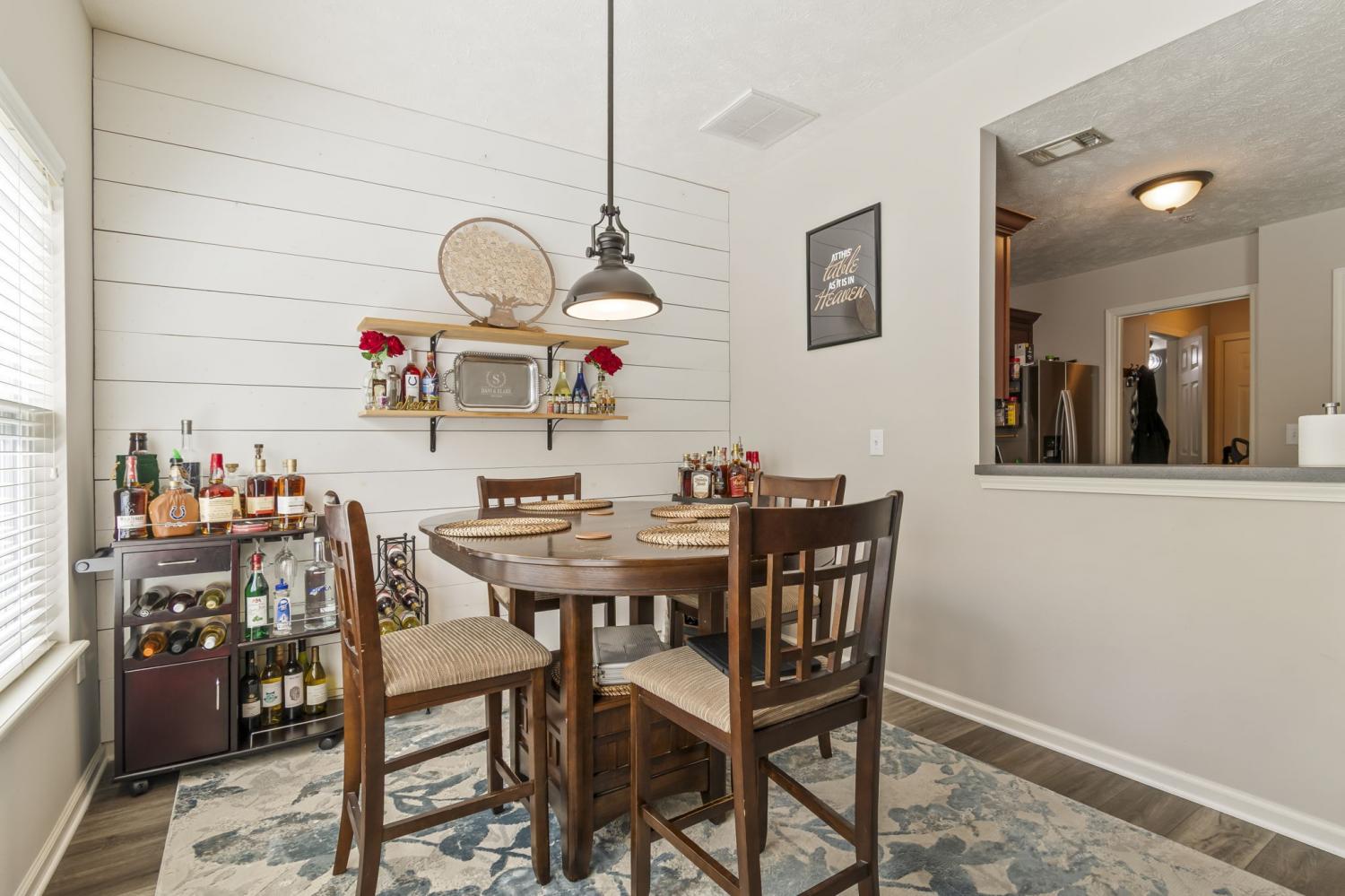 Beautiful, modern Spring Hill, TN Townhome! This home boasts vaulted ceilings, stainless steel appliances, and a back patio that backs up to a wooded area - perfect for private mornings or evening entertaining. This model is the Belden Floorplan which is an open concept, 2 bed, 2.5 bath home, and it feels so spacious and inviting. Shiplap in dining area adds a feature wall and new floors on main level bring this model up to date. Soaking tub and separate shower in primary. Lots of natural light. Well maintained. Located right across from the pool/gym/clubhouse for convenience, this well maintained property is perfect as a starter home, right size home or downsize. Large two car garage and wide closets are ideal for storage. Don't miss this opportunity to get into this community!