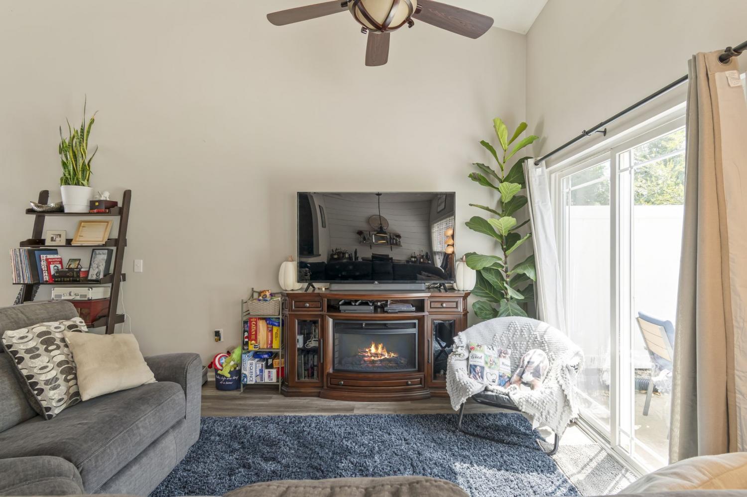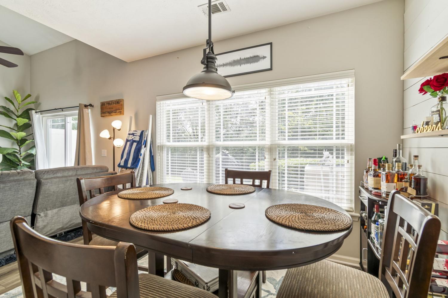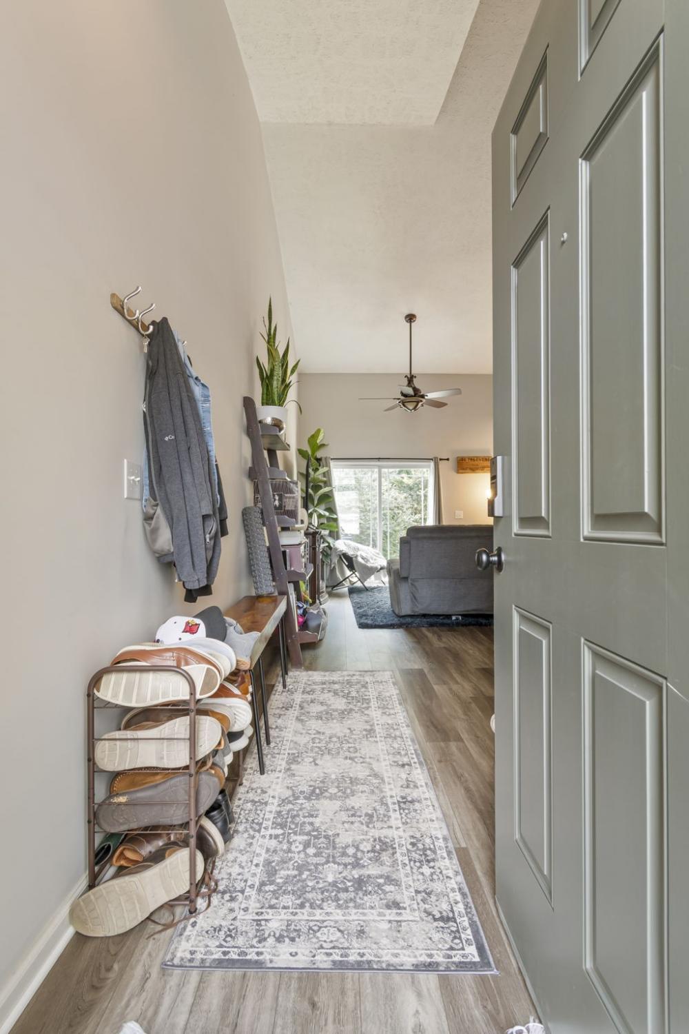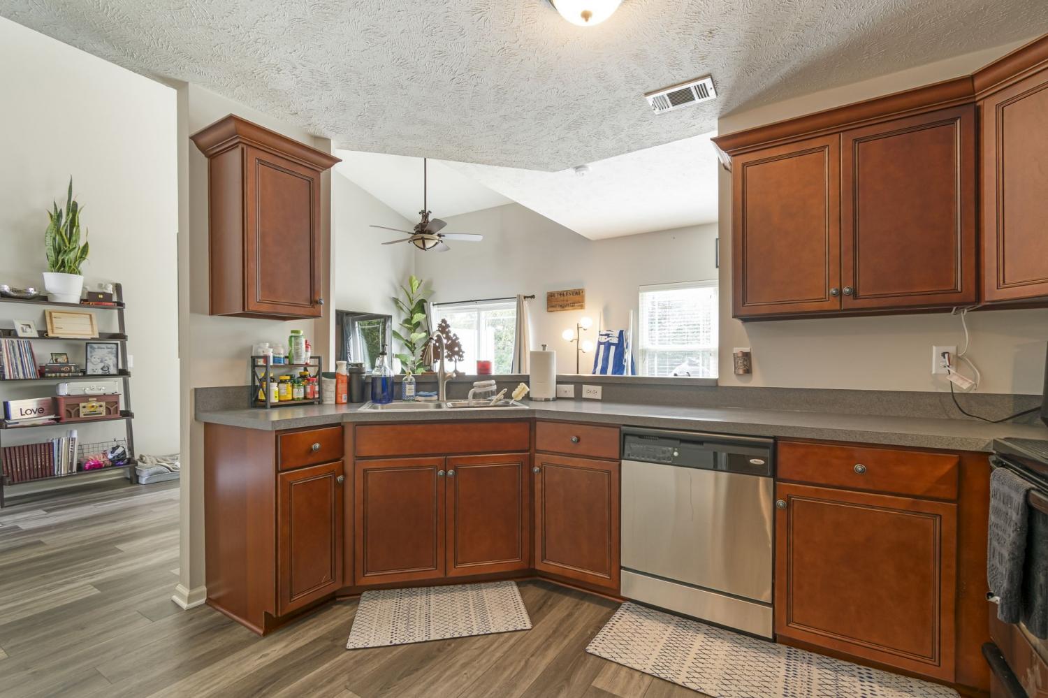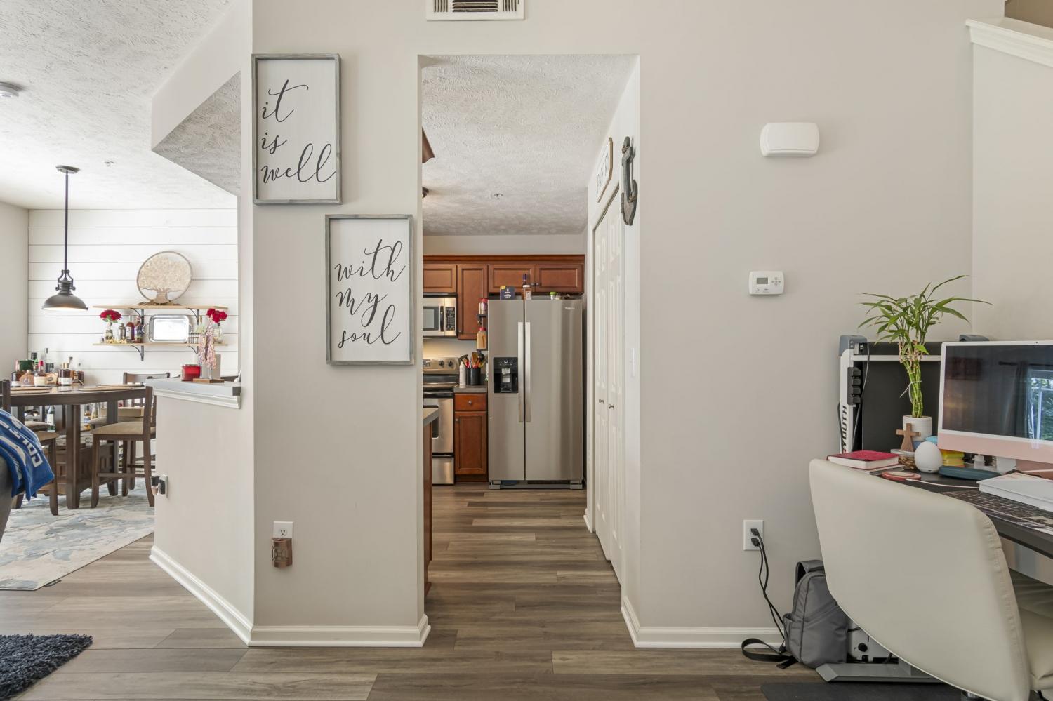 Beautiful, modern Spring Hill, TN Townhome! This home boasts vaulted ceilings, stainless steel appliances, and a back patio that backs up to a wooded area - perfect for private mornings or evening entertaining. This model is the Belden Floorplan which is an open concept, 2 bed, 2.5 bath home, and it feels so spacious and inviting. Shiplap in dining area adds a feature wall and new floors on main level bring this model up to date. Soaking tub and separate shower in primary. Lots of natural light. Well maintained. Located right across from the pool/gym/clubhouse for convenience, this well maintained property is perfect as a starter home, right size home or downsize. Large two car garage and wide closets are ideal for storage. Don't miss this opportunity to get into this community!