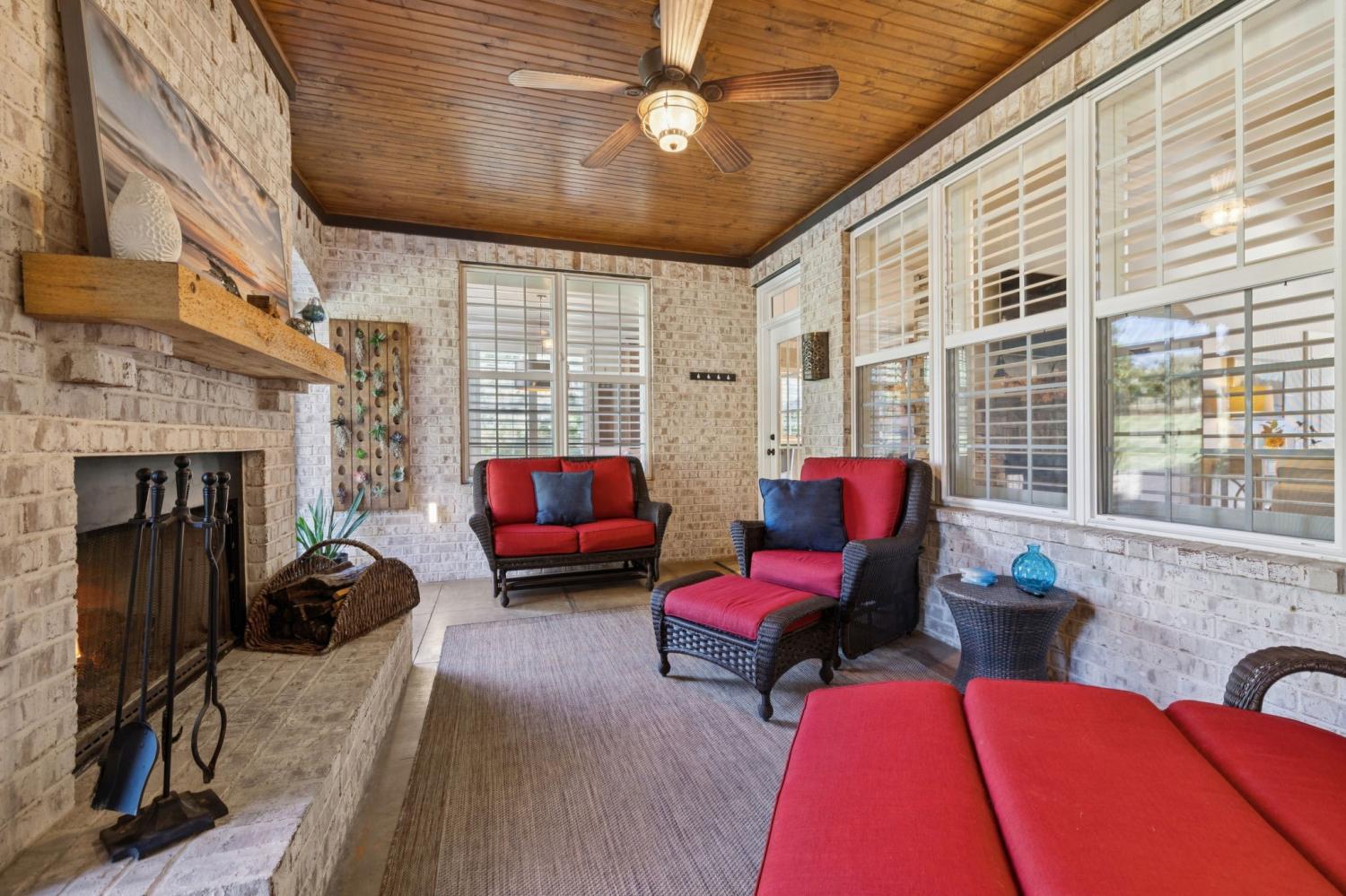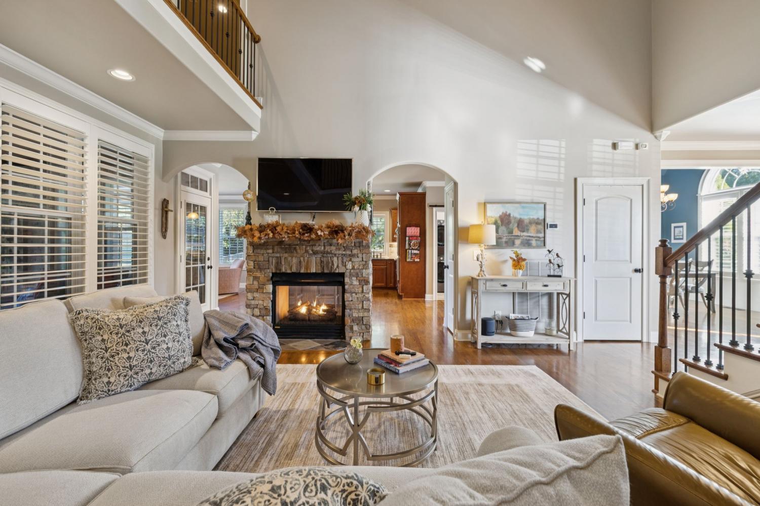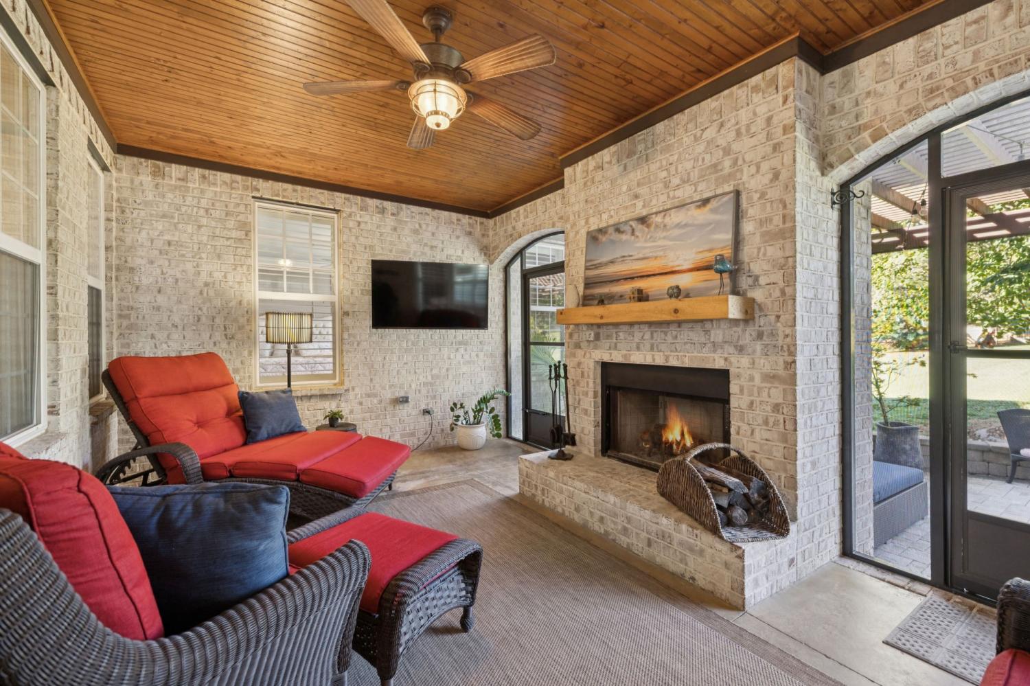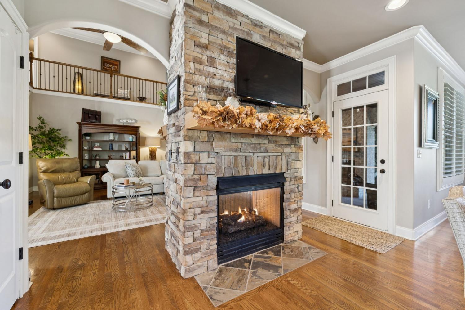 Experience timeless elegance in this exquisite French Country estate offering 3861 sq. ft. of refined living. Thoughtfully designed with 4 bedrooms and 3.5 baths, this residence blends architectural beauty with modern sophistication. The first-floor primary suite is a private retreat with a spa-inspired ensuite. A dedicated space for a home office offers the perfect work-from-home sanctuary. The heart of the home features soaring spaces, a warm fireplace, gleaming hardwood floors, and plantation shutters throughout the main level. The gourmet kitchen is designed for both culinary artistry and entertaining, with granite countertops, double ovens, and custom finishes. Upstairs, a media room and expansive bonus room provide the ultimate spaces for leisure and entertainment. An oversized three-car garage is a luxury in itself, offering built-in cabinetry, heavy-duty shelving, a storm shelter, and an RV plug outside for convenience. Additional high-end features include a central vacuum system and a whole-home circuit breaker designed to protect valuable electronics. Outdoors, sophistication continues with a screened patio and fireplace overlooking the property, as well as an inviting courtyard-style patio with pergola and tranquil water features—perfect for gatherings or quiet evenings. Blending European-inspired architecture with modern amenities, this remarkable residence offers a lifestyle of luxury, comfort, and peace of mind.