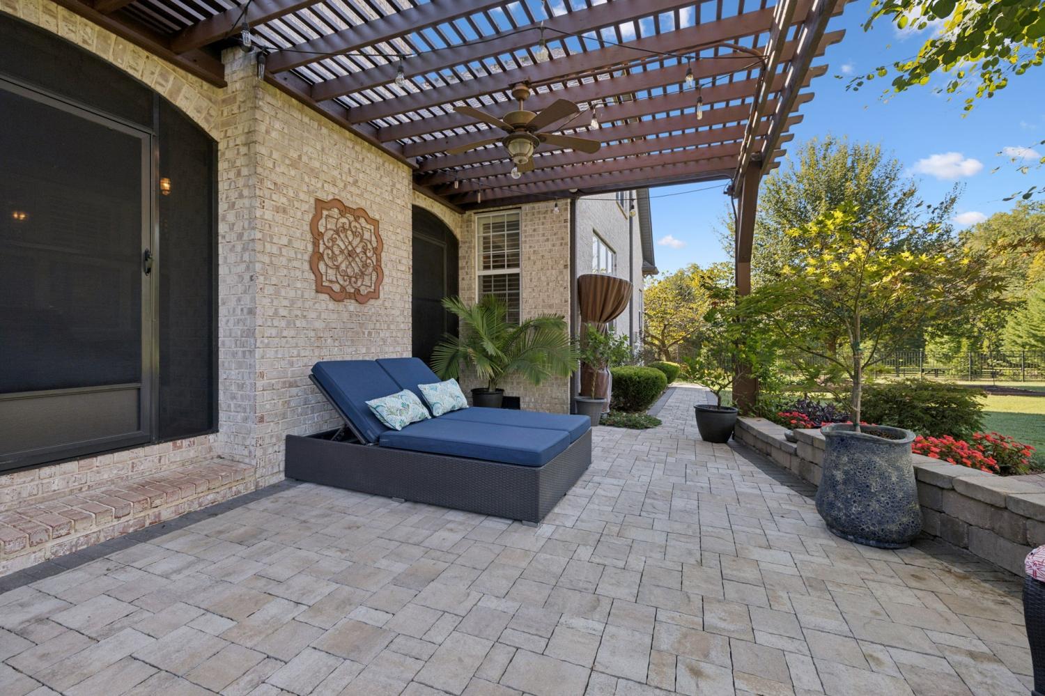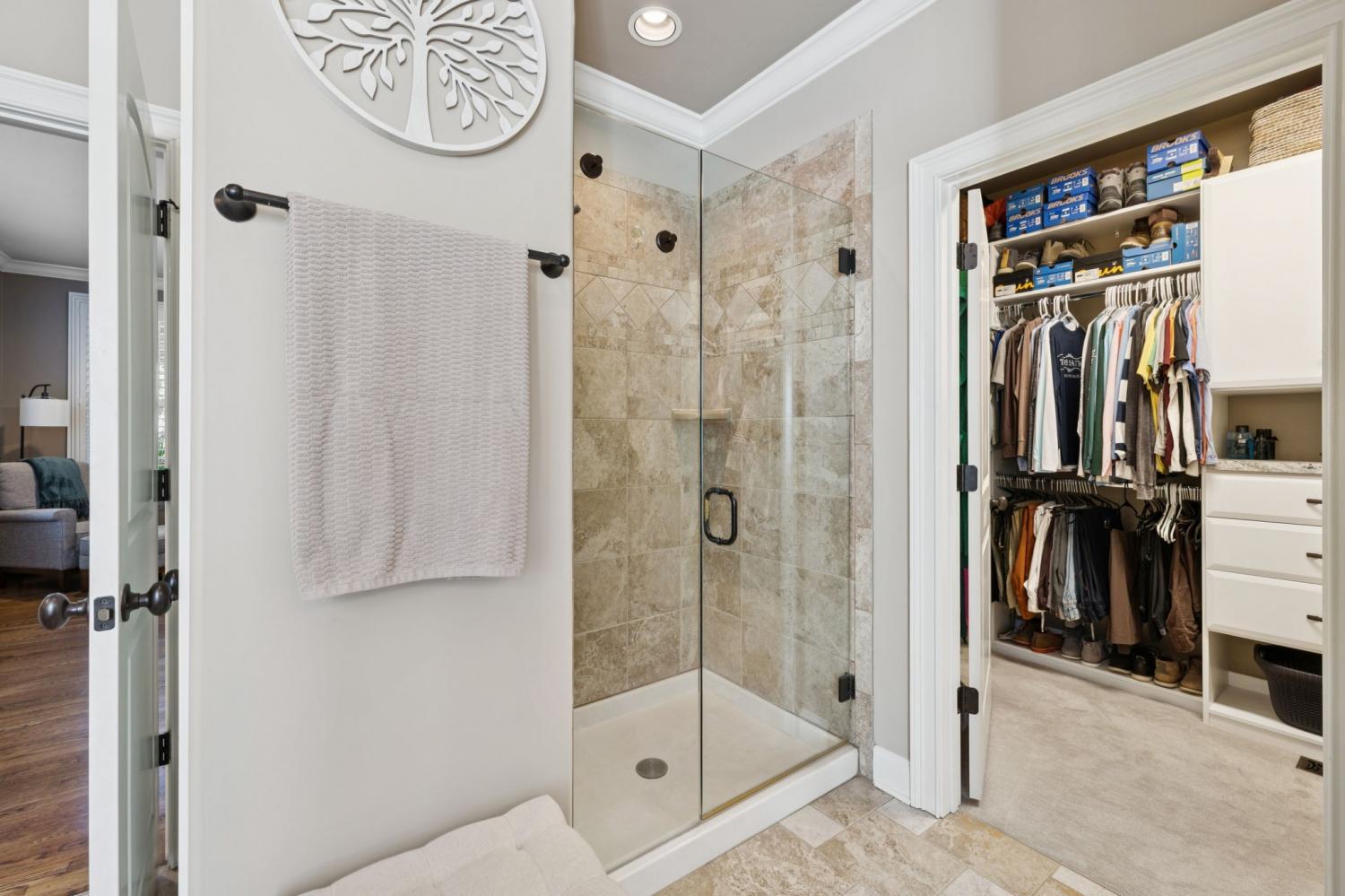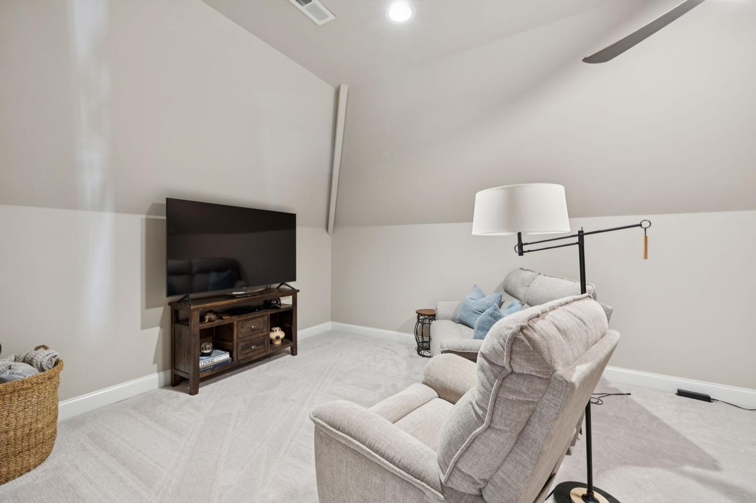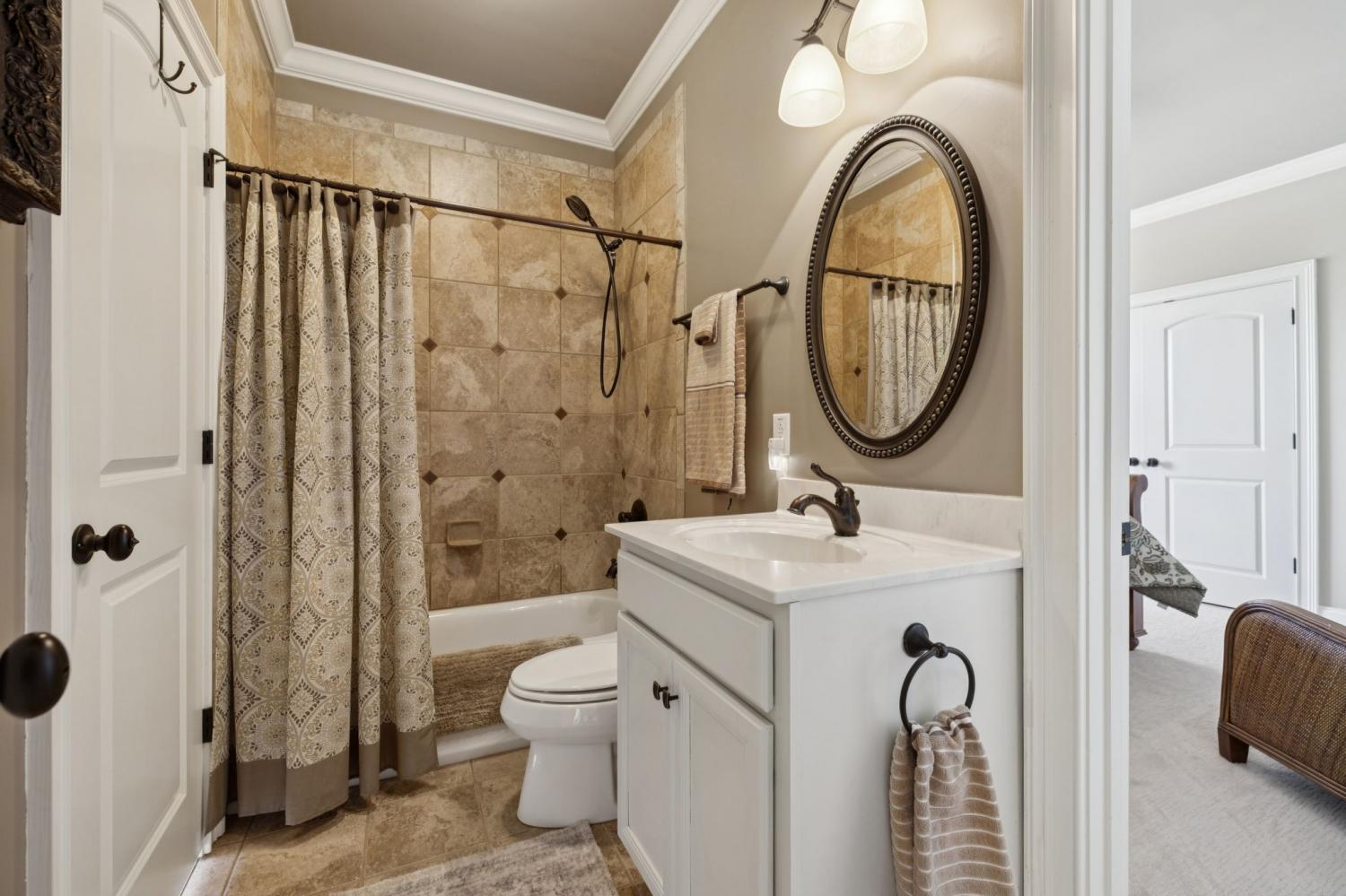 Experience timeless elegance in this exquisite French Country estate offering 3861 sq. ft. of refined living. Thoughtfully designed with 4 bedrooms and 3.5 baths, this residence blends architectural beauty with modern sophistication. The first-floor primary suite is a private retreat with a spa-inspired ensuite. A dedicated space for a home office offers the perfect work-from-home sanctuary. The heart of the home features soaring spaces, a warm fireplace, gleaming hardwood floors, and plantation shutters throughout the main level. The gourmet kitchen is designed for both culinary artistry and entertaining, with granite countertops, double ovens, and custom finishes. Upstairs, a media room and expansive bonus room provide the ultimate spaces for leisure and entertainment. An oversized three-car garage is a luxury in itself, offering built-in cabinetry, heavy-duty shelving, a storm shelter, and an RV plug outside for convenience. Additional high-end features include a central vacuum system and a whole-home circuit breaker designed to protect valuable electronics. Outdoors, sophistication continues with a screened patio and fireplace overlooking the property, as well as an inviting courtyard-style patio with pergola and tranquil water features—perfect for gatherings or quiet evenings. Blending European-inspired architecture with modern amenities, this remarkable residence offers a lifestyle of luxury, comfort, and peace of mind.