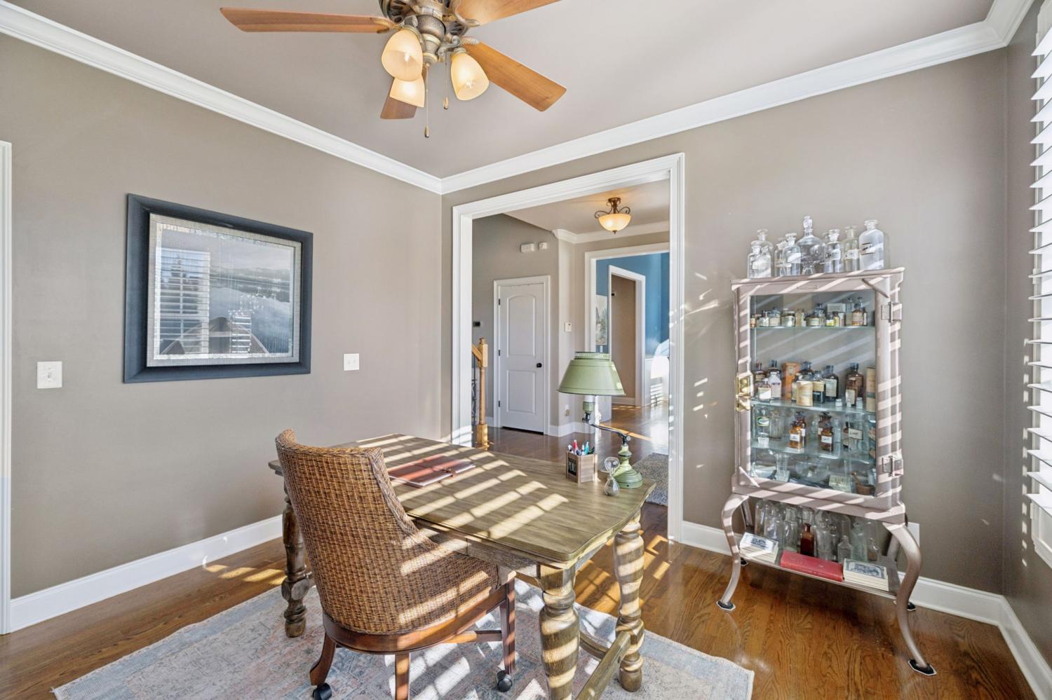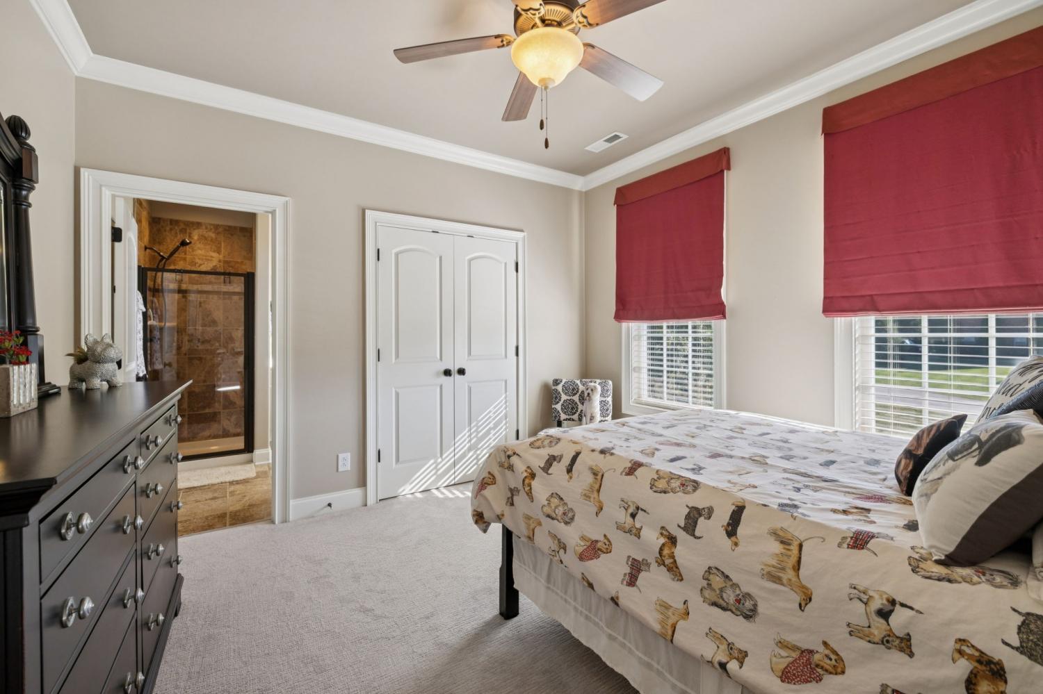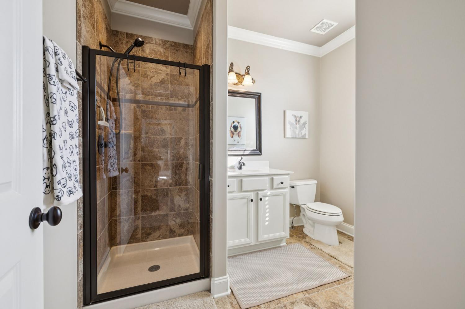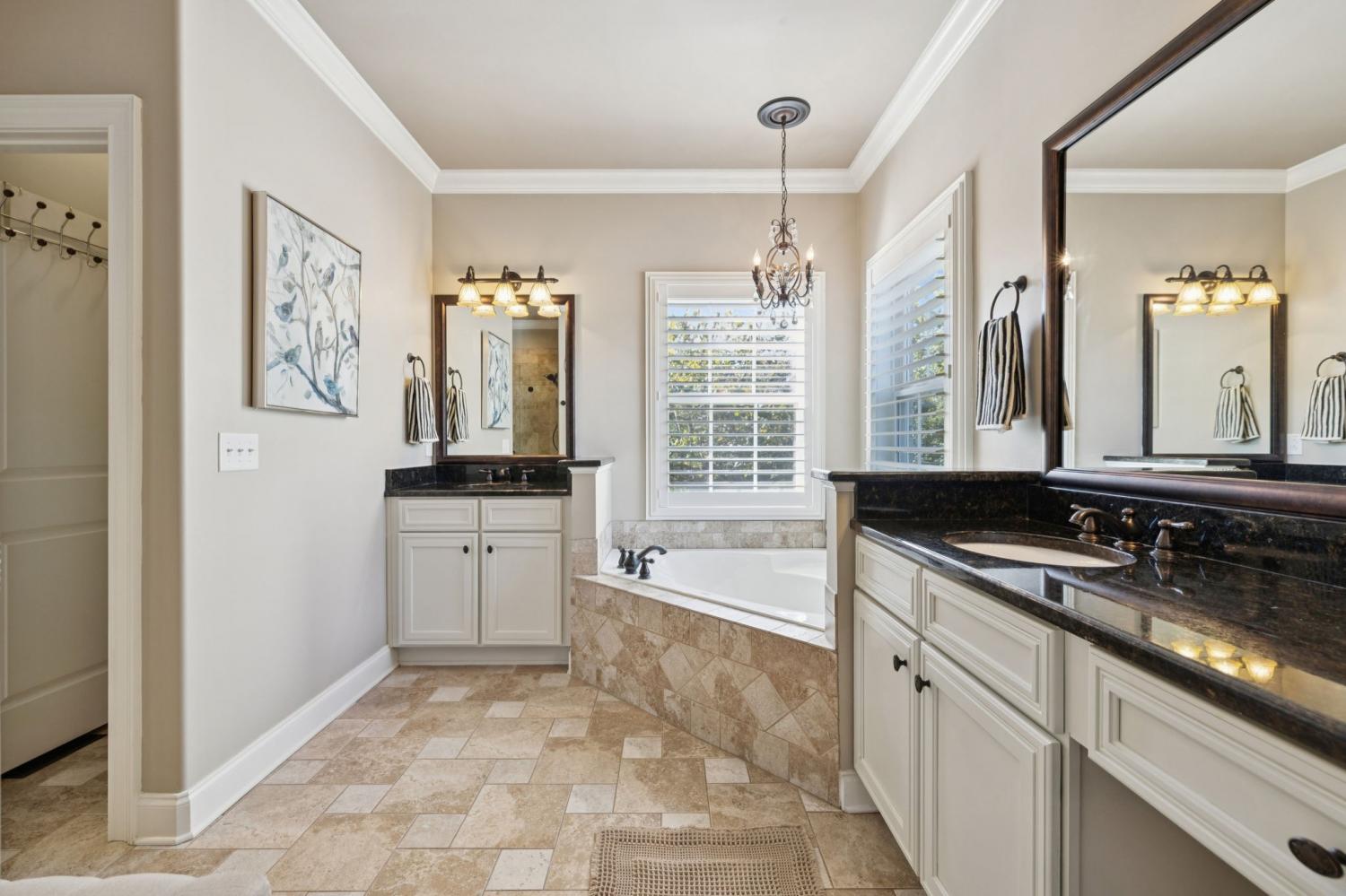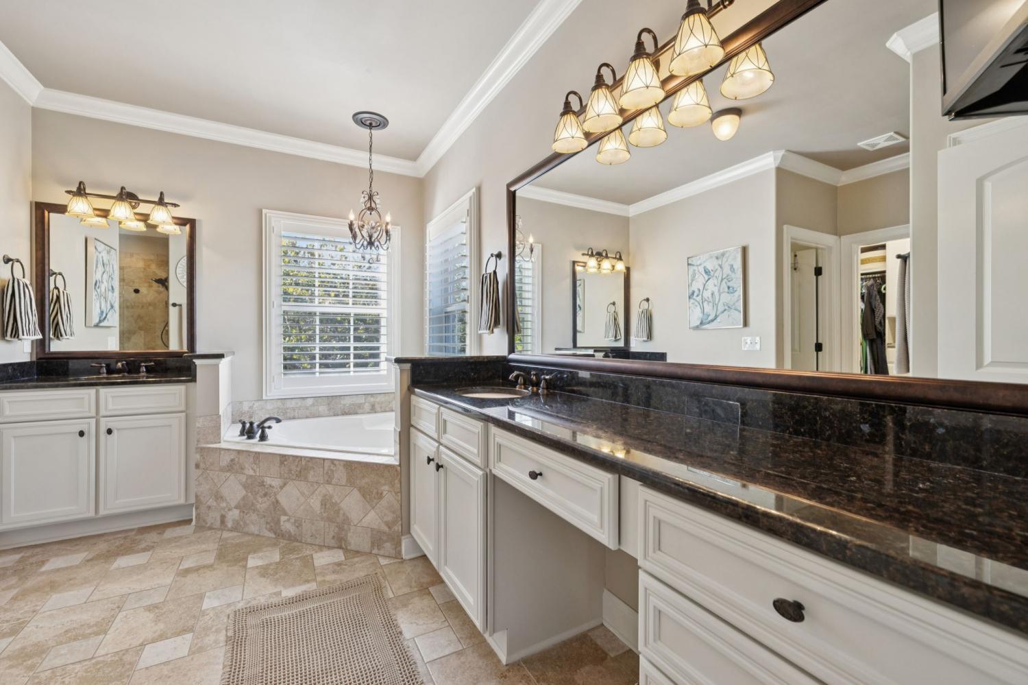 Experience timeless elegance in this exquisite French Country estate offering 3861 sq. ft. of refined living. Thoughtfully designed with 4 bedrooms and 3.5 baths, this residence blends architectural beauty with modern sophistication. The first-floor primary suite is a private retreat with a spa-inspired ensuite. A dedicated space for a home office offers the perfect work-from-home sanctuary. The heart of the home features soaring spaces, a warm fireplace, gleaming hardwood floors, and plantation shutters throughout the main level. The gourmet kitchen is designed for both culinary artistry and entertaining, with granite countertops, double ovens, and custom finishes. Upstairs, a media room and expansive bonus room provide the ultimate spaces for leisure and entertainment. An oversized three-car garage is a luxury in itself, offering built-in cabinetry, heavy-duty shelving, a storm shelter, and an RV plug outside for convenience. Additional high-end features include a central vacuum system and a whole-home circuit breaker designed to protect valuable electronics. Outdoors, sophistication continues with a screened patio and fireplace overlooking the property, as well as an inviting courtyard-style patio with pergola and tranquil water features—perfect for gatherings or quiet evenings. Blending European-inspired architecture with modern amenities, this remarkable residence offers a lifestyle of luxury, comfort, and peace of mind.