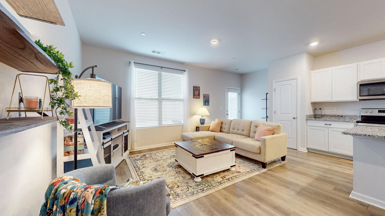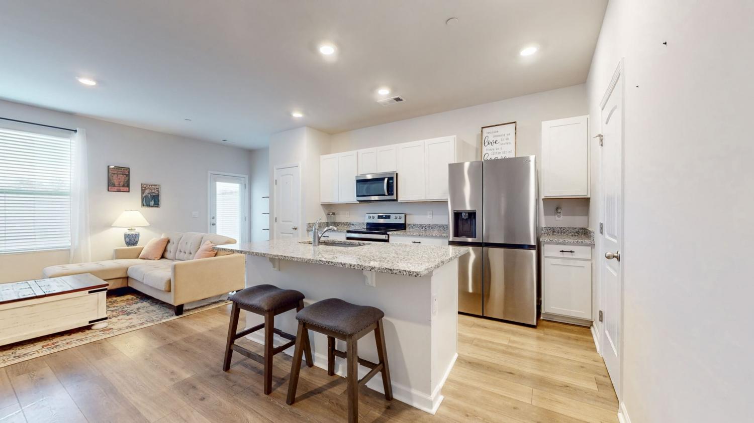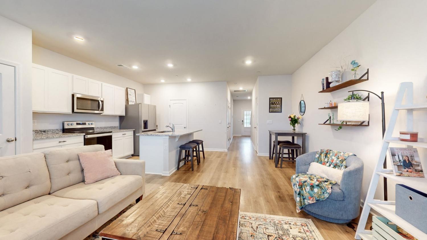 Welcome to 122 Champions Lane in the sought-after Sycamore Ridge community! This 3-bedroom, 2.5-bath townhome delivers modern style, open living, and unbeatable convenience - all under $300,000. Step inside to a bright foyer that flows into the spacious open-concept living and dining area. The kitchen steals the show with contemporary white cabinetry, granite countertops, a massive island with seating, and stainless appliances. Upstairs, all three bedrooms are tucked away for privacy. The primary suite feels like a retreat with its tray ceiling, double closets - including a walk-in and a spa-like bath with granite double vanity. Outside, enjoy your fenced backyard, perfect for pets or gatherings. Other perks include a one-car garage, laundry upstairs with washer/dryer included, and low-maintenance living. Incredible location: just 25 minutes to Nashville, 20 minutes to Clarksville, plus walkability to schools and local shops. Move-in ready, stylish, and priced to sell! SPECIAL closing incentives with Aimee Shell at Lending Hand Mortgage - call Whitley Smith for more information.
