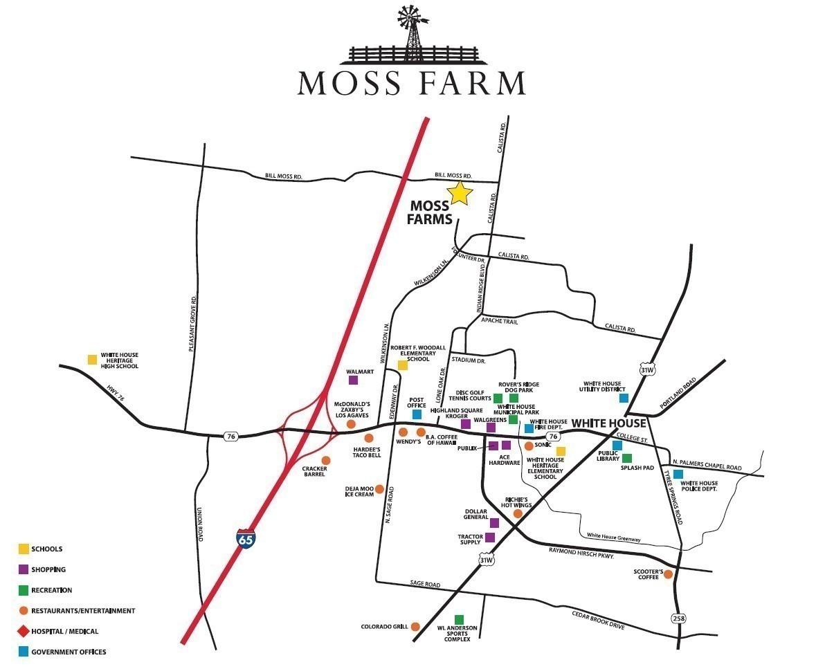 From Nashville take I-65 North toward Louisville for 18 miles, then take exit 108 to TN-76 E., and turn right onto TN-76 toward White House. Next turn left onto Wilkinson Ln., then turn left onto Calista Rd, and finally turn left onto Bill Moss Rd.