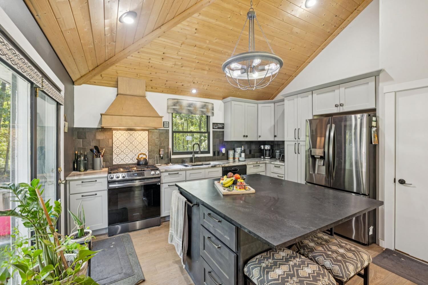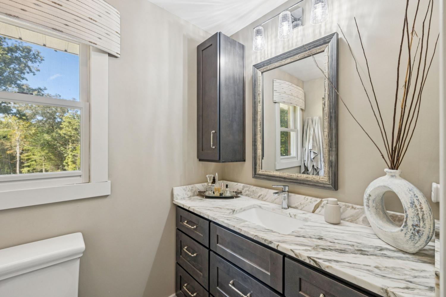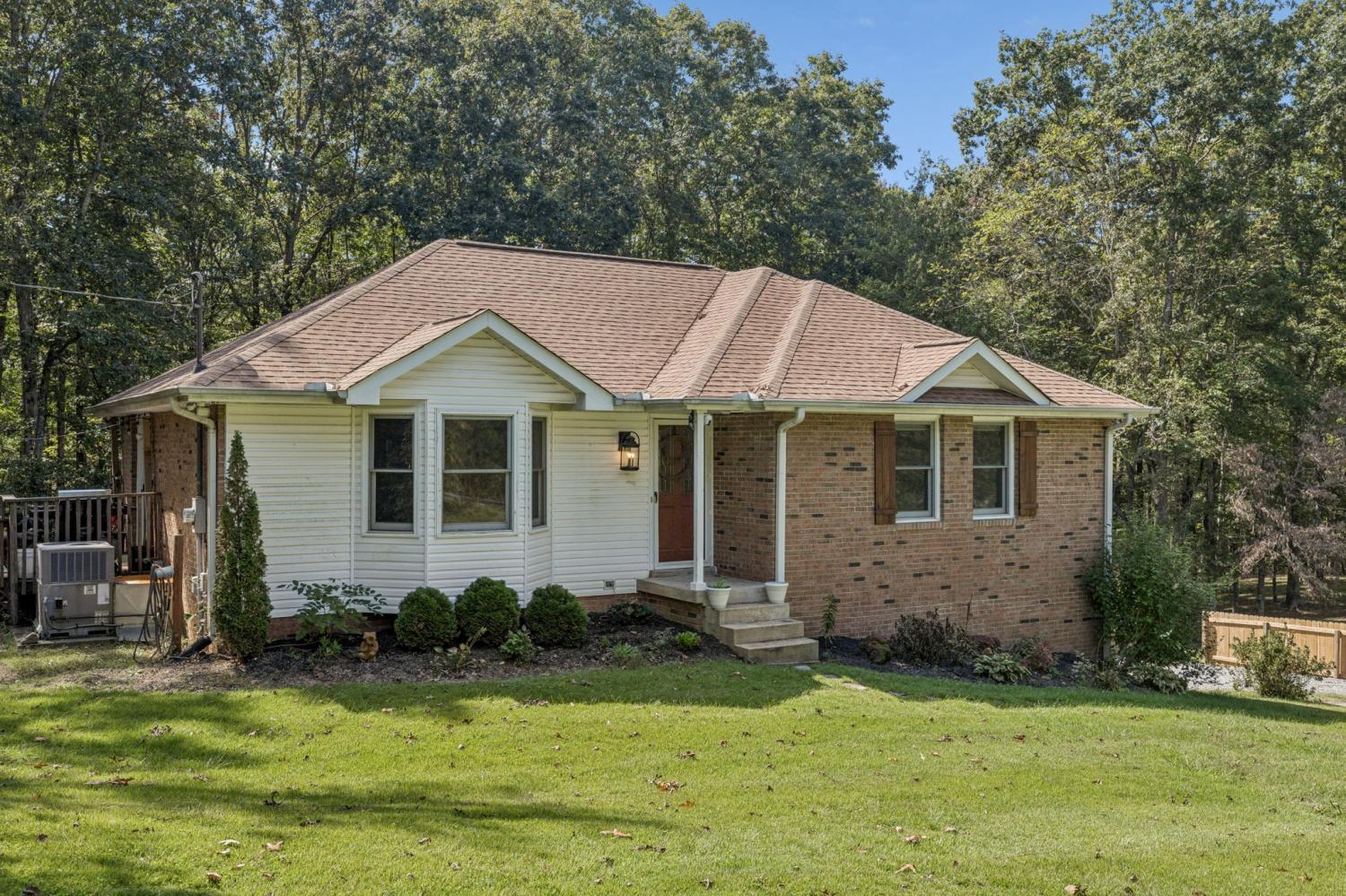 Charming brick home with full basement, located on a quiet cul de sac in an established, smaller neighborhood. Conveniently located just off of Hwy 100 in Lyles, TN on a lush, wooded 4.2 acred lot. Just minutes from Dickson, Fairview, Centerville and 840. This home has been completely renovated with high-end beautiful finishes. Fabulous new kitchen with a large island, built-in microwave drawer, pantry with roll-out drawers! All natural stone countertops throughout the home, raidiant floor heating in principal bathroom. 16 ft vaulted tongue and groove ceiling with wood beam in kitchen/family room - open concept. All new tile in bathrooms. Basement has a coal/woodburning stove and chimney that remains. Survey done in 2024 so lot is flagged and marked. Shed is negotiable! The 4 large lava rocks in the front landscaping and the stone dobermans at the garage DO NOT stay and are not negotiable. This home is move in ready! Seller travels for work so showings need to be scheduled several days in advance, if possible.