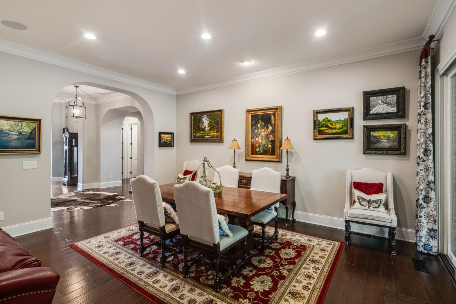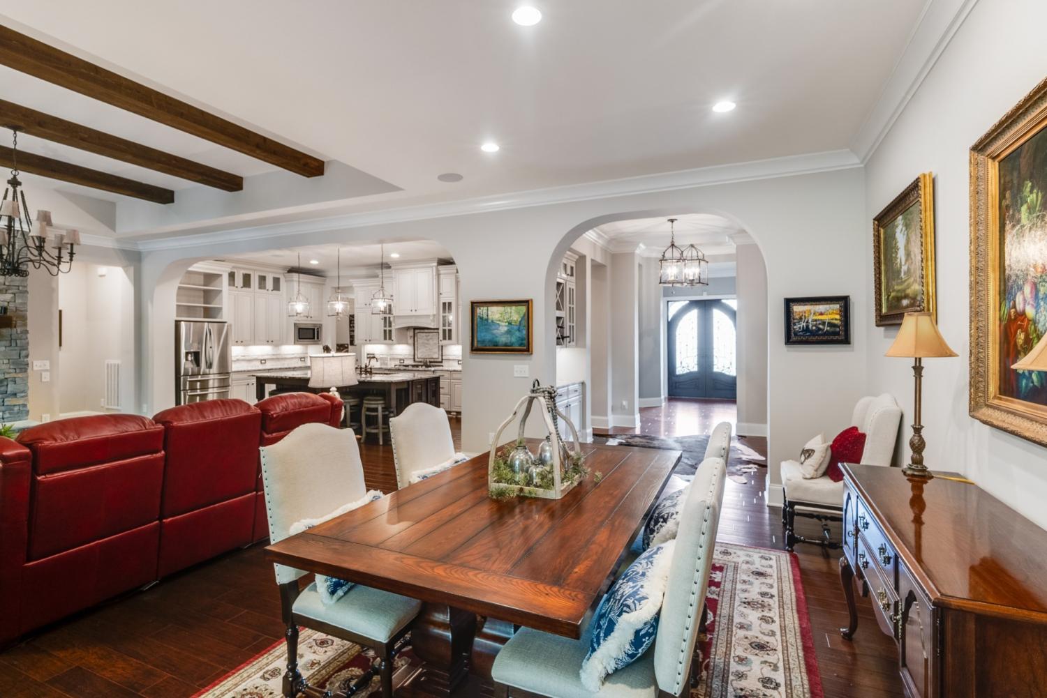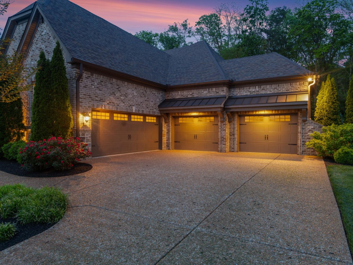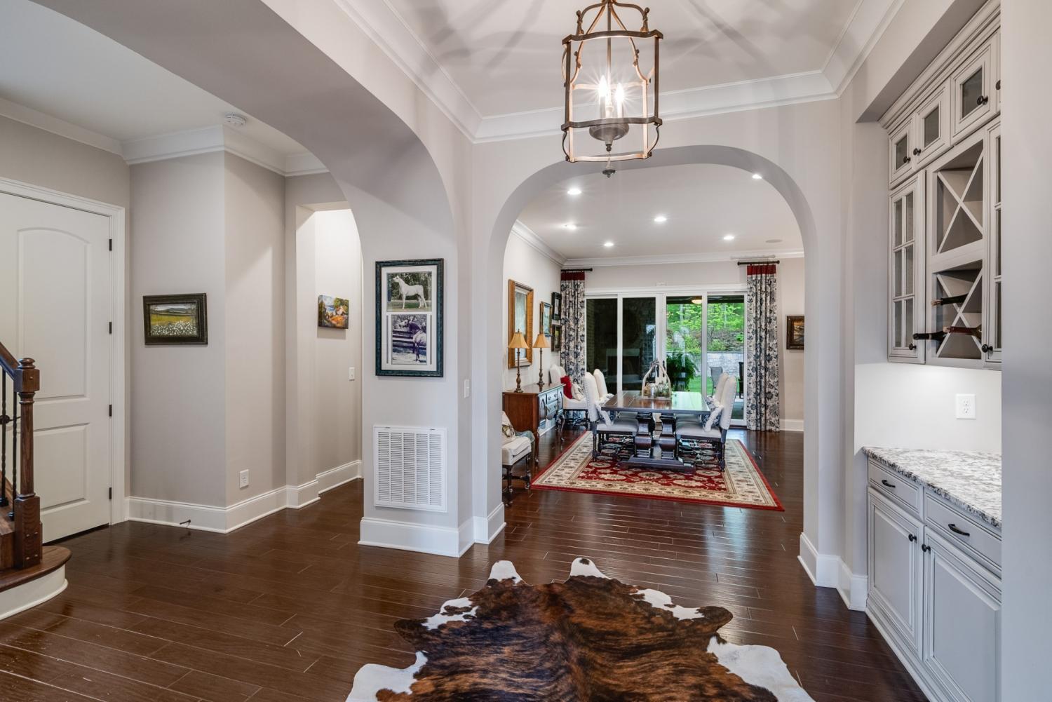 Exquisite estate in the gated community of Kings’ Chapel in Arrington, TN! Set on a premium cul-de-sac lot three times the size of a standard homesite, this 1.22-acre property was originally reserved by the developer for their personal residence—making it one of the most coveted lots in the community. Backing to a wooded area for maximum privacy, the professionally landscaped grounds combine luxury and serenity just minutes from Arrington Vineyards. Inside, the bright open floor plan showcases 10’ ceilings, 8’ doors, a dramatic stacked-stone fireplace with wood-beamed ceilings, and a chef’s kitchen with custom cabinetry, large island, and stainless appliances. The main level features two primary suites plus a private guest suite, a dedicated home office, and a formal dining room—ideal for both family living and entertaining. Outdoor living is elevated with an expansive covered porch complete with motorized screens, an inviting fireplace, and ample dining space overlooking the private backyard. Mature trees, a natural stone wall, and a tranquil rock fountain create a park-like setting rarely found in gated communities. Upstairs offers a versatile bonus room with wet bar and an additional bedroom suite, perfect for guests, hobbies, or recreation. A brand-new roof adds lasting value and peace of mind. Nestled on a quiet dead-end cul-de-sac street in one of Middle Tennessee’s most desirable gated neighborhoods, this rare property blends elegance, privacy, and comfort in an unmatched location.