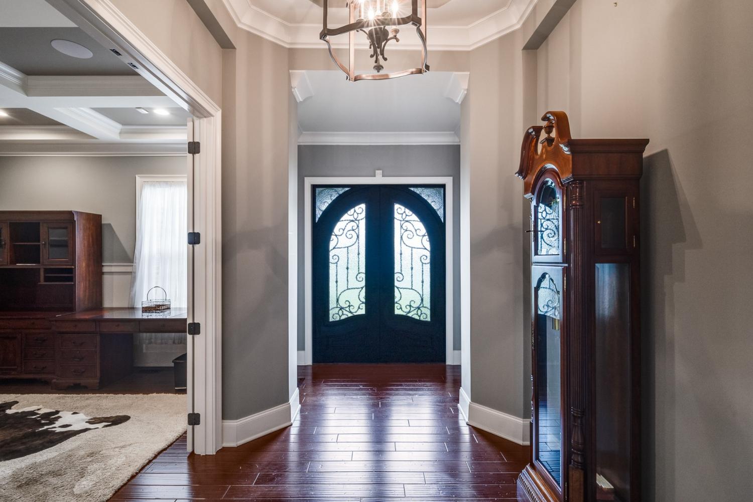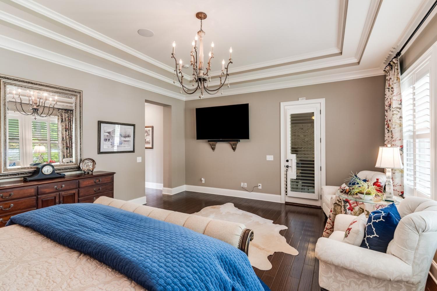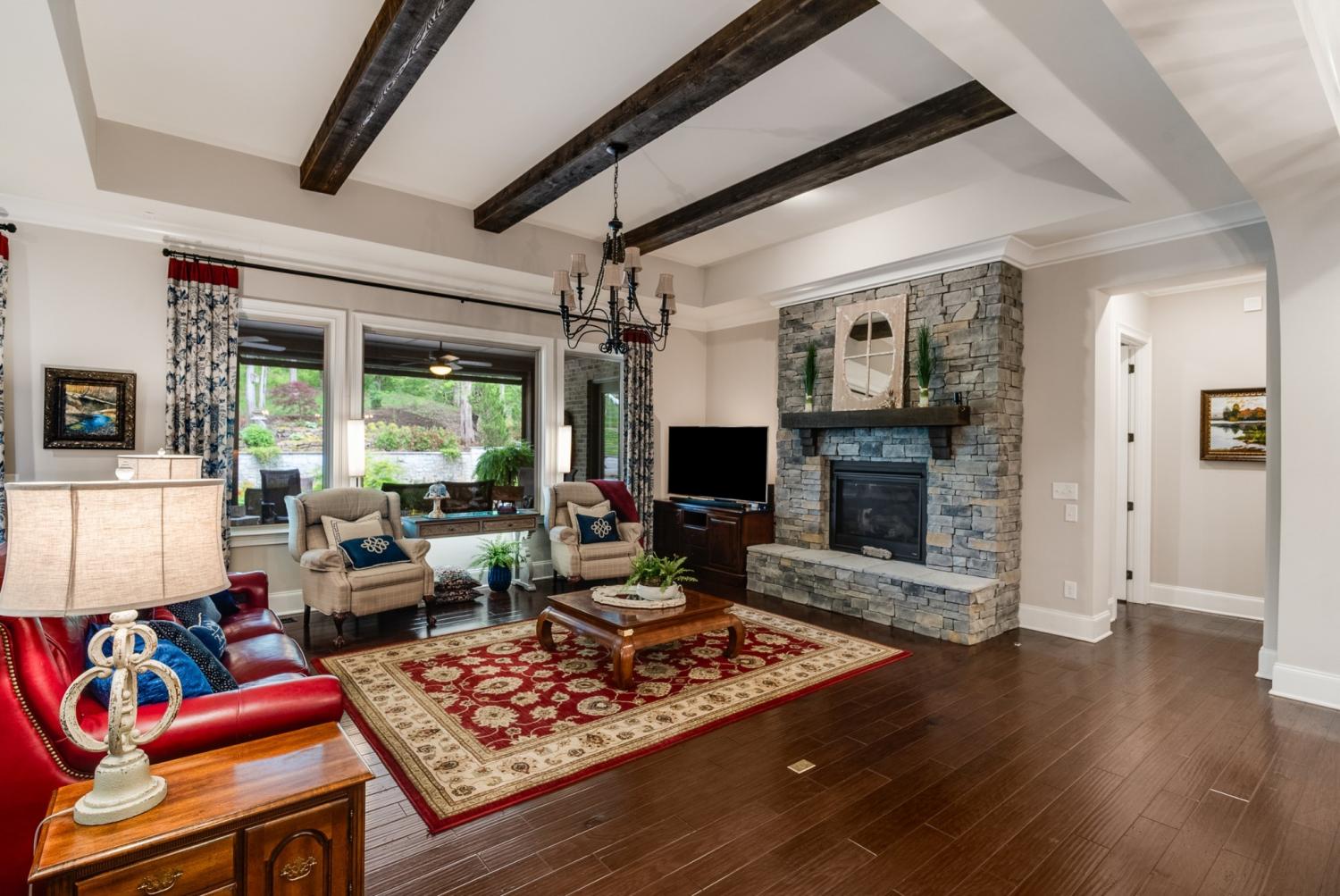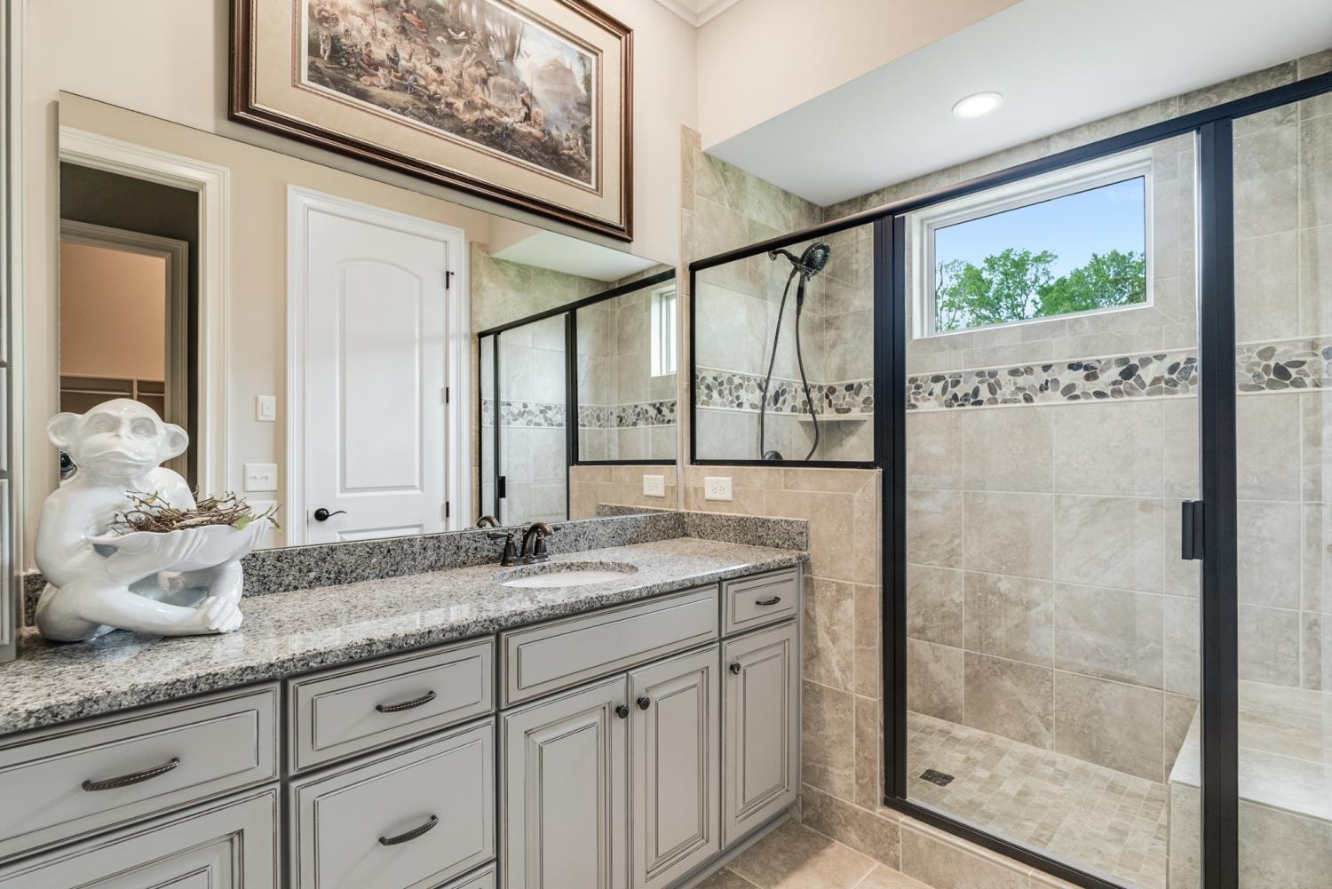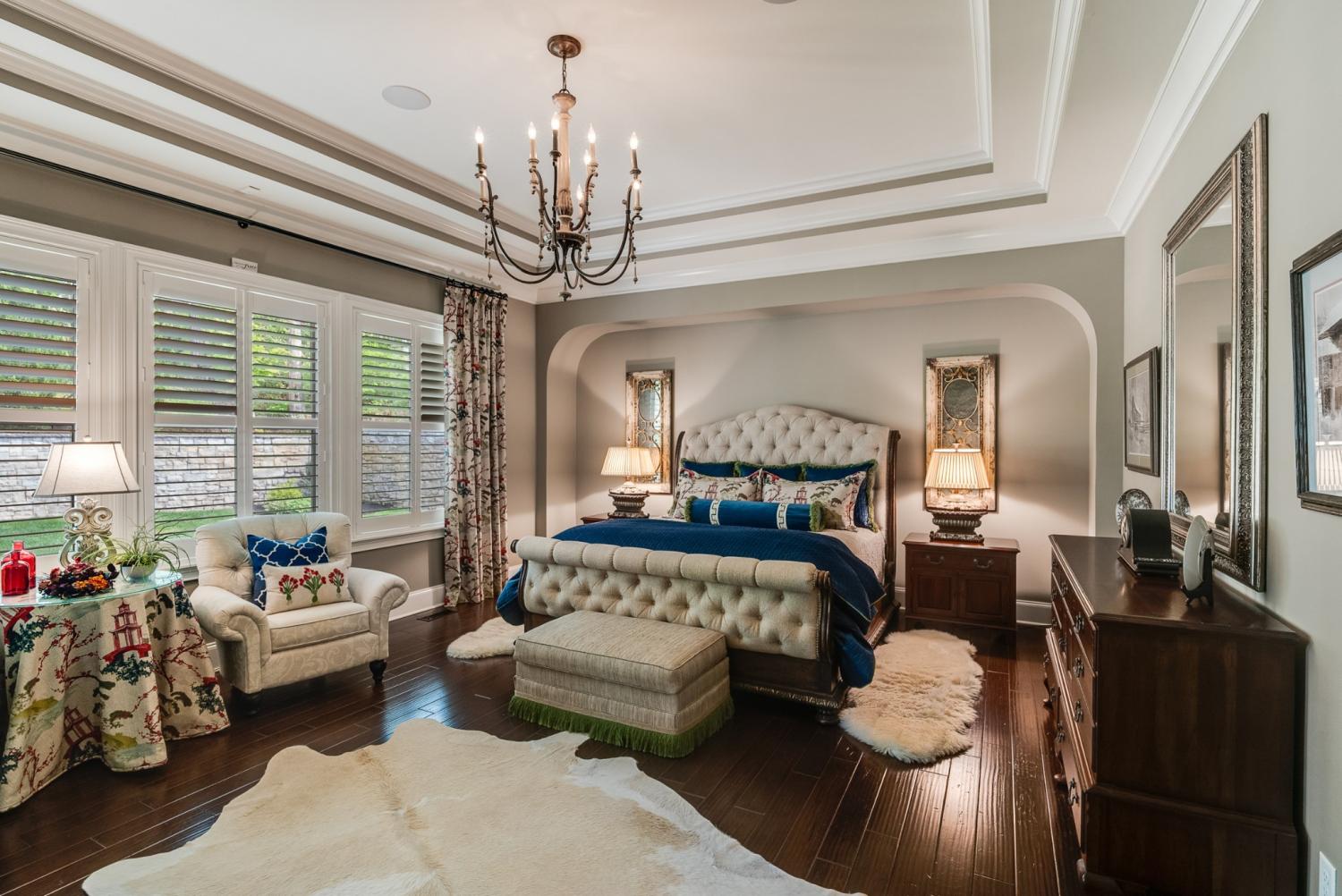Exquisite estate in the gated community of Kings’ Chapel in Arrington, TN! Set on a premium cul-de-sac lot three times the size of a standard homesite, this 1.22-acre property was originally reserved by the developer for their personal residence—making it one of the most coveted lots in the community. Backing to a wooded area for maximum privacy, the professionally landscaped grounds combine luxury and serenity just minutes from Arrington Vineyards. Inside, the bright open floor plan showcases 10’ ceilings, 8’ doors, a dramatic stacked-stone fireplace with wood-beamed ceilings, and a chef’s kitchen with custom cabinetry, large island, and stainless appliances. The main level features two primary suites plus a private guest suite, a dedicated home office, and a formal dining room—ideal for both family living and entertaining. Outdoor living is elevated with an expansive covered porch complete with motorized screens, an inviting fireplace, and ample dining space overlooking the private backyard. Mature trees, a natural stone wall, and a tranquil rock fountain create a park-like setting rarely found in gated communities. Upstairs offers a versatile bonus room with wet bar and an additional bedroom suite, perfect for guests, hobbies, or recreation. A brand-new roof adds lasting value and peace of mind. Nestled on a quiet dead-end cul-de-sac street in one of Middle Tennessee’s most desirable gated neighborhoods, this rare property blends elegance, privacy, and comfort in an unmatched location.