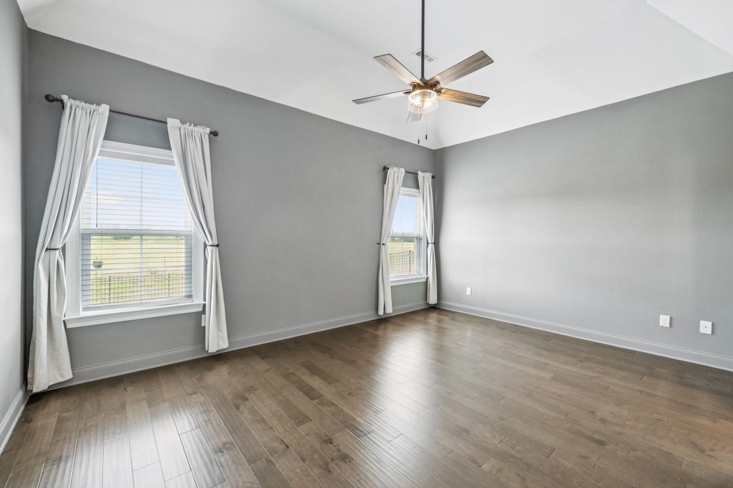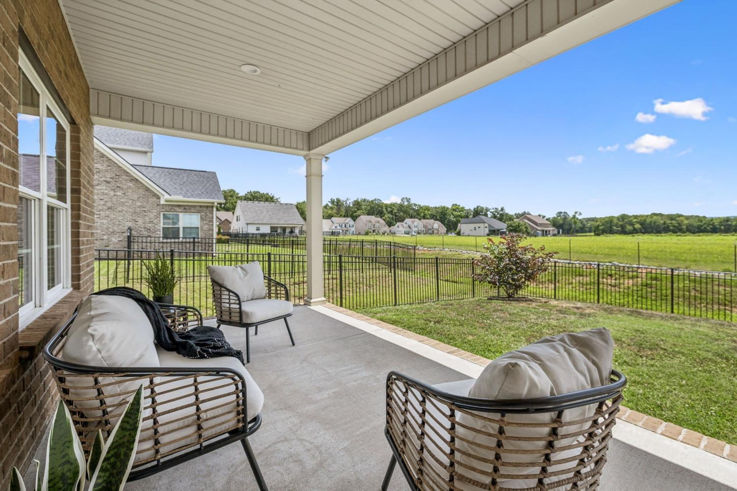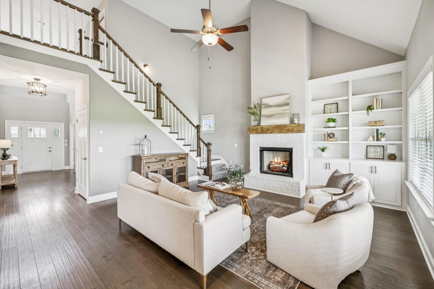 This beautifully designed 4-bedroom home offers a spacious layout and high-end finishes throughout. Primary bedroom and Owner's Suite on the main level. The chef’s kitchen features a large island, premium appliances, and flows seamlessly into the living area with gorgeous floors and a charming indoor brick gas fireplace. Upstairs, enjoy a generous bonus room and two oversized walk-in attics—ideal for storage or future expansion into a 5th bedroom, home office, or media room and home is complete with a full house water filtration system. Relax on the covered back patio with unobstructed sunset views over land that will never be developed. The extra deep three-car garage and location in a quiet, sought-after neighborhood with a playground make this home truly special.