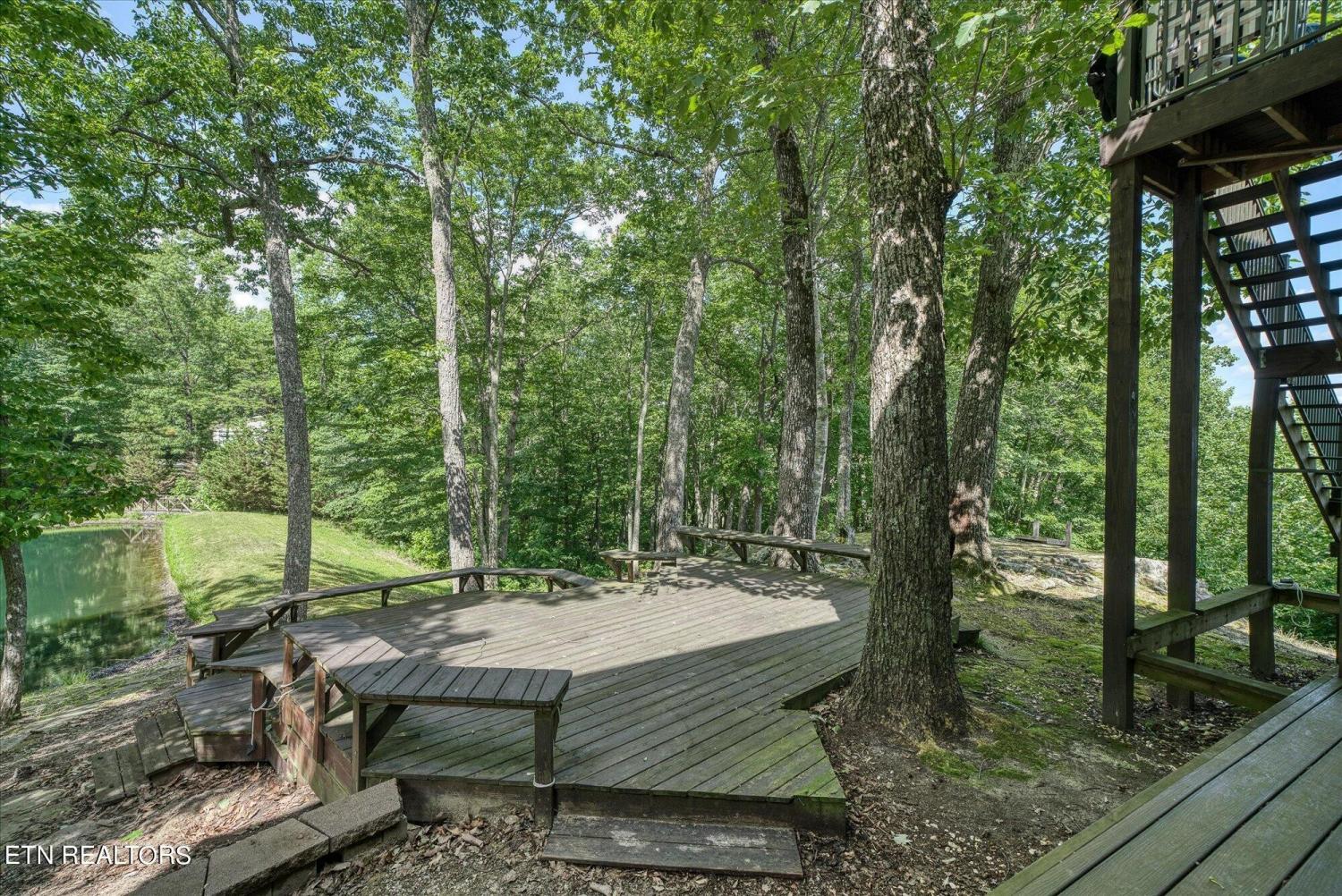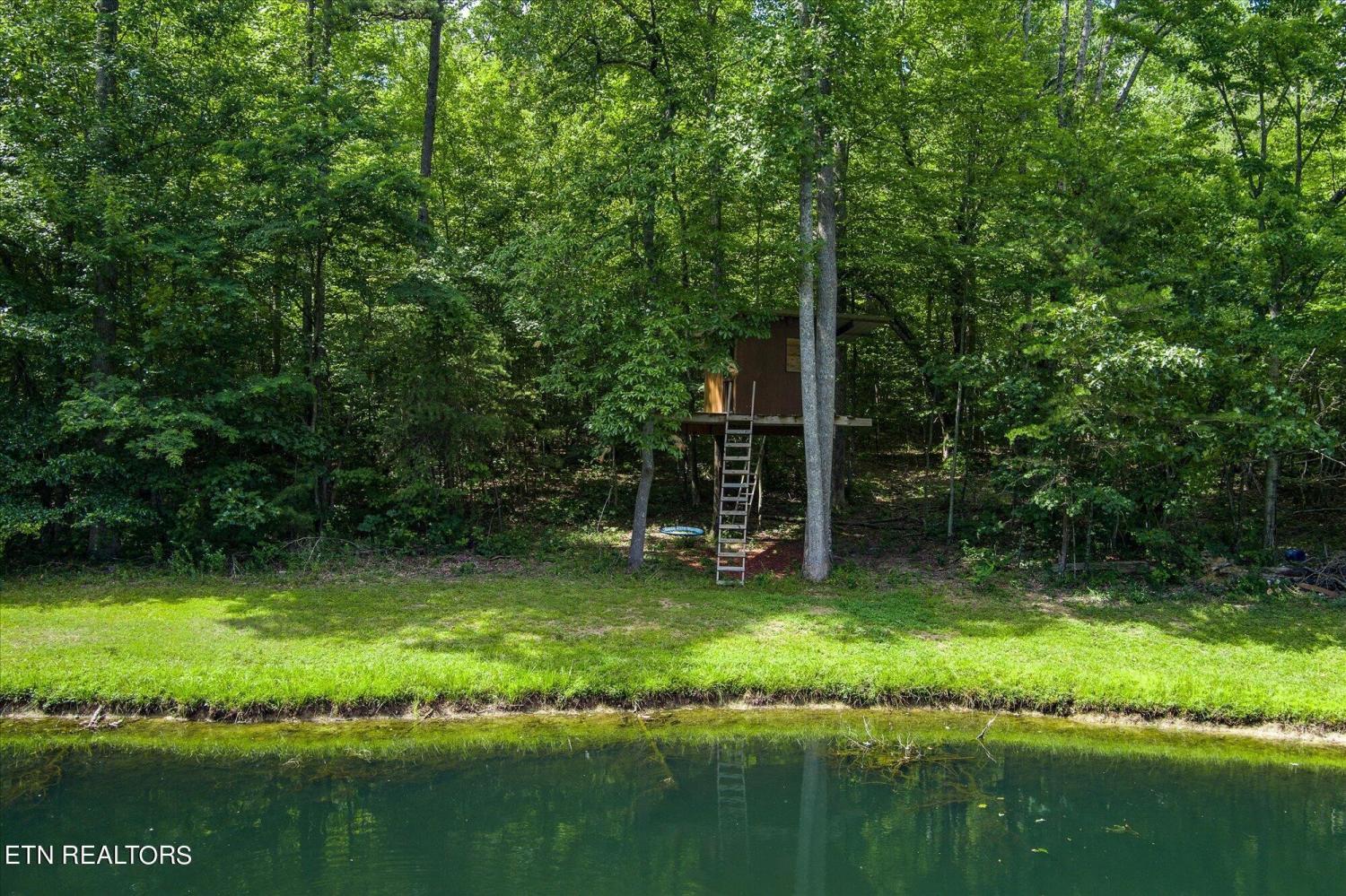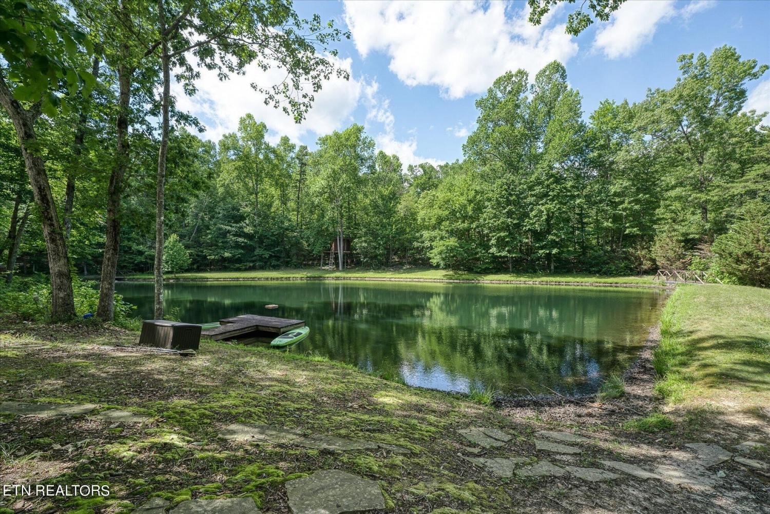 Welcome to your own hidden haven in the enchanting, deed-restricted community of Cumberland Cove — a quiet, private setting nestled between forest trails and peaceful serenity. Nature lovers will be delighted to find endless hiking adventures and a community center just a few miles away. As you arrive, a private, code-secured gate opens like a secret passageway to a long, paved drive — leading you through the trees to your very own retreat. Perched atop 8 lush acres, this charming 3-bedroom, 2.5-bath home spans 1,888 square feet and offers dazzling bluff views that stretch far beyond the deck, which is crafted from long-lasting Trex composite — perfect for morning coffee or twilight stargazing. Wander outside and you'll discover a fully stocked pond, ready for paddle boarding, picnics, and peaceful afternoons. The treehouse adds a dash of childhood wonder to the landscape, while newly built raised garden beds and a compost box await the green-thumbed dreamer. Step inside to find luxury vinyl plank floors throughout the downstairs and a beautifully remodeled bathroom that feels like a spa, featuring a tiled double-head shower that invites long, steamy escapes. New doors and trim give a fresh and polished finish. Upstairs, light pours in through grand windows, illuminating exposed beams that give the space a cozy, lodge-like charm. The kitchen is a chef's delight, with gleaming granite countertops, stainless steel appliances, and a double oven. When winter whispers through the Tennessee trees, the stone wood-burning fireplace crackles with warmth and cheer. The home is equipped with a three-year-old HVAC system and a downstairs mini split for year-round comfort. The lower deck features a cooling fan and is structurally ready to support a hot tub — perfect for soaking under the stars. Car lovers and hobbyists, this one's for you!