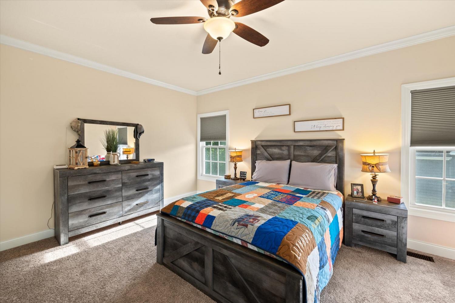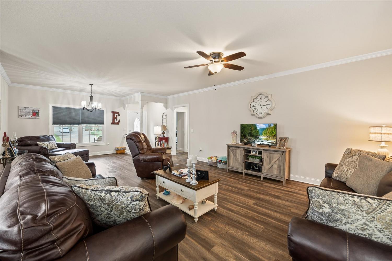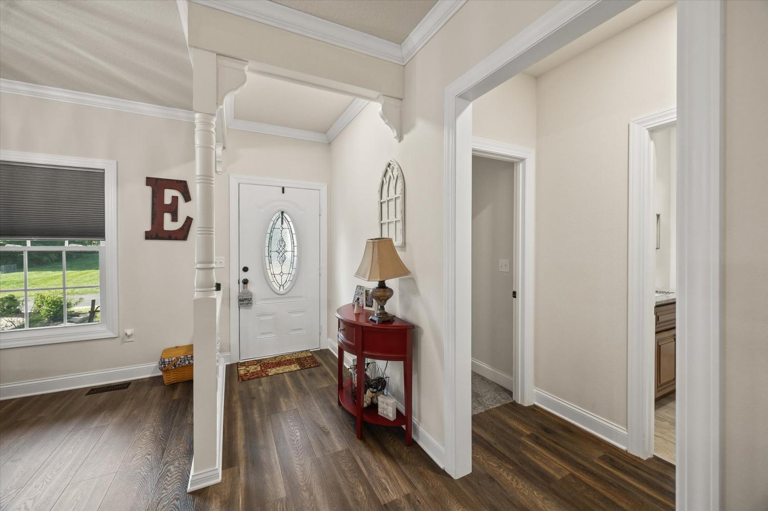 Step into this remarkable 3-year-old, one-level home, showcasing an open floor plan, three bedrooms, 2 bathrooms and a split bedroom design ideal for privacy. Nestled on 1.50 private acres of a corner lot, this residence is merely 10 minutes to the City of Cookeville. Enjoy cooking in the well-appointed kitchen that is complete with two pantries, a breakfast bar, and sleek granite countertops that is open to the formal dining area featuring custom built-ins. The spacious primary suite offers a large walk-in closet, along with the primary bath featuring an abundance of vanity space, dual sinks, a lovely walk-in tiled shower and brand-new tile flooring. Walk-in laundry room with storage cabinetry + washer and dryer are included. Convenient main level two car garage. Enjoy relaxing moments on the covered front porch or the secluded back patio overlooking the private backyard. Recent upgrades include Home Craft gutter protection (2023), some fresh paint, new carpet in primary bedroom, new tile flooring in primary bath and an encapsulated crawlspace with commercial dehumidifier (2025).
