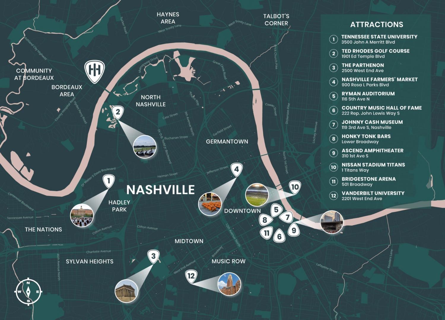 From downtown, take Clarksville Pike across Cumberland River. Turn Left on S Hamilton Road, The Hamilton will be on your left.