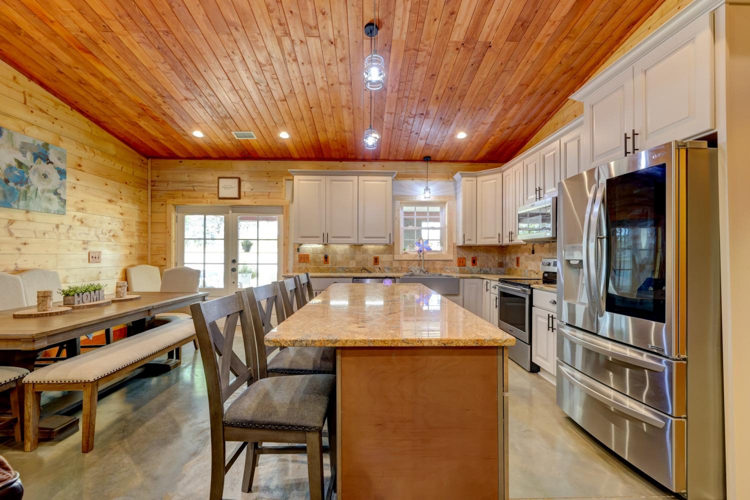 Welcome home to this breathtaking barndominium, where quality craftsmanship meets country serenity. Nestled on 4 private acres, this corrugated metal-constructed home with a durable metal roof (complete with leaf guard) was built with exceptional attention to detail and energy efficiency in mind—featuring spray foam insulation throughout the entire structure, 4” to 6” thick, keeping the home comfortable year-round. Step through the grand 8-foot solid pecan wood double doors into a bright, open-concept living space. Beautiful floors flow throughout, leading to a spectacular vented propane fireplace—the perfect centerpiece for cozy evenings. The custom kitchen is a chef’s dream, featuring marble countertops, a farmhouse sink, custom cabinetry, stainless steel appliances and a spacious open pantry. The primary suite is a peaceful retreat, wrapped in warm pine wood walls with solid wood blinds that convey. Continue into the luxurious primary bath, where you’ll find a clawfoot tub, custom cabinetry and a gorgeous walk-in shower—a true spa-like escape. The primary closet offers generous space and includes a walk-in storm shelter certified for Category 4 winds and equipped with an automatic light. Once you’ve made it through the rest of this beauty and all that it has to offer, step out back through the double French doors to your private oasis. Enjoy the covered back patio with cement overlay floors designed to look like wood, dual ceiling fans, a designated space pre-wired for a hot tub and a fire pit area — all with no view of neighbors for ultimate privacy. Every inch of this home was thoughtfully designed, from the foam-insulated garage to the portable generator hookup outside the property, ensuring comfort and peace of mind in any season. If you’ve been searching for the perfect mix of rustic elegance, privacy and practicality—this one-of-a-kind barndominium is it.