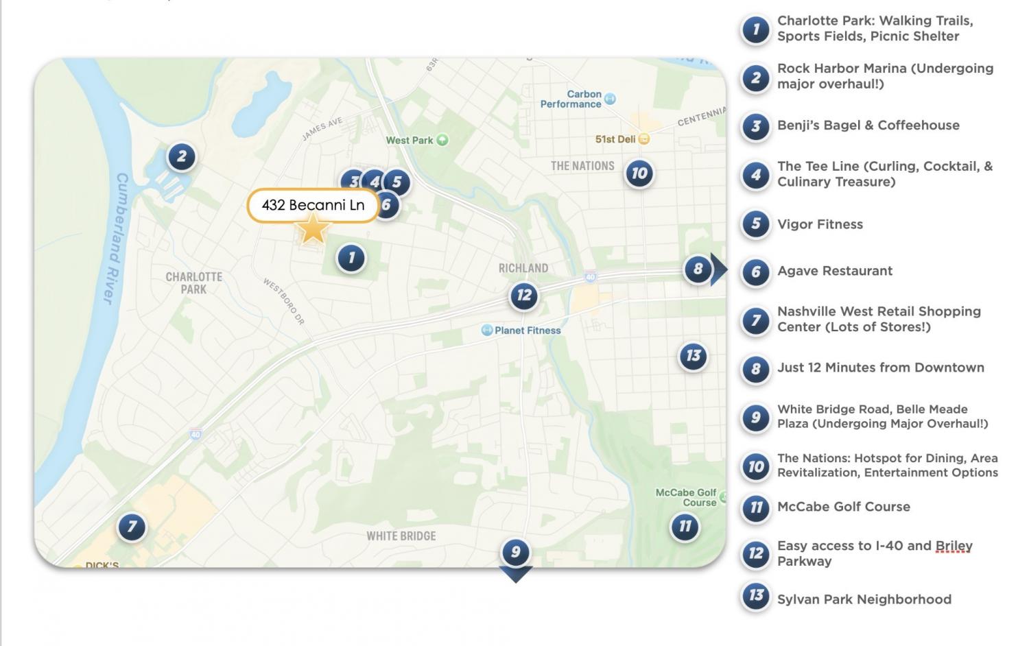 Just 12 Minutes from Downtown: Head west on Charlotte Pike (passing Centennial Park, note the dining, bars, entertainment options!) turn Right on Briley Parkway, Left on Robertson Ave, Left on Nall Ave, Right into Becanni, Home will be on Right.