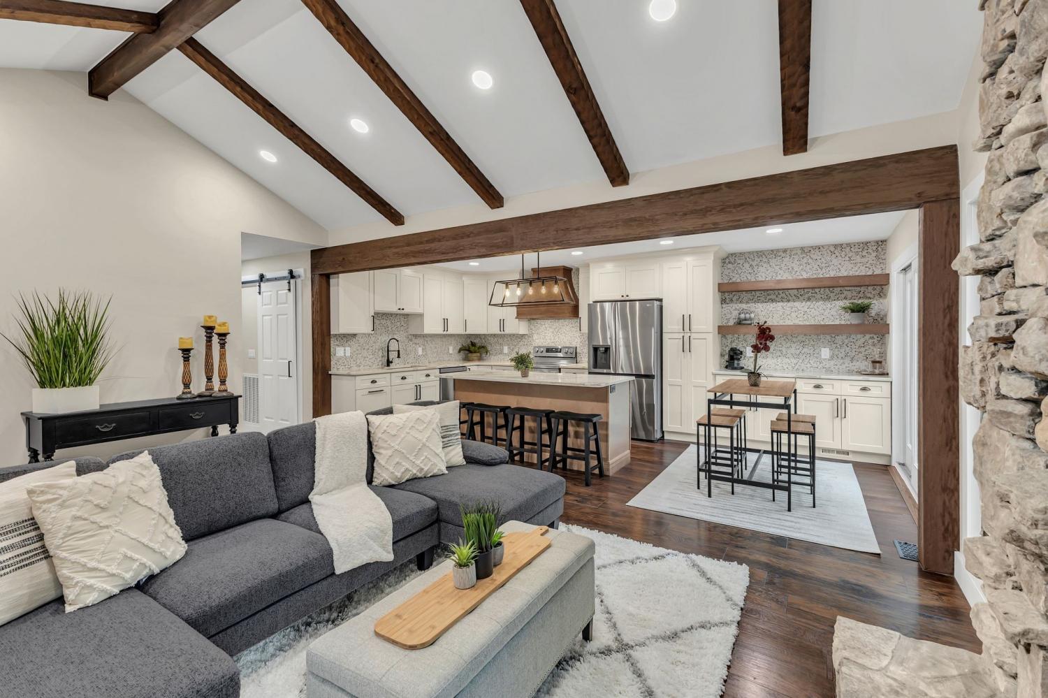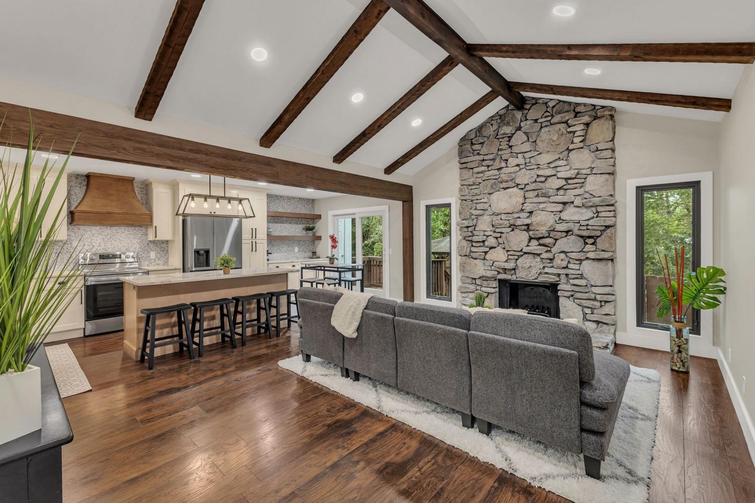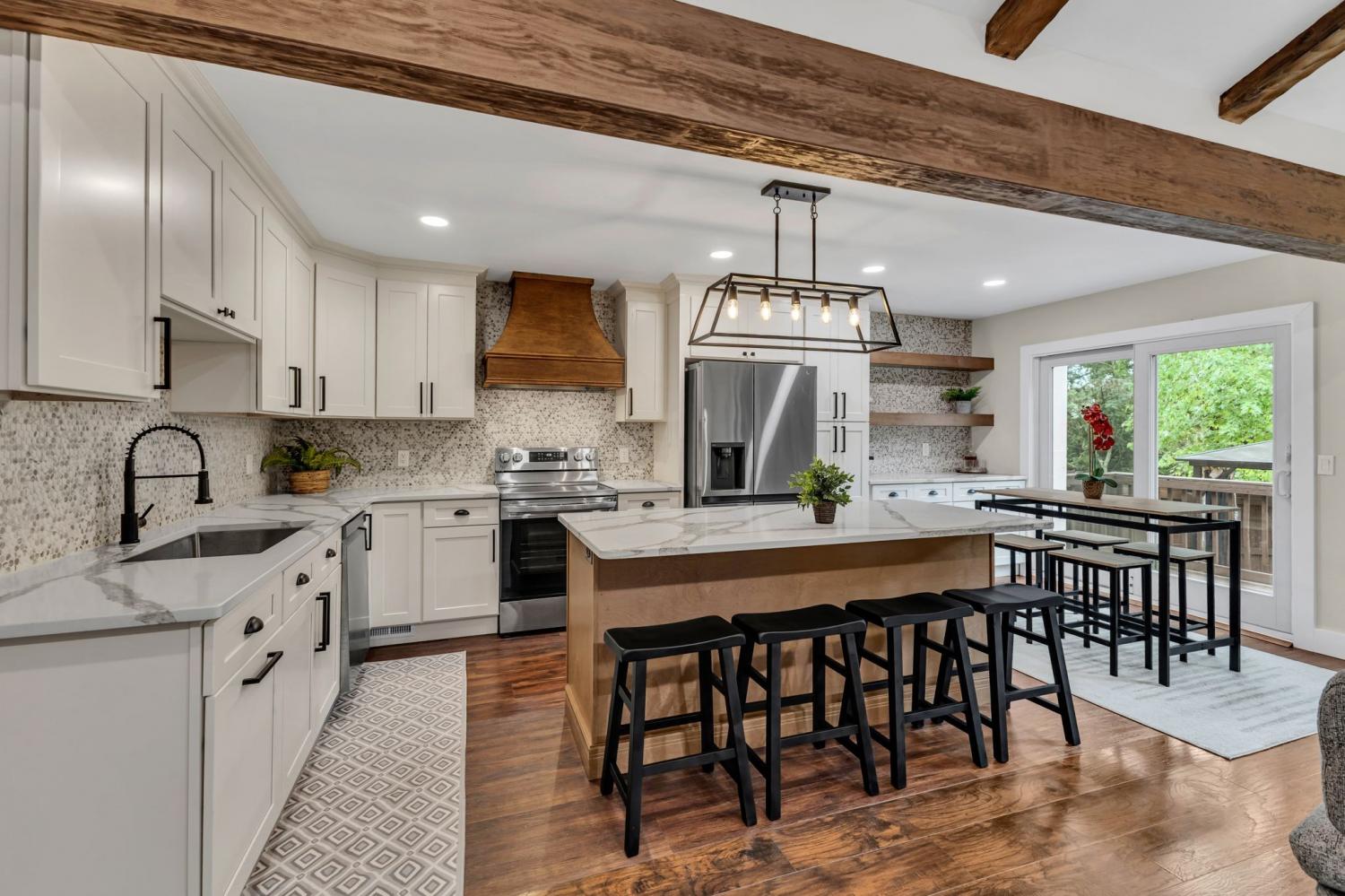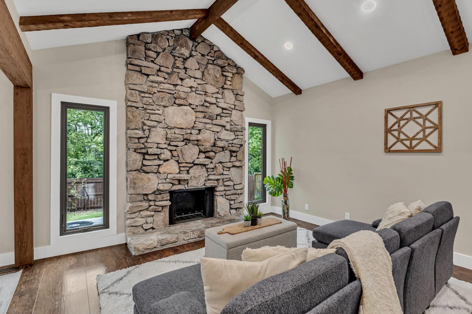 You will not believe your eyes! This FULLY RENOVATED 2BR/2BA Bellevue home offers 1,117 sq ft of immaculate living with stunning finishes and thoughtful design. The open floor plan features a stone fireplace framed by large windows, wood-beamed ceilings, and a dining area with coffee bar and exposed shelving. The stylish kitchen boasts light cabinets, high-end stainless appliances, and a custom wood hood. The spacious primary suite includes a barn door to a spa-like bath with double vanities, tiled shower, and custom closet. Outdoors, enjoy a back deck, pergola-covered patio, fenced yard, and serene creek views. Just steps to the community pool and minutes to shopping, dining, and Bellevue Community Center. Extras include private storage, two dedicated parking spaces, and plenty of guest parking. Modern comfort meets low-maintenance living!