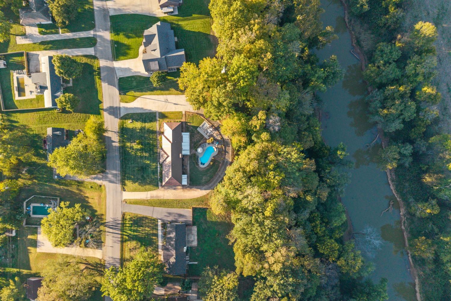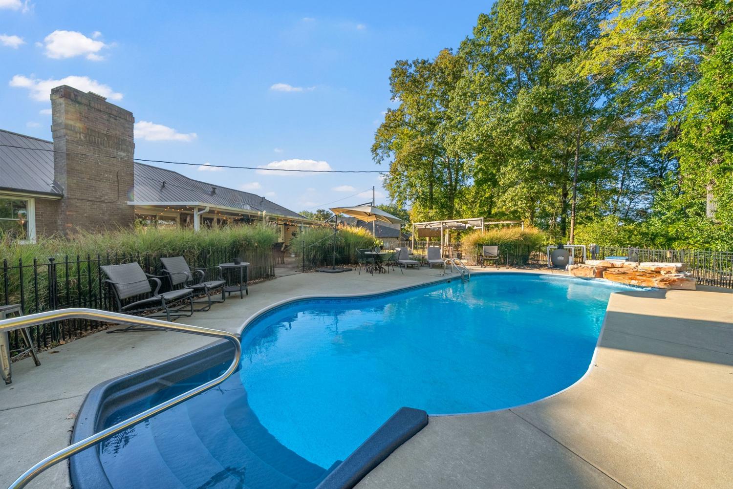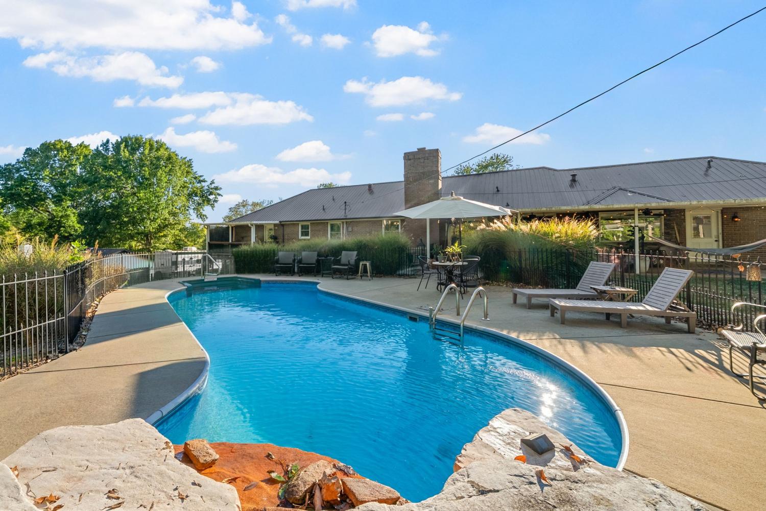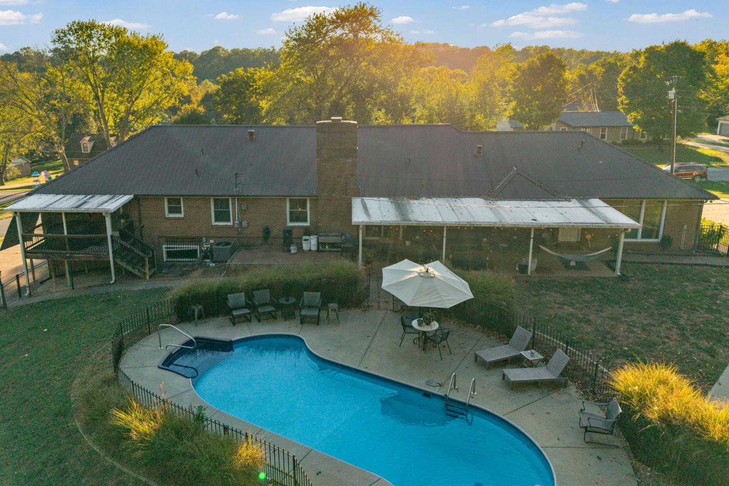 Nashville Chic in the Heart of Clarksville! On 1.6 acres backing up to the Red River, this home offers the rare feeling of retreat while still being in the heart of Clarksville. Picture yourself starting the day with a cup of coffee as the sunrise stretches across the backyard, casting light over the pool and waterfall fountain. As the day winds down, golden hour glows across the property before the sun sets in a show of warm Tennessee color—turning every morning and evening into a moment worth savoring. Inside, the home is just as impressive. A massive living room provides space for multiple uses—an inviting lounge, a dining area, and even a home office. The brick-inlaid, turret-style spiral staircase is a centerpiece feature, leading to the finished basement with a tornado shelter and oversized two-car garage. The kitchen is both functional and beautiful, with custom cabinetry, upgraded granite countertops, and a huge island that’s perfect for cooking or entertaining. An eat-in nook sits just off the kitchen, along with a formal dining room currently used as a home gym. One wing of the home is designed for flexibility—ideal for a mother-in-law suite, Airbnb rental, or private guest retreat. It includes a mini bar, a full bath, and an oversized bedroom/living area with its own built-in bar, plus another bedroom. On the opposite side of the home, two additional bedrooms await—one of which has been transformed into a giant walk-in closet, with the option to convert it back if desired. The outdoor living spaces truly complete the experience. A sparkling in-ground pool with rock fountain, hot tub, covered patio, and firepit area make this property as much about lifestyle as it is about square footage. This is not just a home—it’s where space, comfort, and everyday beauty come together.