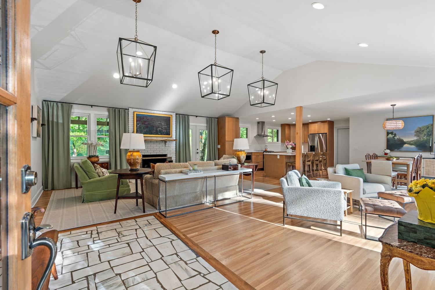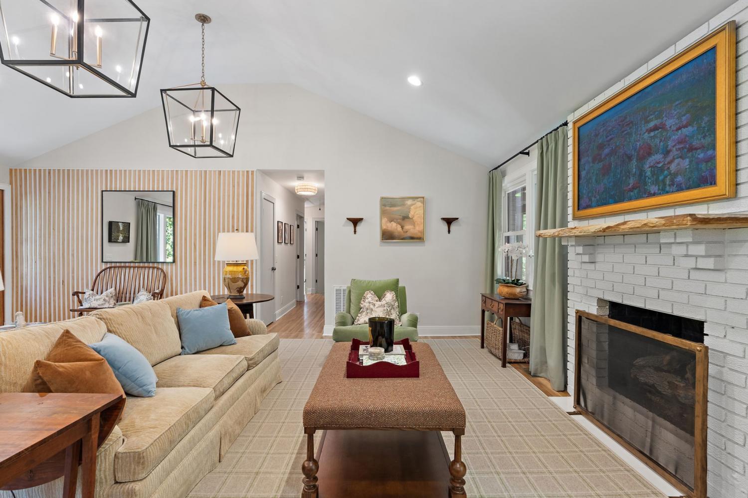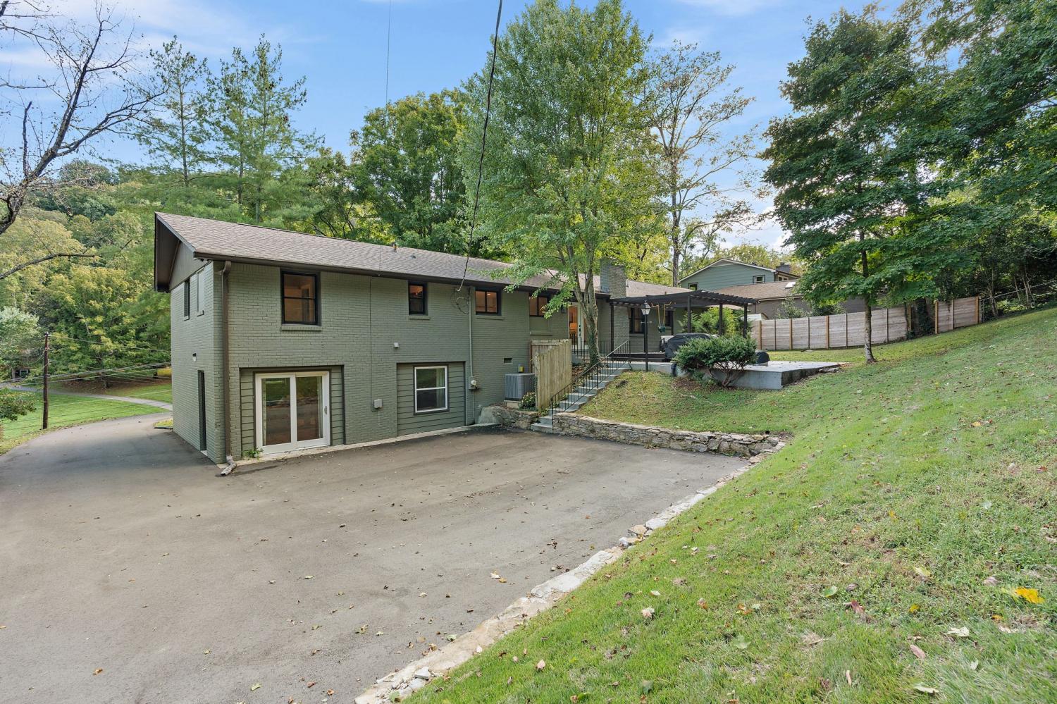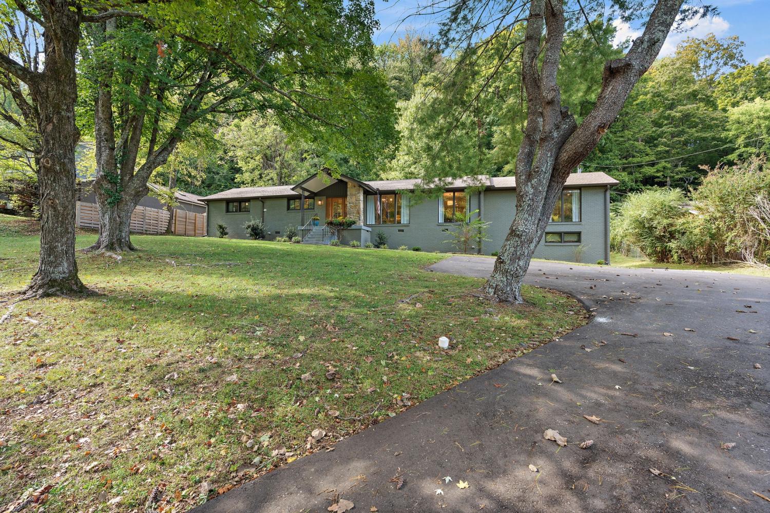 Mid-century exterior meets traditional modern living in this beautifully updated West Meade residence. Set on a large, private wooded lot near the heart of Nashville, this home offers rare privacy with convenient access to nearby shops, dining, and major thoroughfares. Designed for comfortable one-level living, the main floor features vaulted ceilings, expansive windows, and an open layout filled with natural light. Recent updates include refreshed paint, updated lighting, new curtain hardware, a newer roof, and a tankless water heater. The private primary suite occupies one wing, while three bedrooms and two full baths sit on the other. The finished walkout lower level provides flexible space for recreation, media, or an office with direct outdoor access. The spacious backyard offers areas for outdoor activities and gatherings, complemented by both front and rear parking that accommodates guests with ease. A large back patio with pergola seamlessly extends the living area for indoor-outdoor entertaining.