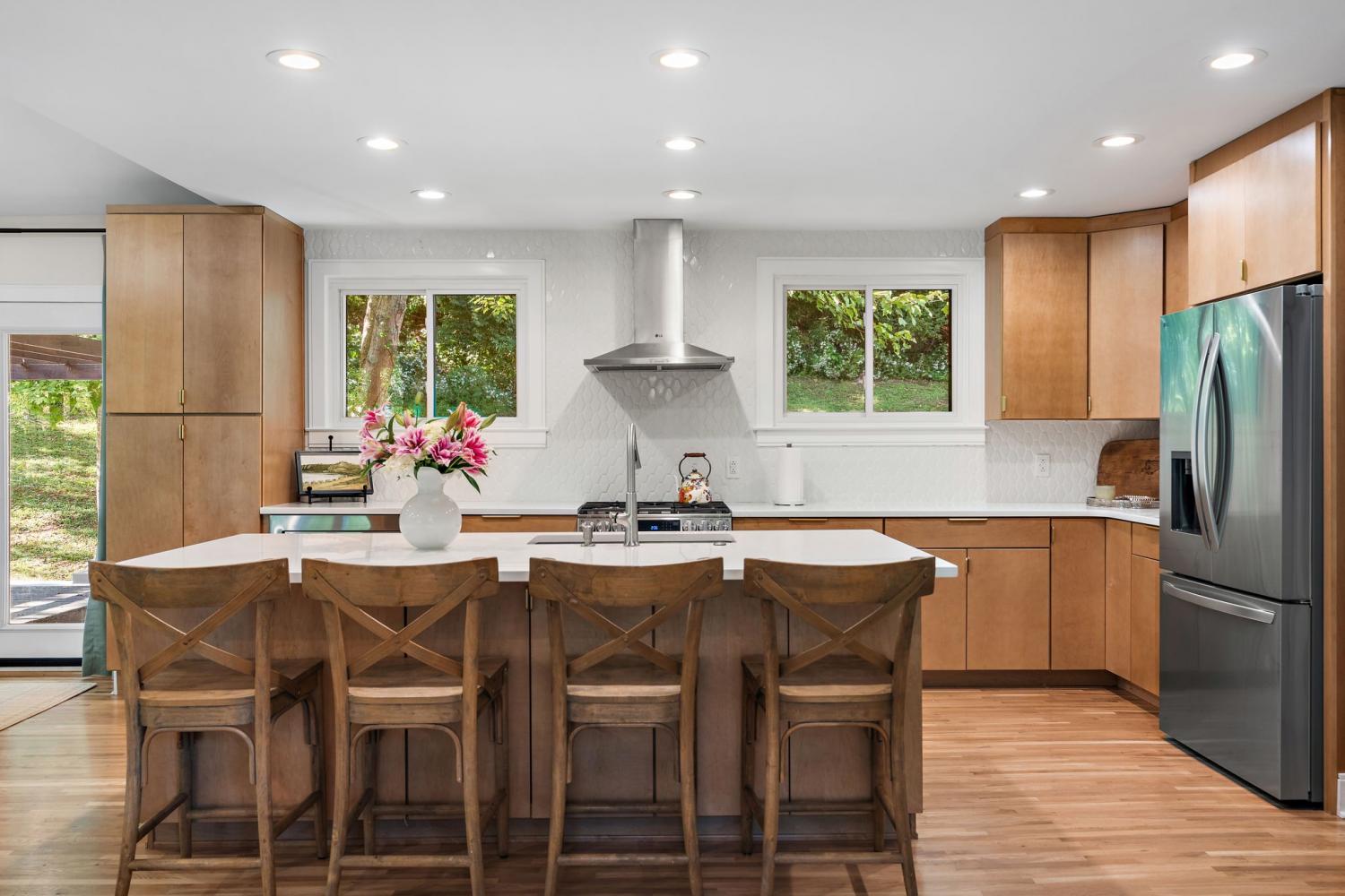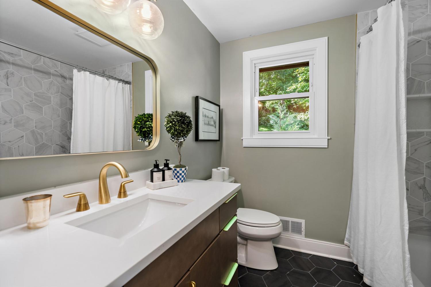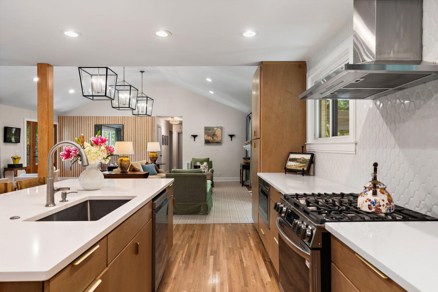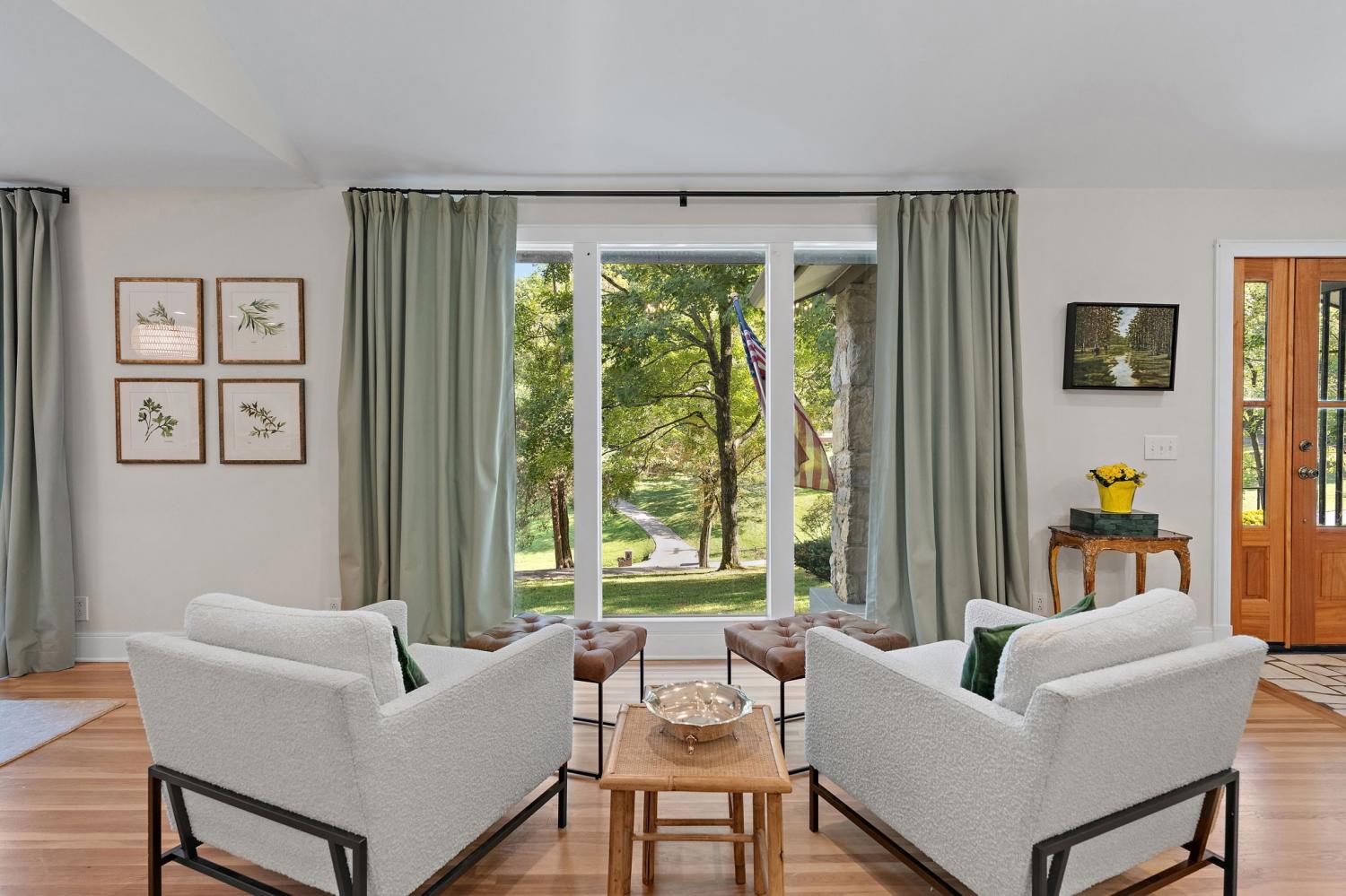 Mid-century exterior meets traditional modern living in this beautifully updated West Meade residence. Set on a large, private wooded lot near the heart of Nashville, this home offers rare privacy with convenient access to nearby shops, dining, and major thoroughfares. Designed for comfortable one-level living, the main floor features vaulted ceilings, expansive windows, and an open layout filled with natural light. Recent updates include refreshed paint, updated lighting, new curtain hardware, a newer roof, and a tankless water heater. The private primary suite occupies one wing, while three bedrooms and two full baths sit on the other. The finished walkout lower level provides flexible space for recreation, media, or an office with direct outdoor access. The spacious backyard offers areas for outdoor activities and gatherings, complemented by both front and rear parking that accommodates guests with ease. A large back patio with pergola seamlessly extends the living area for indoor-outdoor entertaining.