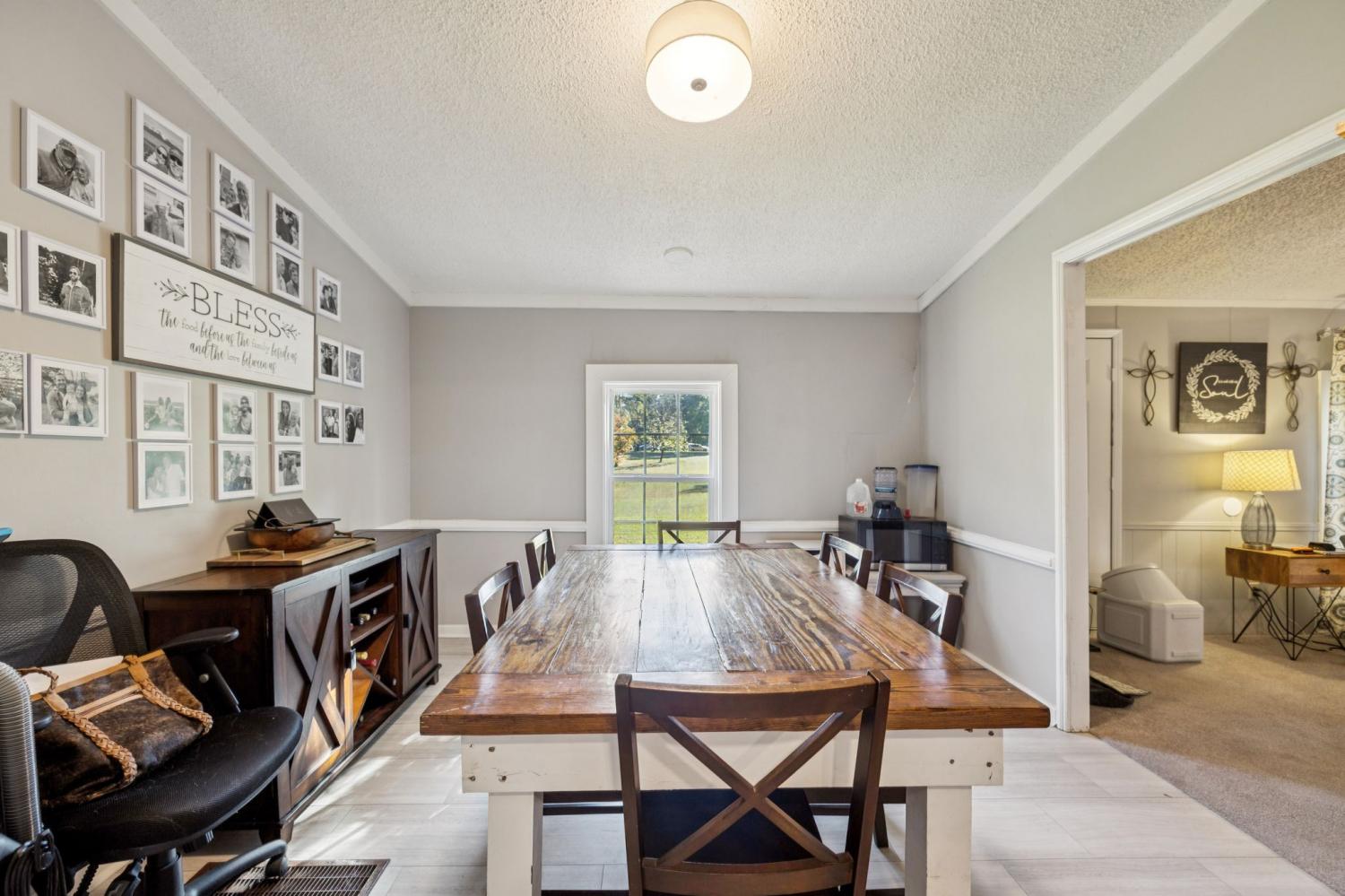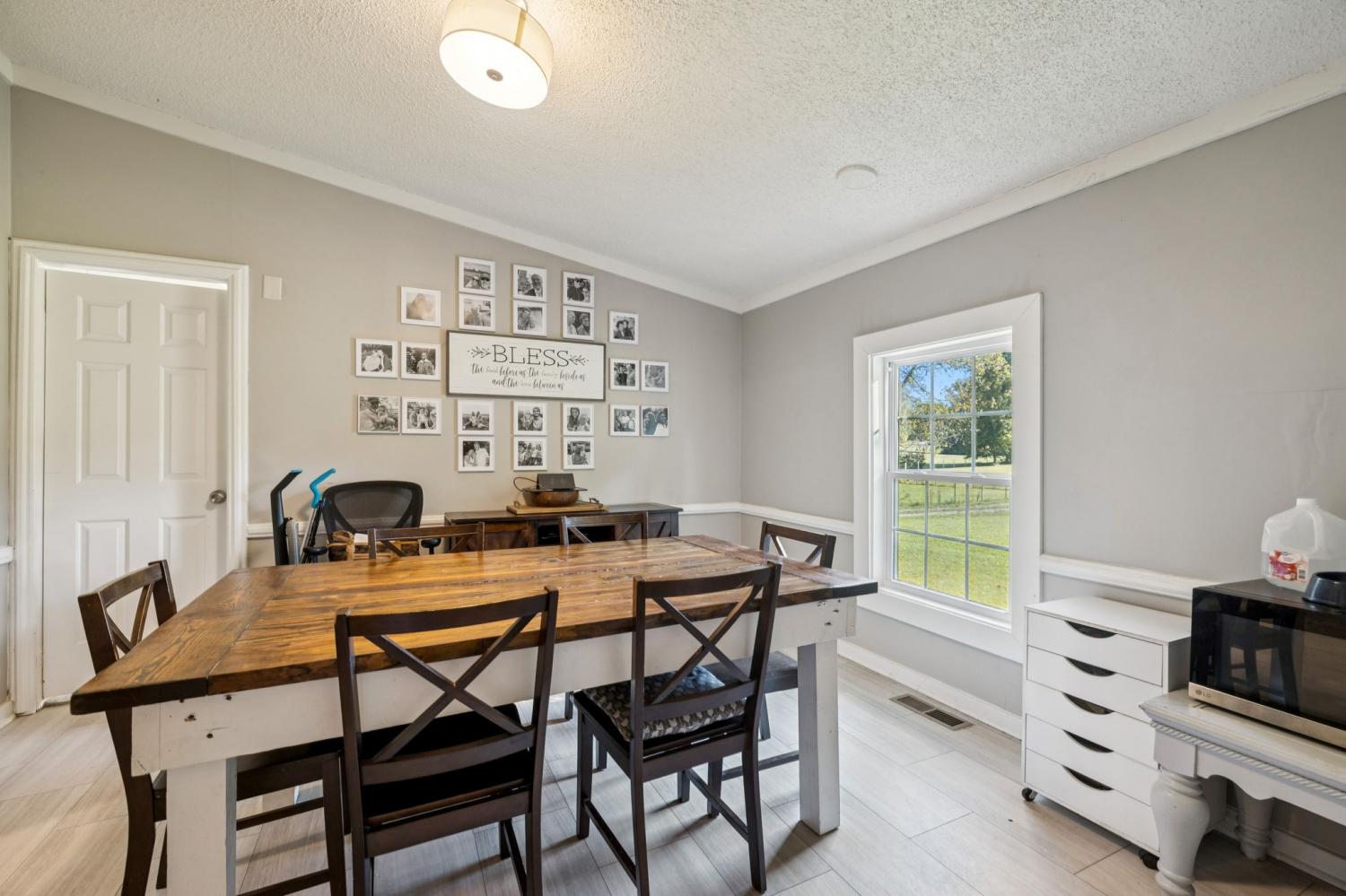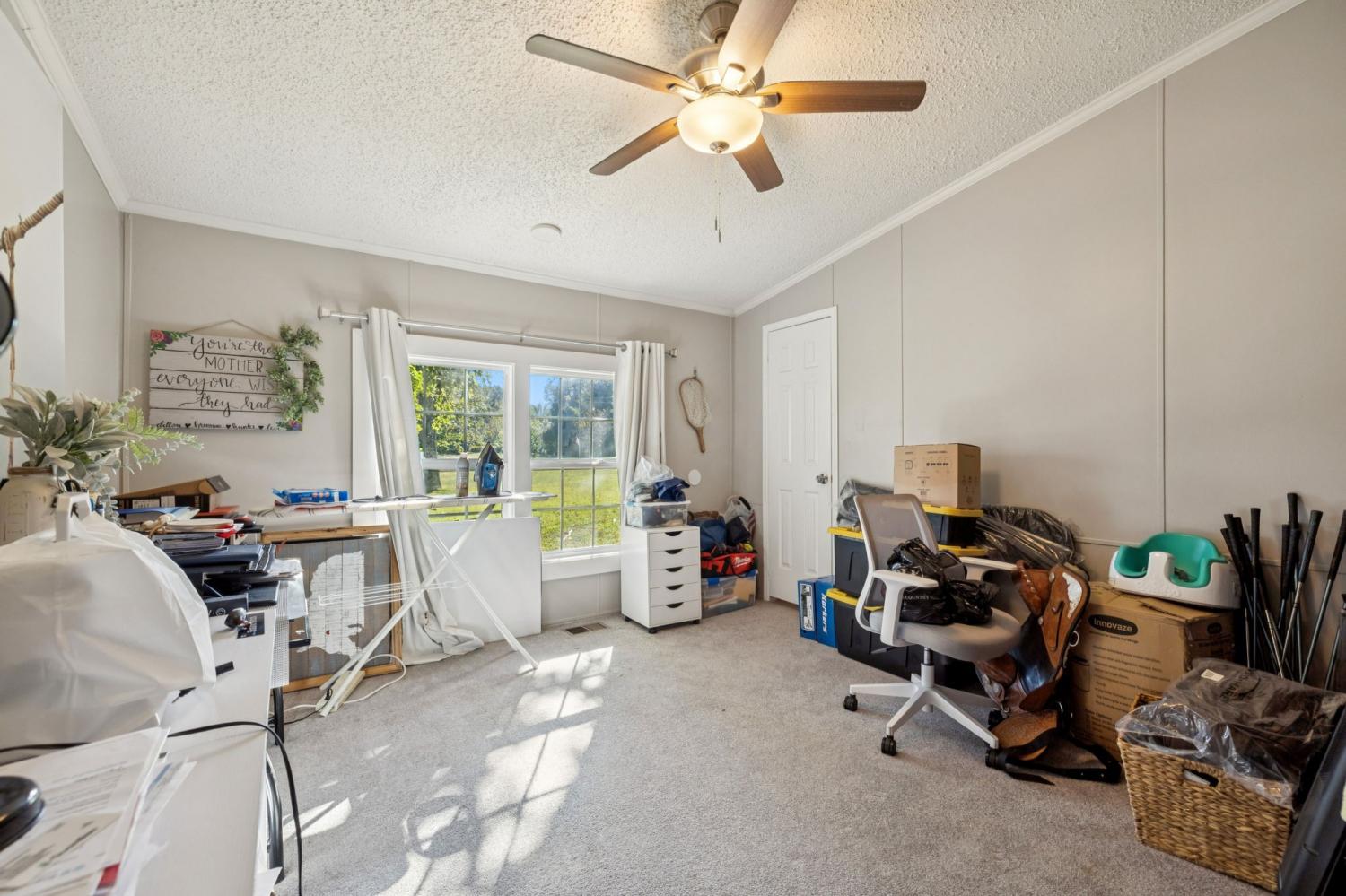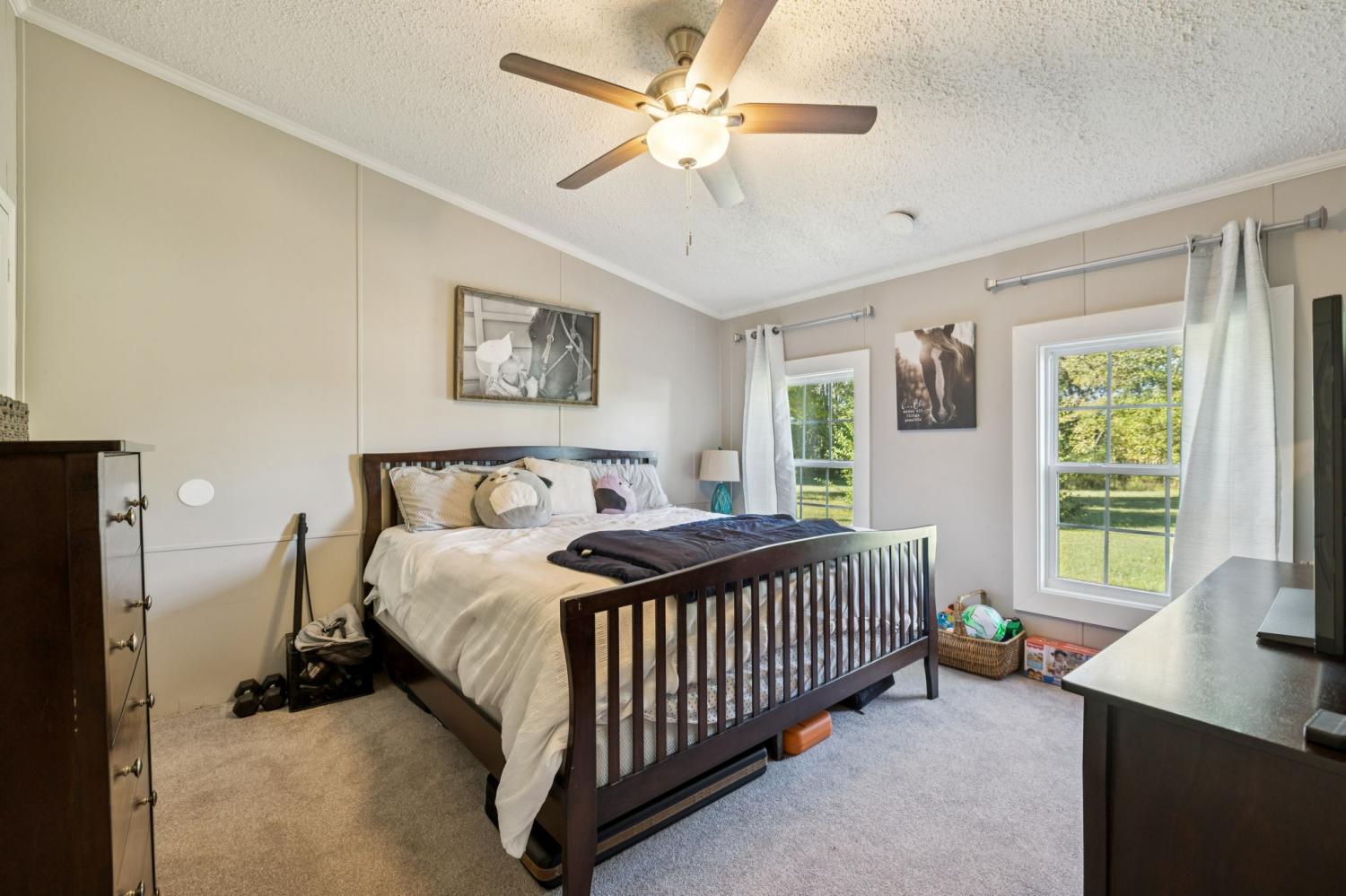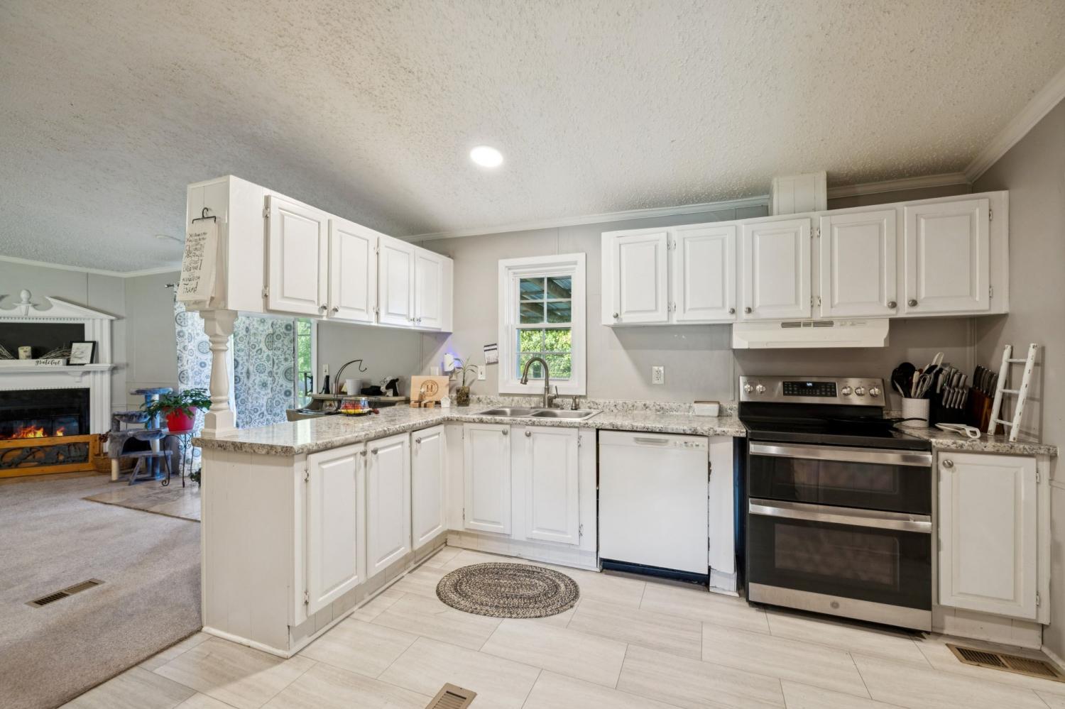 Manufactured home on a permanent foundation~POTENTIAL 3 Bedrooms~Level lot with a huge open front yard with a perfect number of shade trees~open floorplan~split bedroom design~formal dining room~large living room with gas fireplace~kitchen with plenty of counter space~newer carpets~walk-in closets including 2 in the master suite~all kitchen appliances remain~HVAC 2021~Covered back deck perfect for the morning coffee or afternoon tea~detached workshop~conveniently located with a straight drive to Clarksville or Nashville~ 50 amp service for RV on site