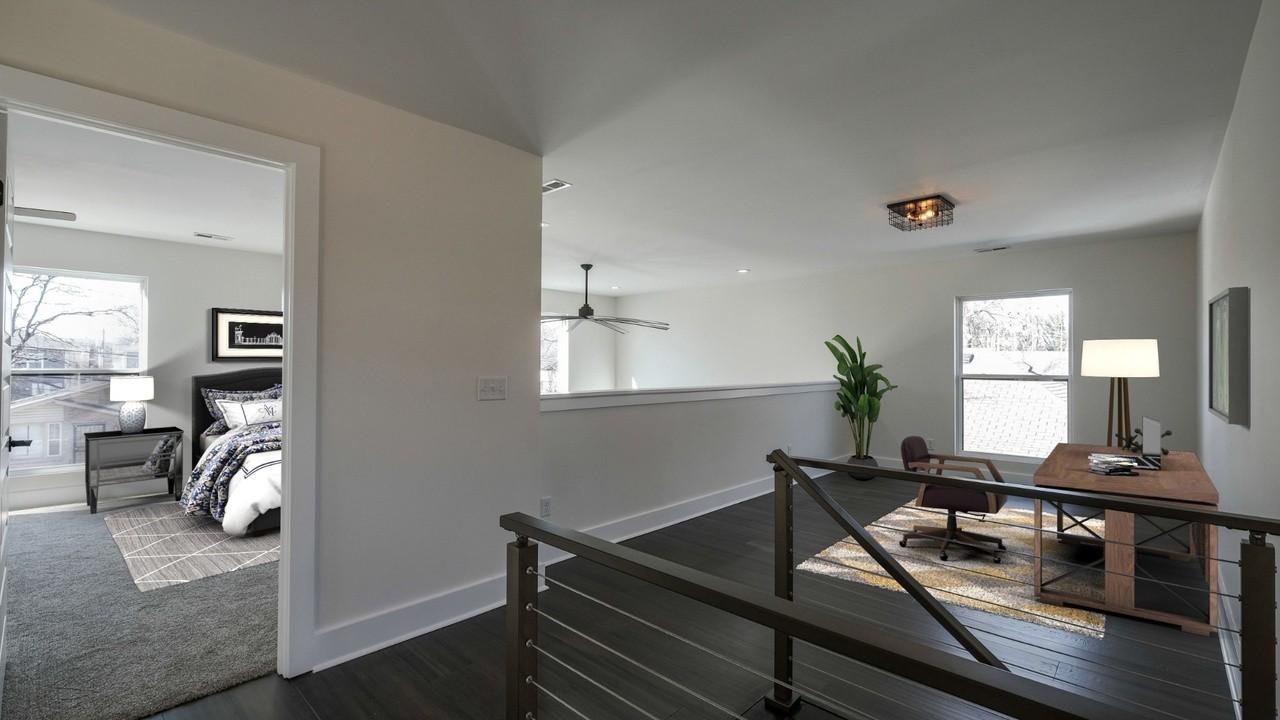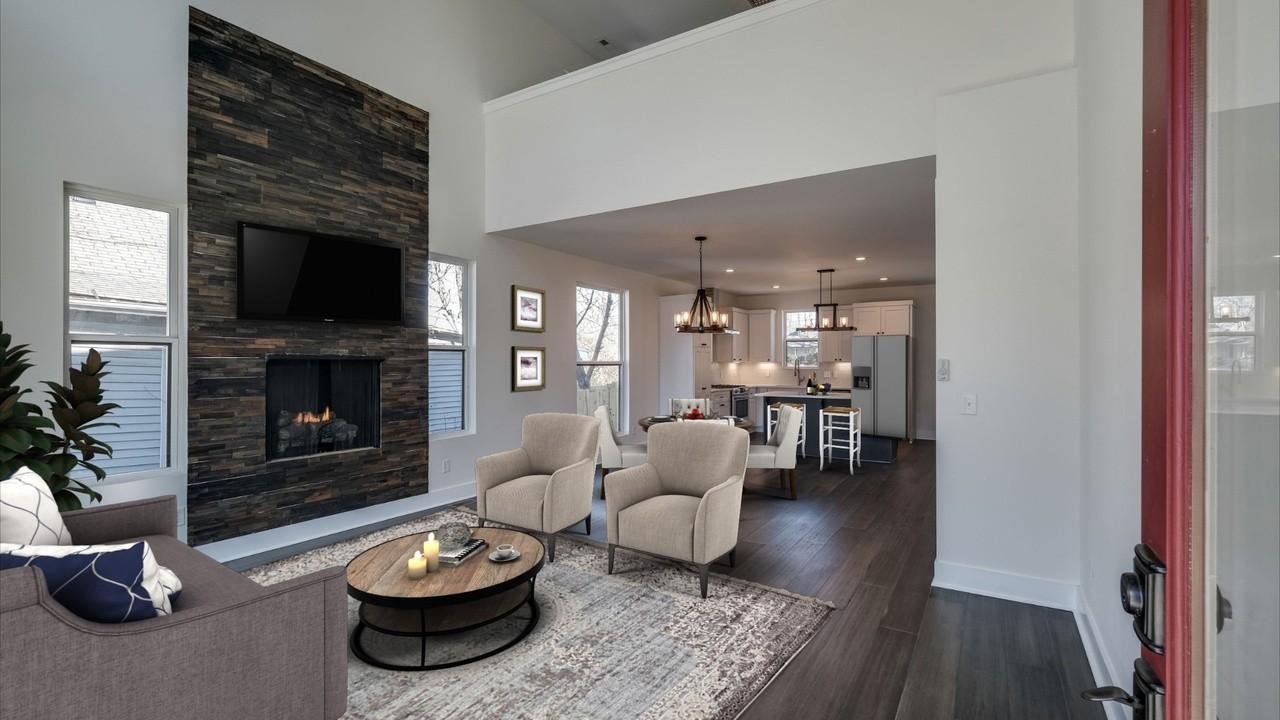 Stunning, like-new home offering luxury finishes and high-end appliances throughout. The open-concept floorplan features soaring ceilings, a custom gas fireplace, and expansive windows that fill the space with natural light. Enjoy hardwood floors, stainless steel appliances, quartz countertops, and a spacious kitchen island with built-in drawer microwave—perfect for entertaining. The primary suite boasts a spa-like bathroom with a walk-in shower and separate soaking tub. Upstairs, you’ll find a versatile loft ideal for a home office, plus a convenient laundry room. Outdoor living is just as impressive with a covered front porch, large rear deck, and a fully fenced backyard. Washer and dryer included. Pets allowed with deposit. Apply through Zillow to be considered.