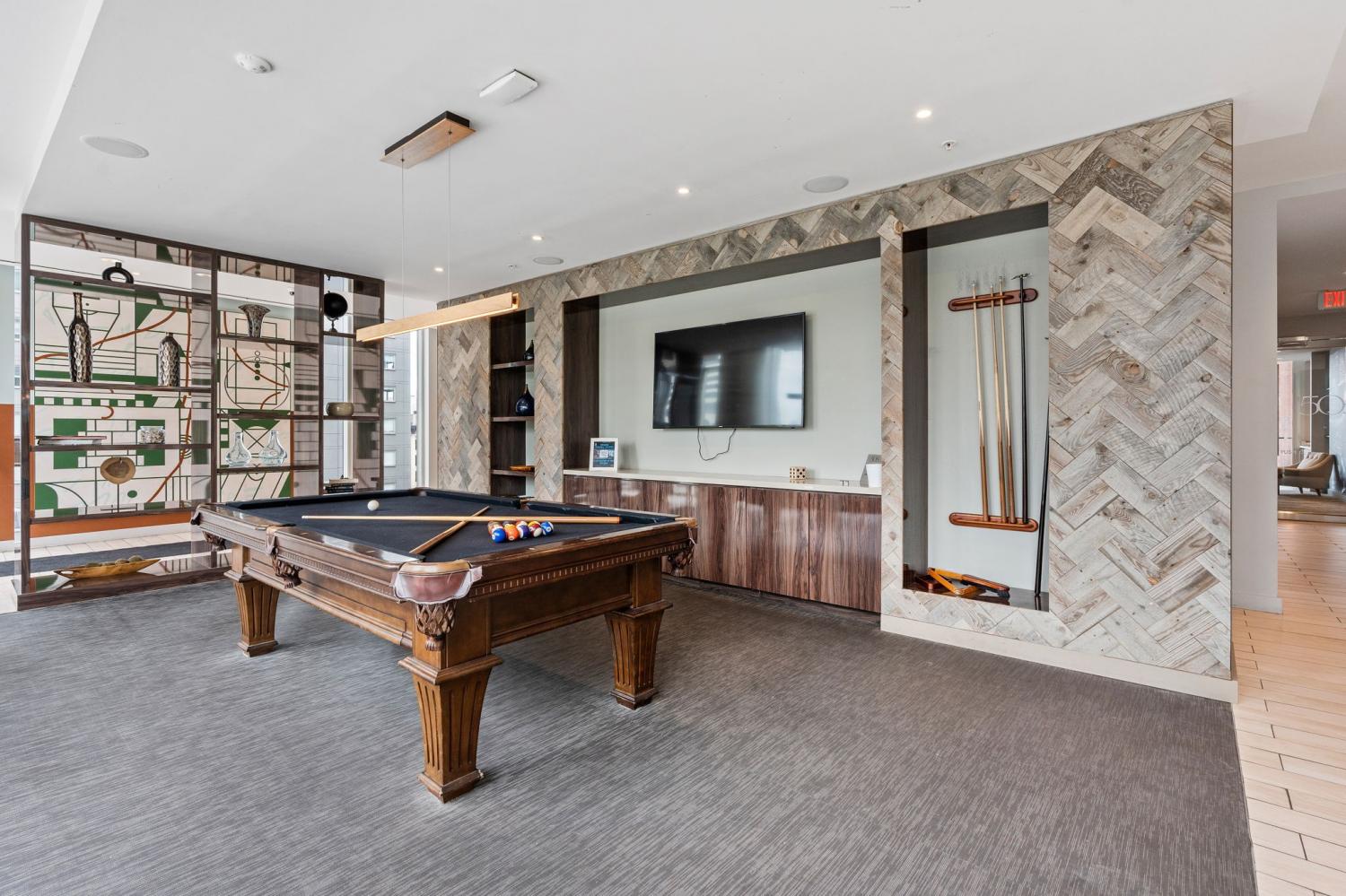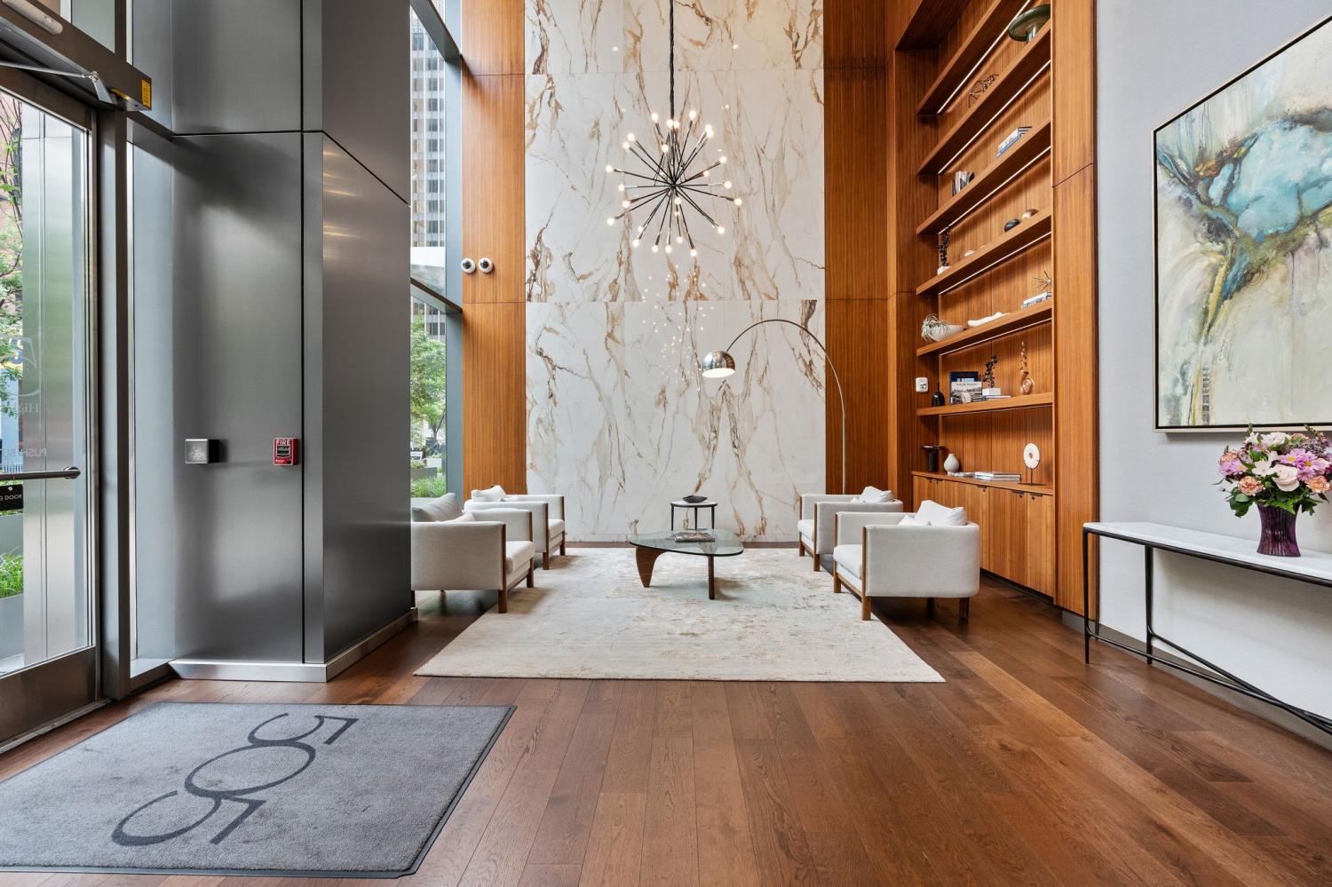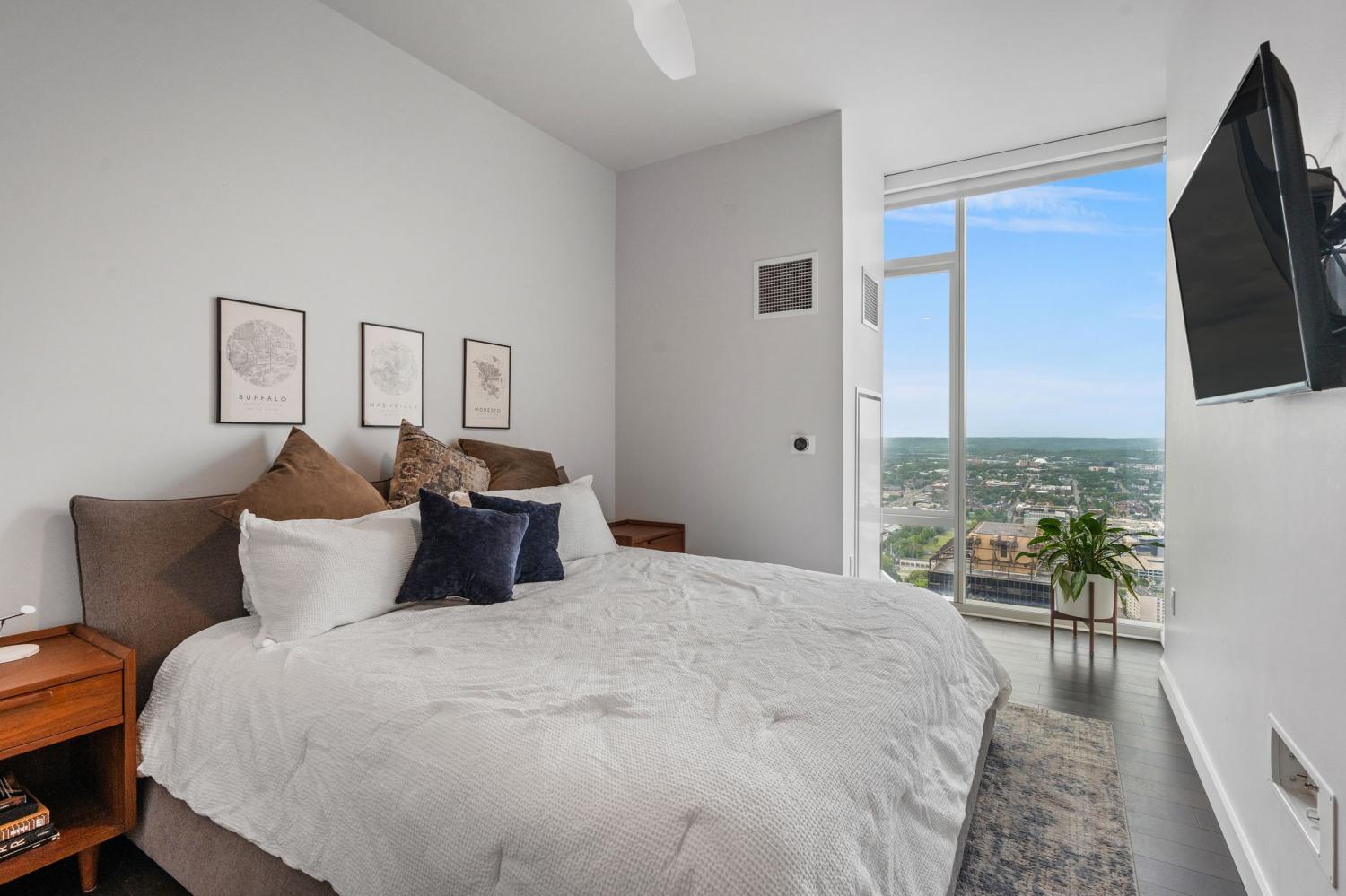 This stunning condo on the 43rd floor is turn-key and ready for you to lease. 2 bed, 2 bath (with double vanities in primary en suite), 1190 SF with hardwood and tile floorings throughout. Don't miss the owner upgrades that include plentiful storage in the hallway, a beverage center with beverage fridge, full size stacked washer/dryer and more! Parking available through landlord (1 assigned spot in condo nest) or direct through building. One pet under 50 pounds will be considered with pet fee / pet rent (limited to breeds not excluded by building by-laws). Utilities & pets extra. Building is pre-wired for Google fiber.