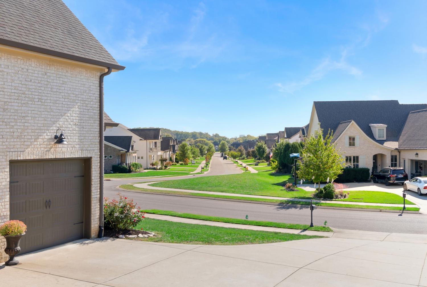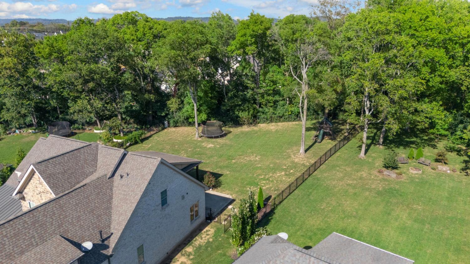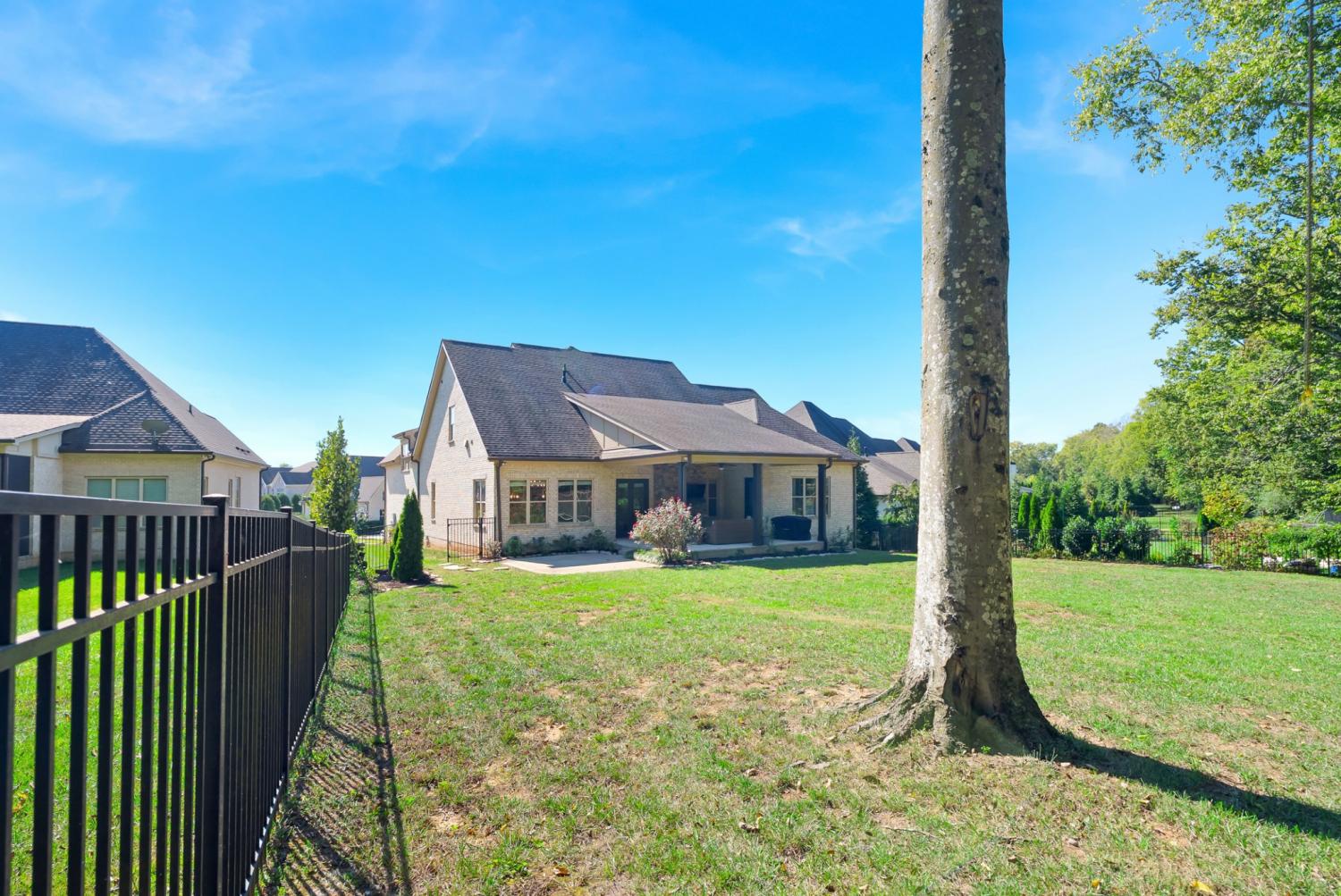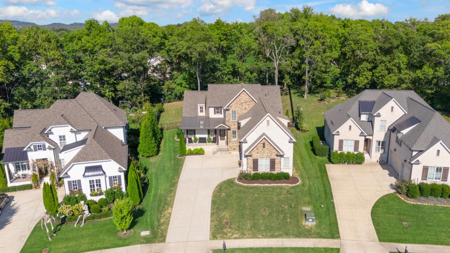 Distinguished Bridgemore Village! Backs to Trees! This 4-bed, 4.5-bath home is made for living and entertaining w/ ease and in style. Open-concept living space features wood beams, hardwood floors, and panoramic windows that fill the home with light, all set against a neutral palette. A double-sided, floor-to-ceiling fireplace steals the show while anchoring the living room and creating a warm, inviting centerpiece. Space in the living area is overgenerous, allowing for multiple types of furniture arrangement. Kitchen has granite countertops, abundant cabinets, a gas stove, double ovens, and a dining area large enough for parties, family dinners, or casual breakfasts. Oversized primary suite is a luxurious retreat w/ private access to the outside covered porch. Sizable primary bath features a walk-through shower w/ multiple shower heads, freestanding, oversized bathtub, and separate water closet. Every bedroom is ensuite, w/ granite countertops, tubs, and showers in each. Two bedrooms, including the primary, are conveniently located on the main floor. In addition to two bedrooms, upstairs you'll find a huge bonus room w/ wet bar and built-ins, additional hobby/flex room, and unfinished storage for everything you need to tuck away. Outdoor living abounds w/ a covered back porch w/ fireplace, additional patio, and large fenced yard w/ mature hardwoods. This gorgeous yard is begging for a POOL! Upscale light fixtures and a 3-car garage w/ man-door complete this meticulously maintained home. Front porch views of the rolling Tennessee hills and proximity to top-rated elementary and middle schools make this a rare find—a home built for both hospitality and rest. The neighborhood offers two community pools, kiddie pool, pavilion, playground, basketball court, miles of scenic walking trails, and sidewalks throughout.
