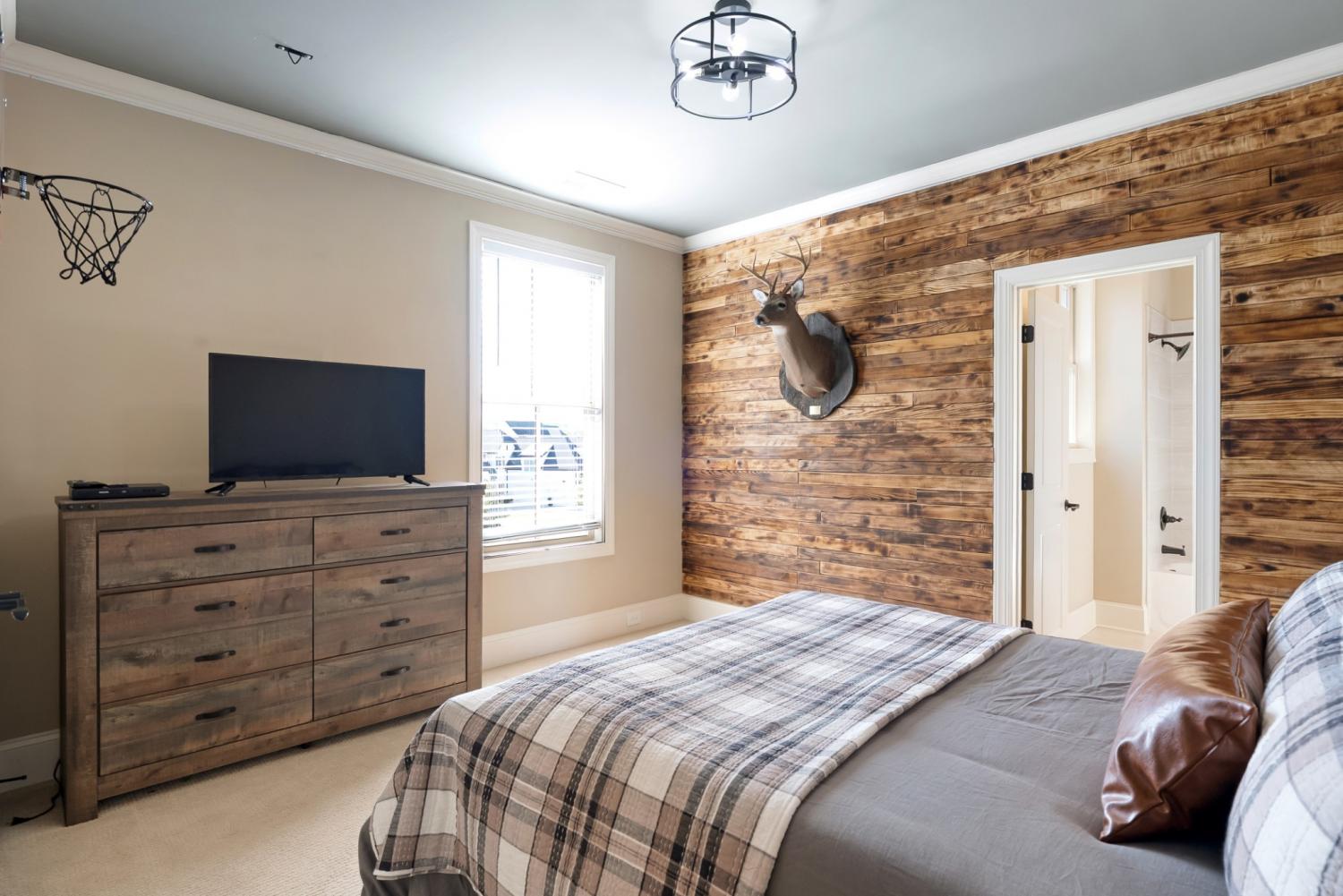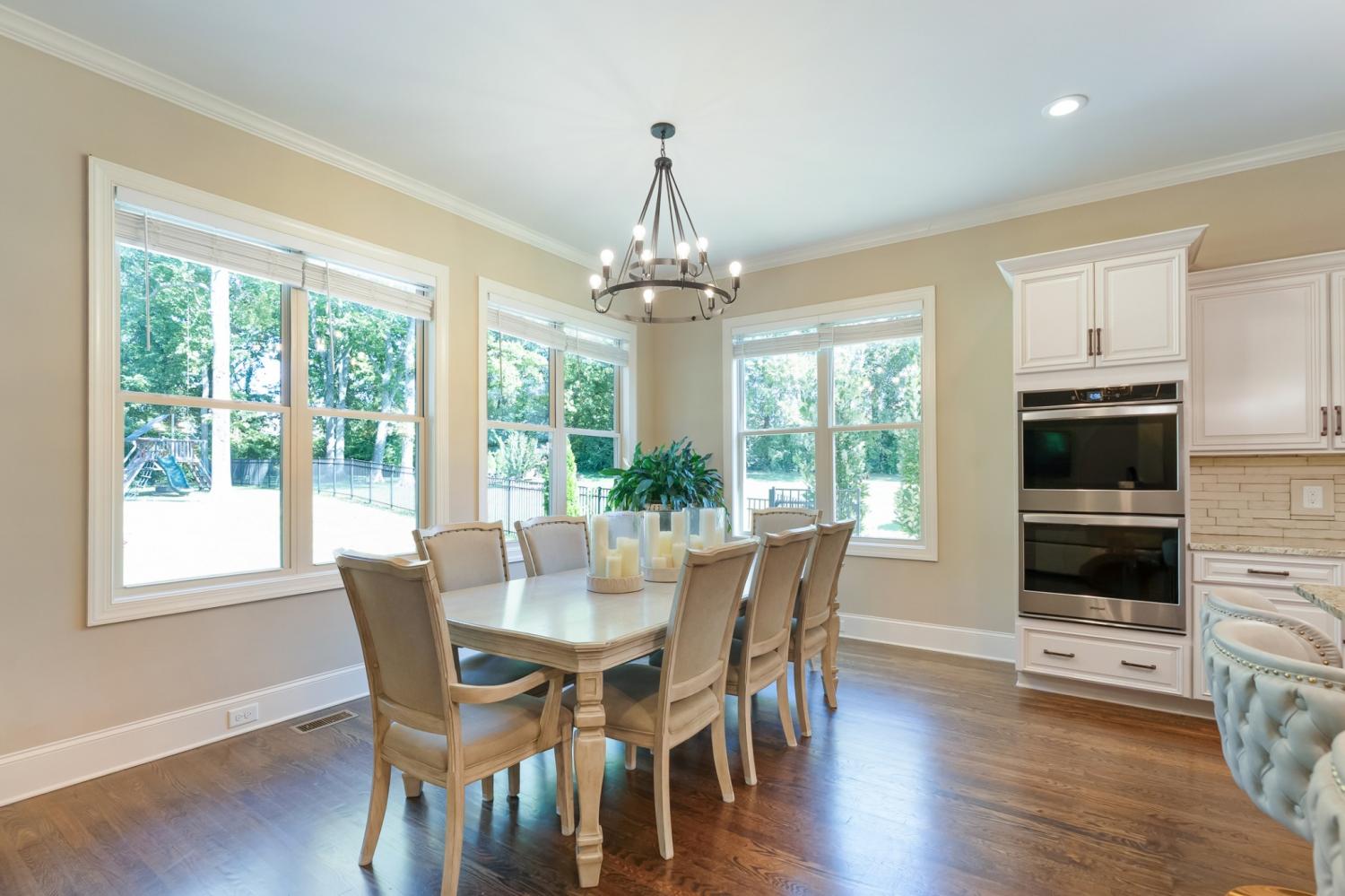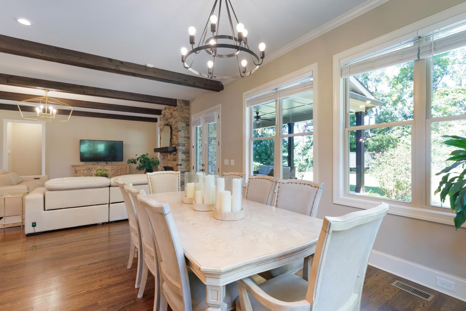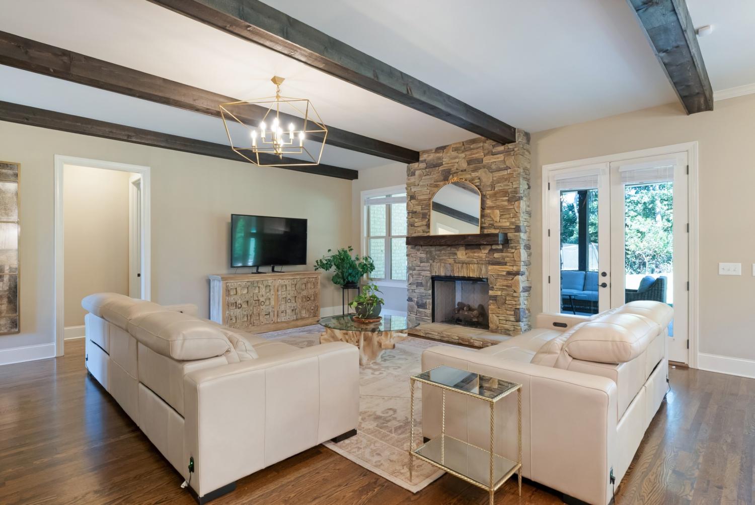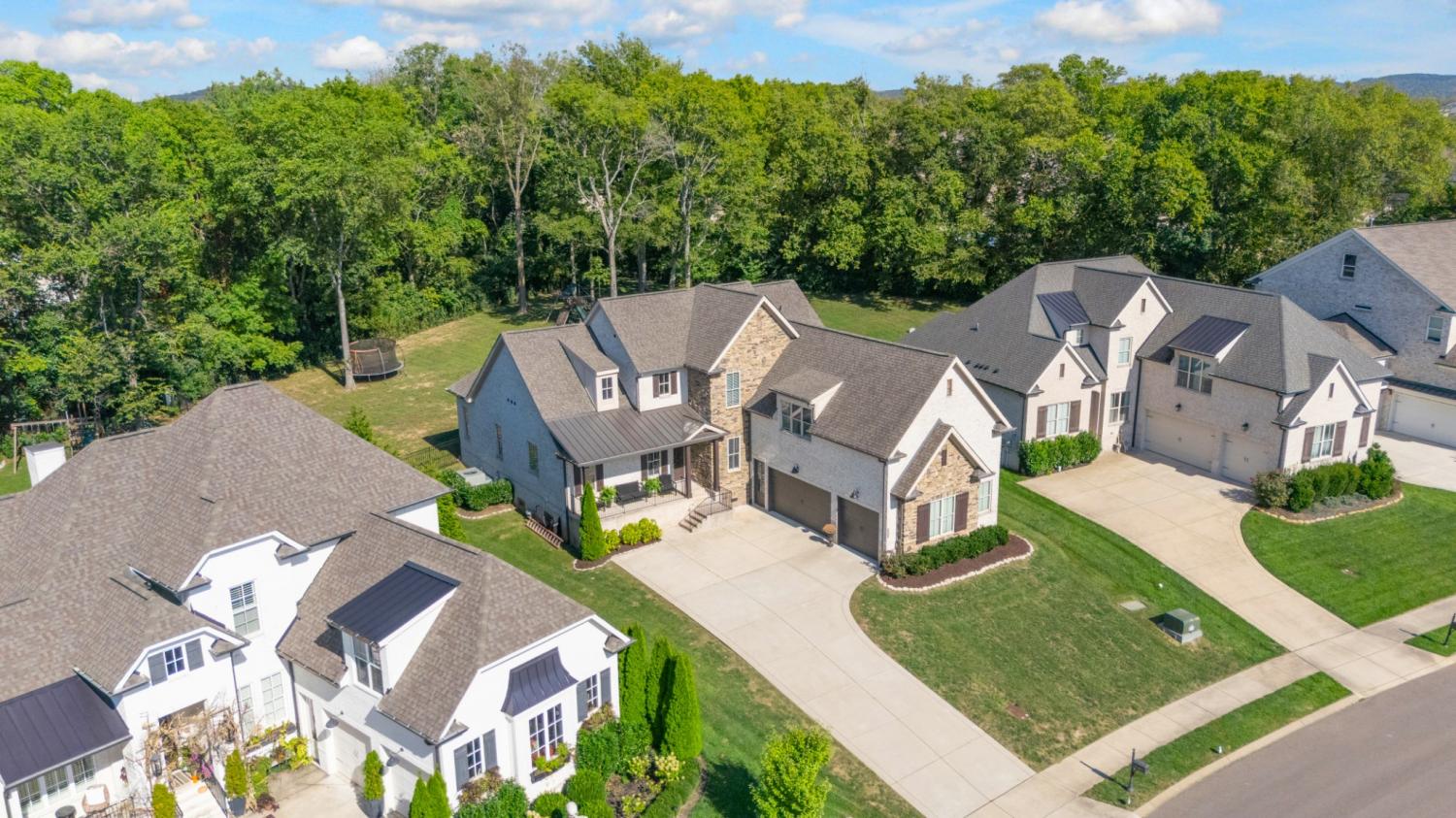 Distinguished Bridgemore Village! Backs to Trees! This 4-bed, 4.5-bath home is made for living and entertaining w/ ease and in style. Open-concept living space features wood beams, hardwood floors, and panoramic windows that fill the home with light, all set against a neutral palette. A double-sided, floor-to-ceiling fireplace steals the show while anchoring the living room and creating a warm, inviting centerpiece. Space in the living area is overgenerous, allowing for multiple types of furniture arrangement. Kitchen has granite countertops, abundant cabinets, a gas stove, double ovens, and a dining area large enough for parties, family dinners, or casual breakfasts. Oversized primary suite is a luxurious retreat w/ private access to the outside covered porch. Sizable primary bath features a walk-through shower w/ multiple shower heads, freestanding, oversized bathtub, and separate water closet. Every bedroom is ensuite, w/ granite countertops, tubs, and showers in each. Two bedrooms, including the primary, are conveniently located on the main floor. In addition to two bedrooms, upstairs you'll find a huge bonus room w/ wet bar and built-ins, additional hobby/flex room, and unfinished storage for everything you need to tuck away. Outdoor living abounds w/ a covered back porch w/ fireplace, additional patio, and large fenced yard w/ mature hardwoods. This gorgeous yard is begging for a POOL! Upscale light fixtures and a 3-car garage w/ man-door complete this meticulously maintained home. Front porch views of the rolling Tennessee hills and proximity to top-rated elementary and middle schools make this a rare find—a home built for both hospitality and rest. The neighborhood offers two community pools, kiddie pool, pavilion, playground, basketball court, miles of scenic walking trails, and sidewalks throughout.
