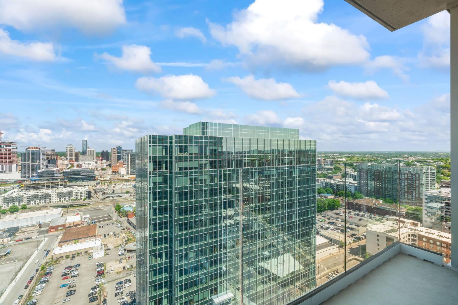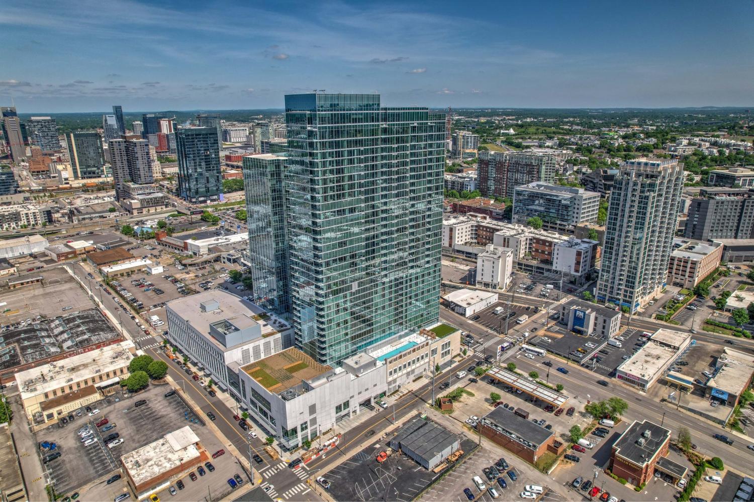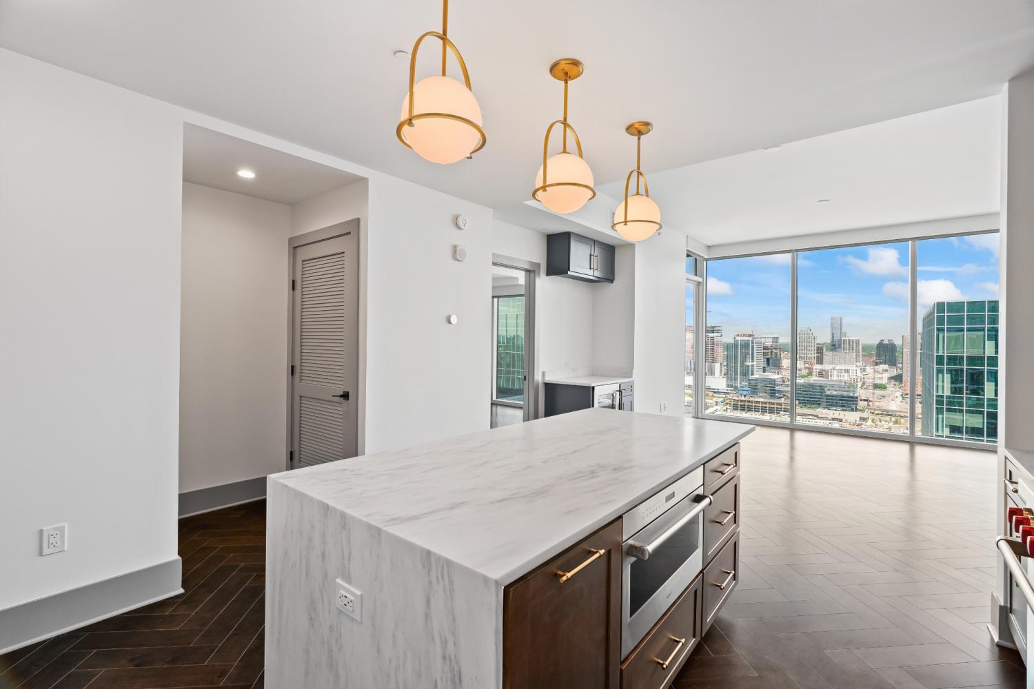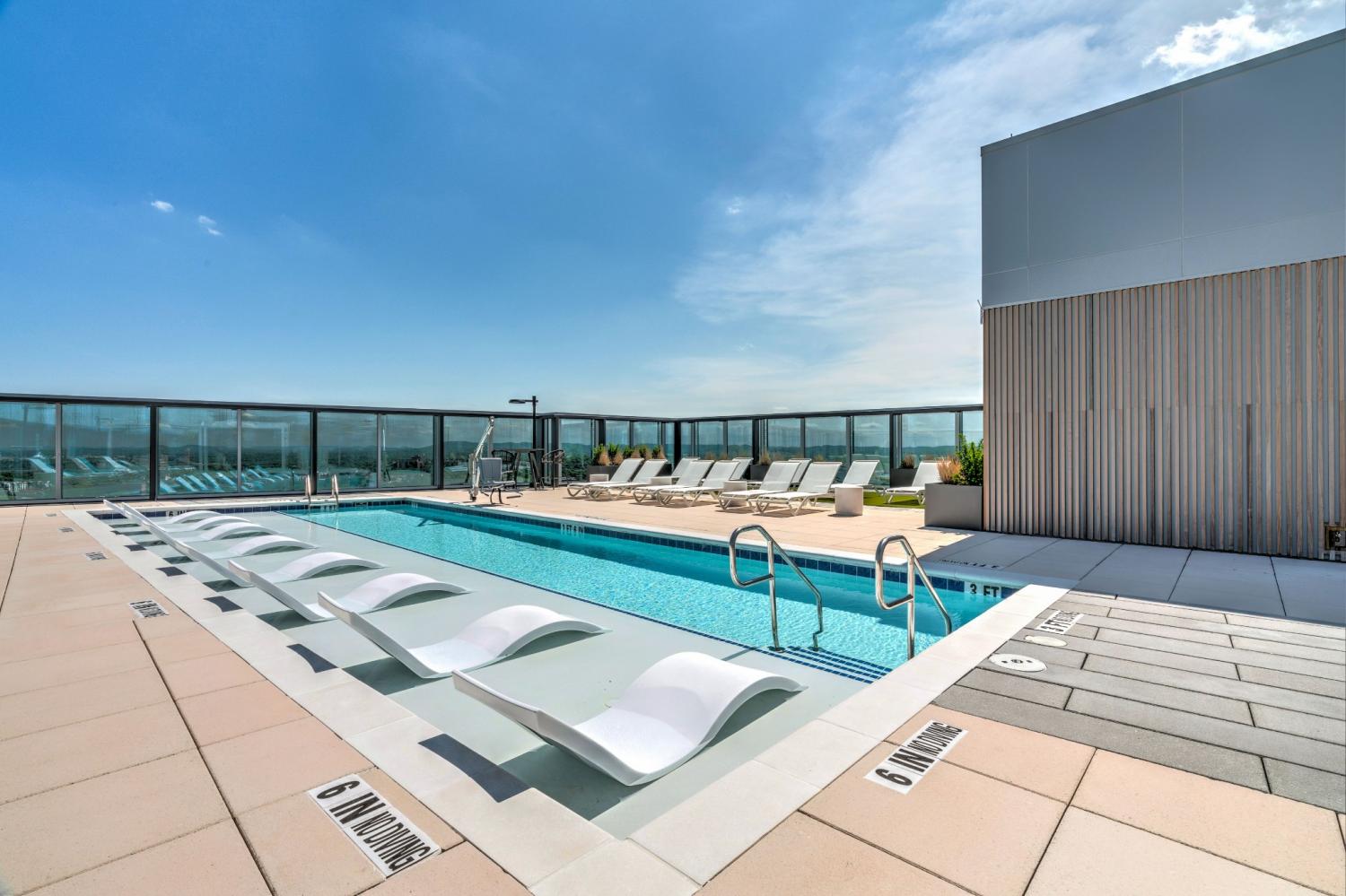 Residences at Broadwest—27th-floor skyline views. Modern open layout with W/D and garage parking in a full-service tower. Building amenities include a 34th-floor resort-style pool & sun terrace, fitness with steam/sauna, golf simulator, library & private conference room, private dining, billiards, lounge/bar, and outdoor green terrace with fire table, gaming lawn & grills; plus 24/7 reception, package services (incl. cold-storage), lobby coffee bar, conference rooms, and Conrad Nashville hospitality services (select services fee-based). Prime Midtown location near Vanderbilt, Centennial Park & Music Row.