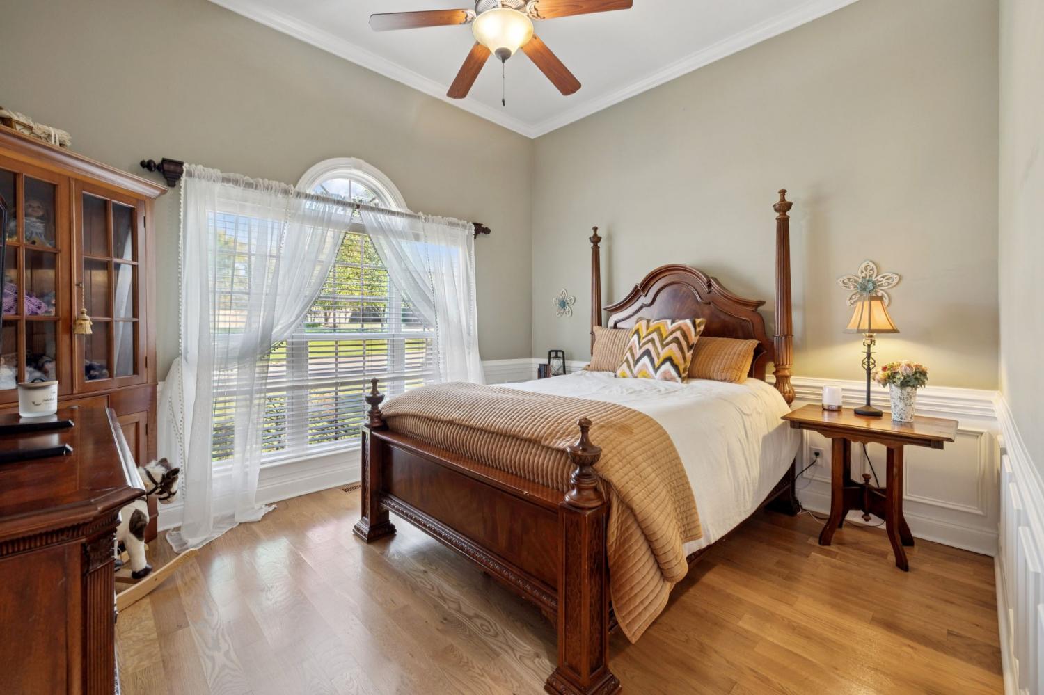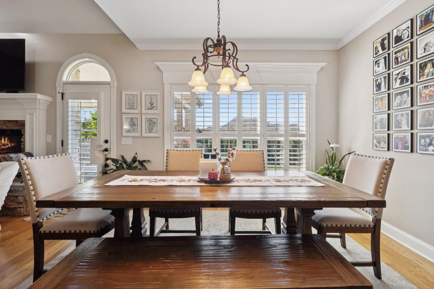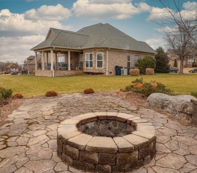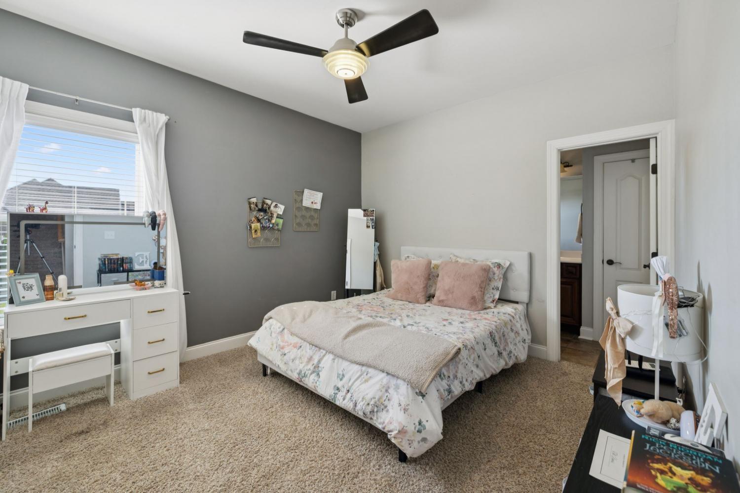 Stunning All-Brick Home in Sought-After Wright Farms Subdivision! This spacious and beautifully maintained home features 4 ensuite bedrooms — with 3 on the main level and a 4th upstairs, currently used as a home theater. Located on a desirable corner lot, this property boasts extra-high ceilings, elegant crown molding, and a traditional gas fireplace that creates a warm, cozy inviting atmosphere. The kitchen is equipped with granite countertops, 6 burner gas stove, 2 large pantries and ample cabinet space. Enjoy everyday convenience with a massive laundry room on the main level. Relax or entertain on the charming covered back patio overlooking a large, fenced-in backyard featuring beautiful trees creating the right amount of privacy — perfect for pets, play, or outdoor gatherings. The metal fencing columns with sunset lighting sets the mood for a fire in the backyard brick firepit. No need to stress over the maintenance of all of the beautiful Landscaping as there are drip lines and soaker hoses on timers around the home and privacy fence. The roof was replaced in Spring 2023 with a 3D shingle. The home is located across the street from the community pool, clubhouse and playground. Don't miss your chance to own a home in one of the area's most sought-after neighborhoods, Wright Farms.