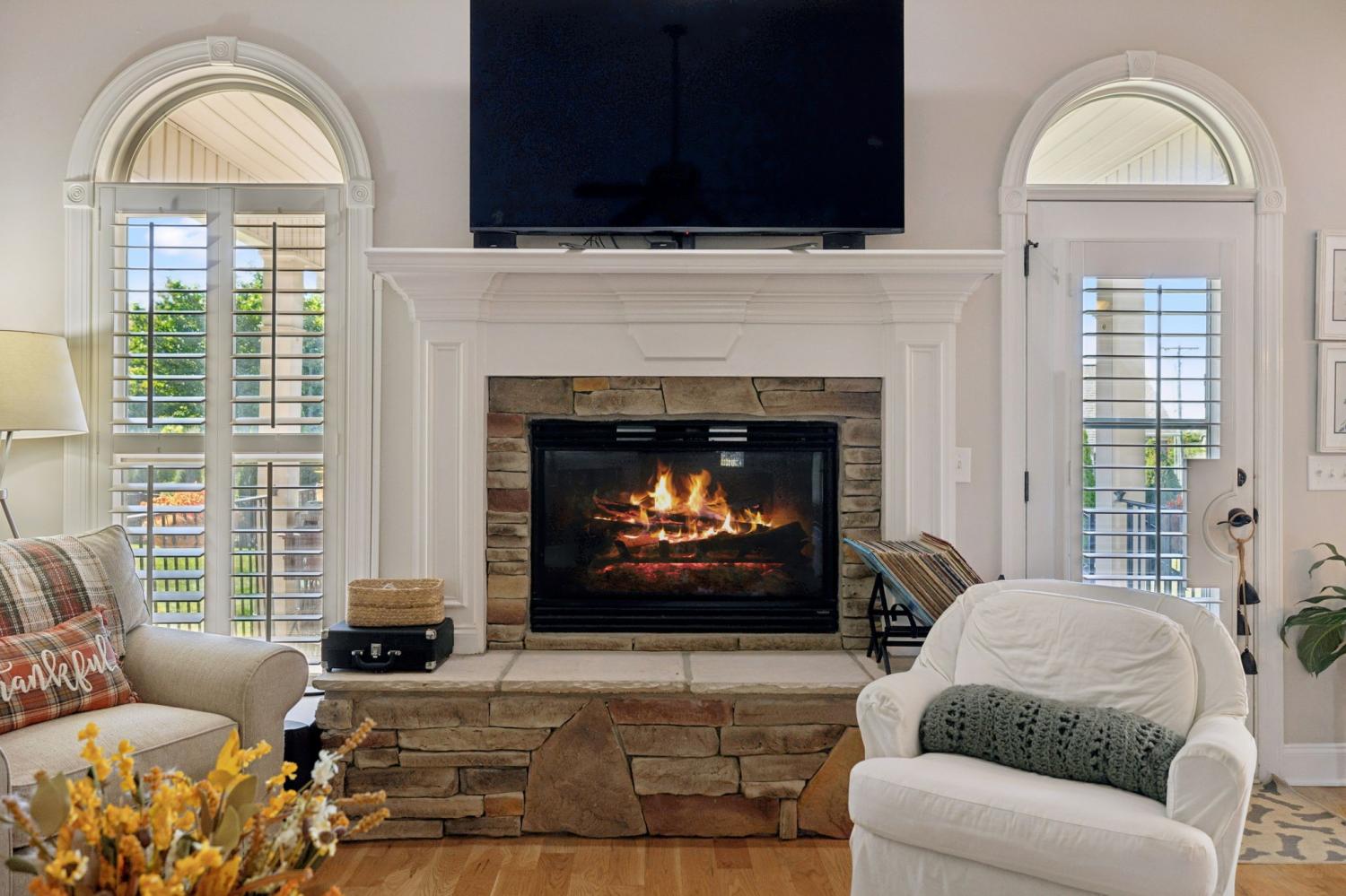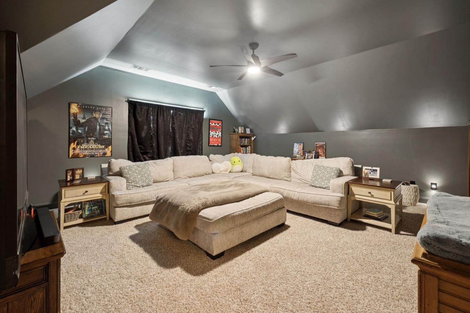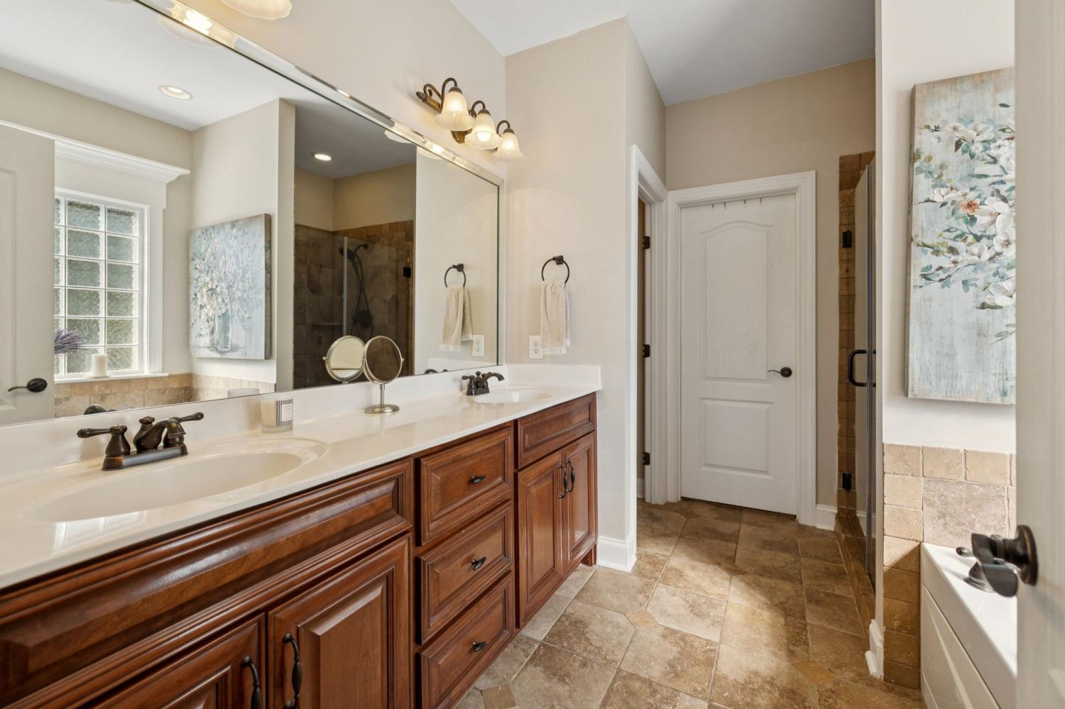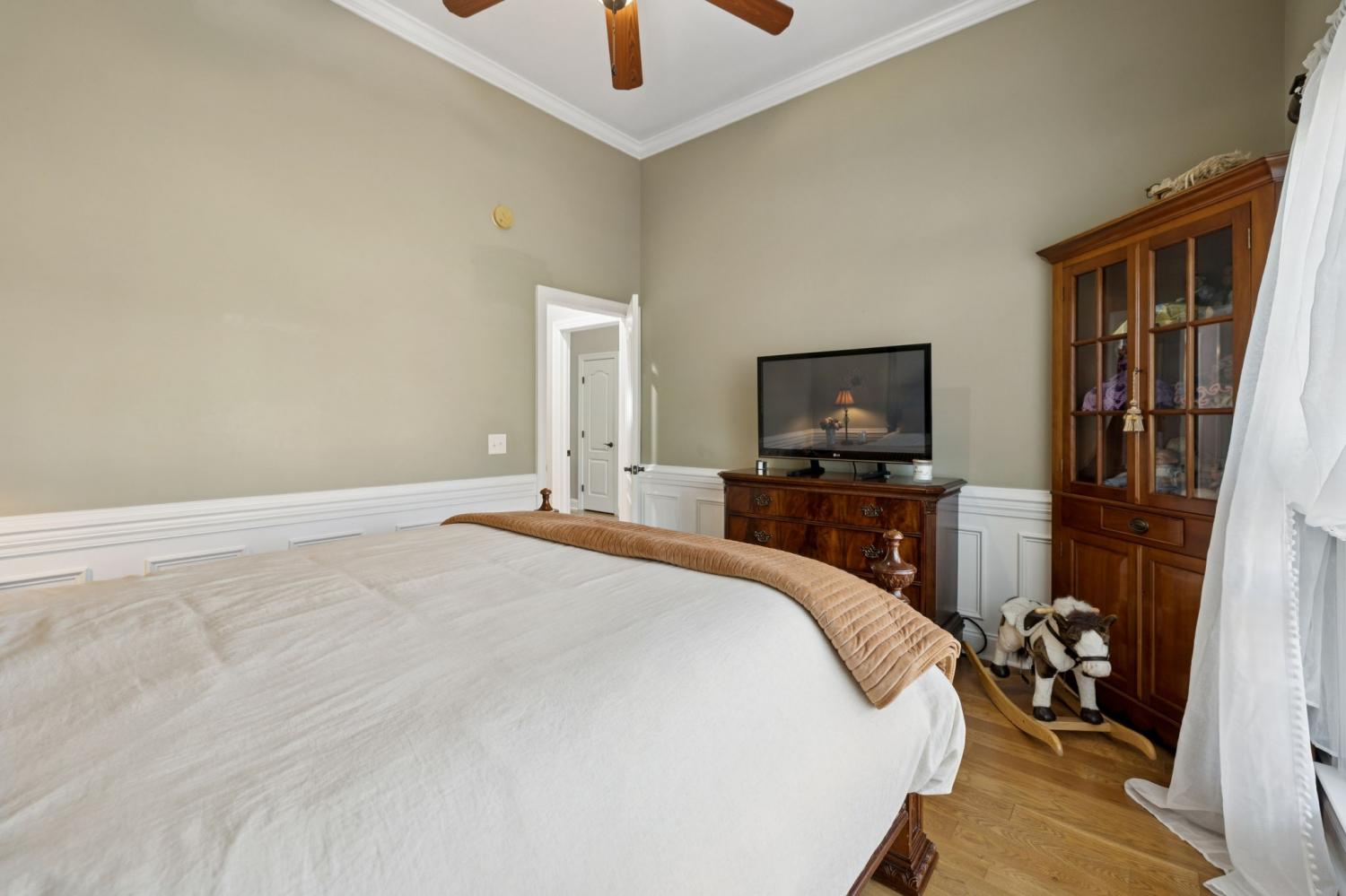 Stunning All-Brick Home in Sought-After Wright Farms Subdivision! This spacious and beautifully maintained home features 4 ensuite bedrooms — with 3 on the main level and a 4th upstairs, currently used as a home theater. Located on a desirable corner lot, this property boasts extra-high ceilings, elegant crown molding, and a traditional gas fireplace that creates a warm, cozy inviting atmosphere. The kitchen is equipped with granite countertops, 6 burner gas stove, 2 large pantries and ample cabinet space. Enjoy everyday convenience with a massive laundry room on the main level. Relax or entertain on the charming covered back patio overlooking a large, fenced-in backyard featuring beautiful trees creating the right amount of privacy — perfect for pets, play, or outdoor gatherings. The metal fencing columns with sunset lighting sets the mood for a fire in the backyard brick firepit. No need to stress over the maintenance of all of the beautiful Landscaping as there are drip lines and soaker hoses on timers around the home and privacy fence. The roof was replaced in Spring 2023 with a 3D shingle. The home is located across the street from the community pool, clubhouse and playground. Don't miss your chance to own a home in one of the area's most sought-after neighborhoods, Wright Farms.