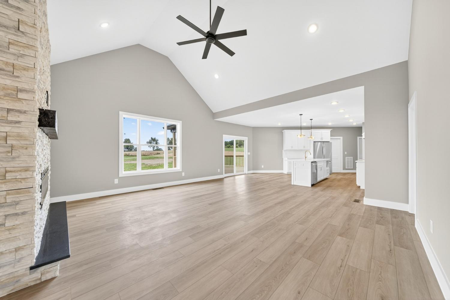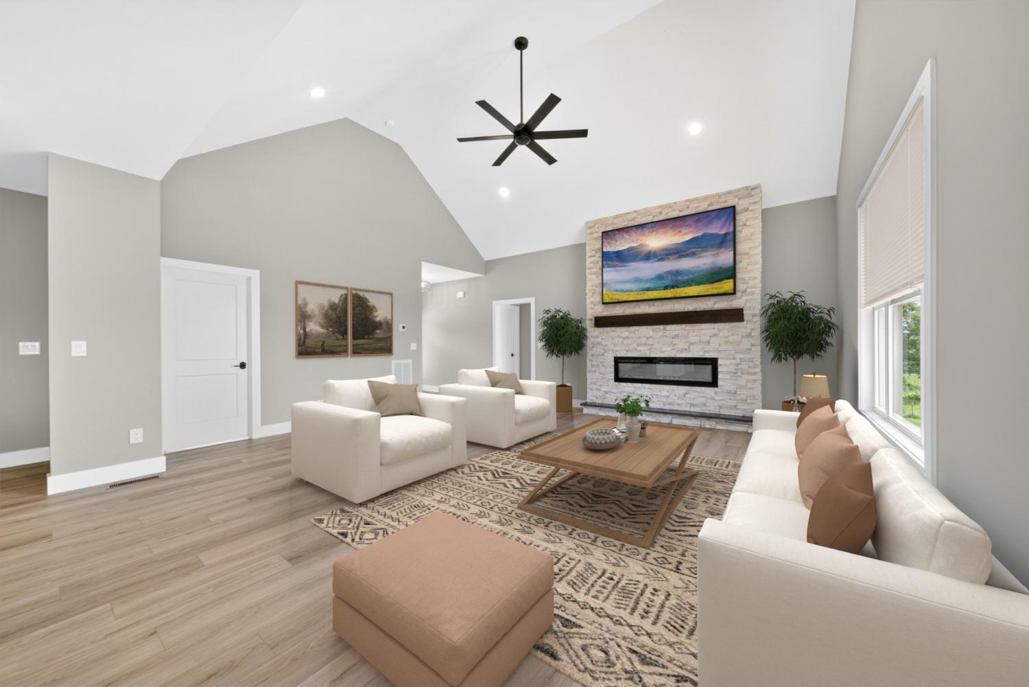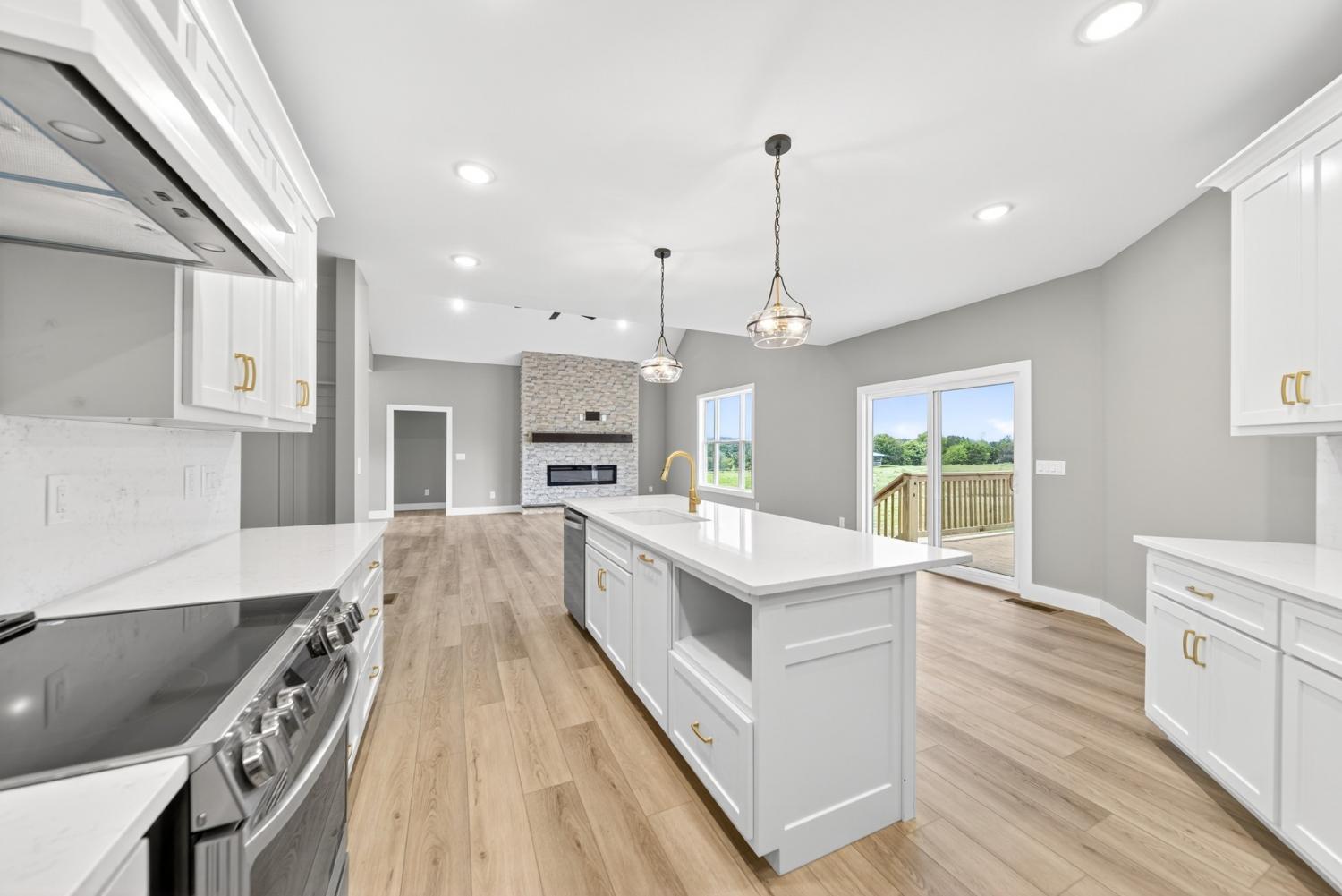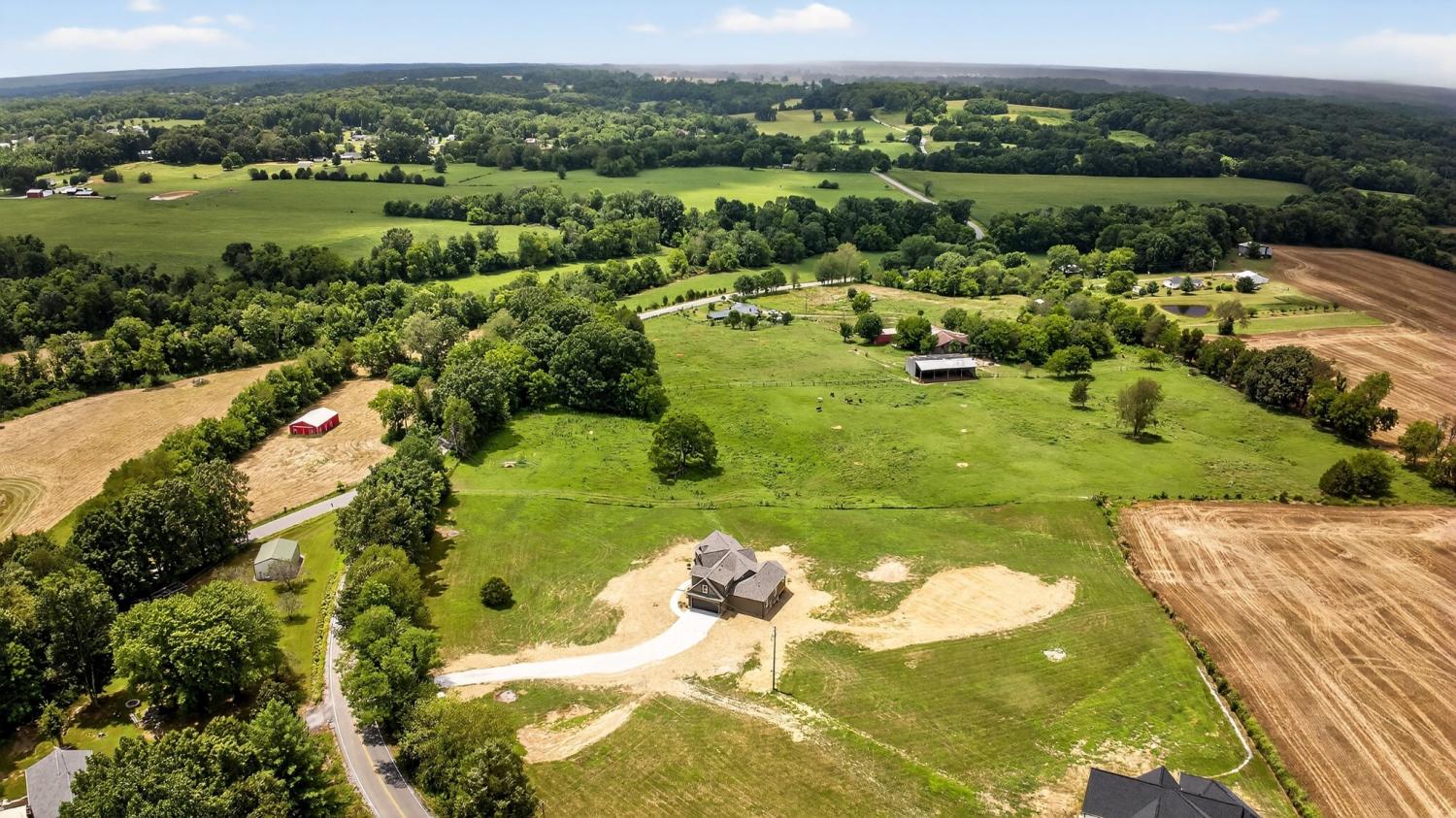Spectacular 5 bed, 3.5 bath home (perked for 3 bedrooms) situated on 2.6 beautiful acres, just 10 minutes to several surrounding communities. This impressive property combines timeless curb appeal with modern design, featuring a classic brick and Hardie board exterior and an inviting covered front porch that sets the tone for the elegance and comfort found inside. Step into a stunning open floor plan with soaring ceilings and a spacious great room highlighted by a floor-to-ceiling stone fireplace, creating the perfect gathering space for family and friends. The gourmet kitchen is a showstopper, boasting custom tile work, quartz countertops and backsplash, modern fixtures, and an ideal layout for both everyday living and entertaining. The luxurious primary suite on the main level features a spa-inspired bath with dual vanities, a double custom tile shower, and a large walk-in closet, offering comfort and style. Additional rooms on the main floor provide great options for a home office, study, or flexible living spaces to fit your needs. Upstairs, the large rec room with a full bath is perfect for a bonus living area or can easily serve as a 5th bedroom. A second versatile room offers endless possibilities—whether you envision a playroom, theater, home gym, or additional office space, it’s ready to be customized to your lifestyle. Enjoy the peaceful country setting from the spacious covered back deck, ideal for outdoor entertaining, morning coffee, or simply unwinding while taking in the surrounding landscape. The 2-car attached garage provides secure parking and additional storage space. Walk in partial basement has a dehumidifier system for lots of extra storage, storm shelter or finish it off for extra room. (enter from side of home.) This property beautifully blends elegance, functionality, and flexibility—creating the perfect place to call home.. (Buyer Bonus! Get a 1% lender credit toward closing costs when you finance with preferred lender)