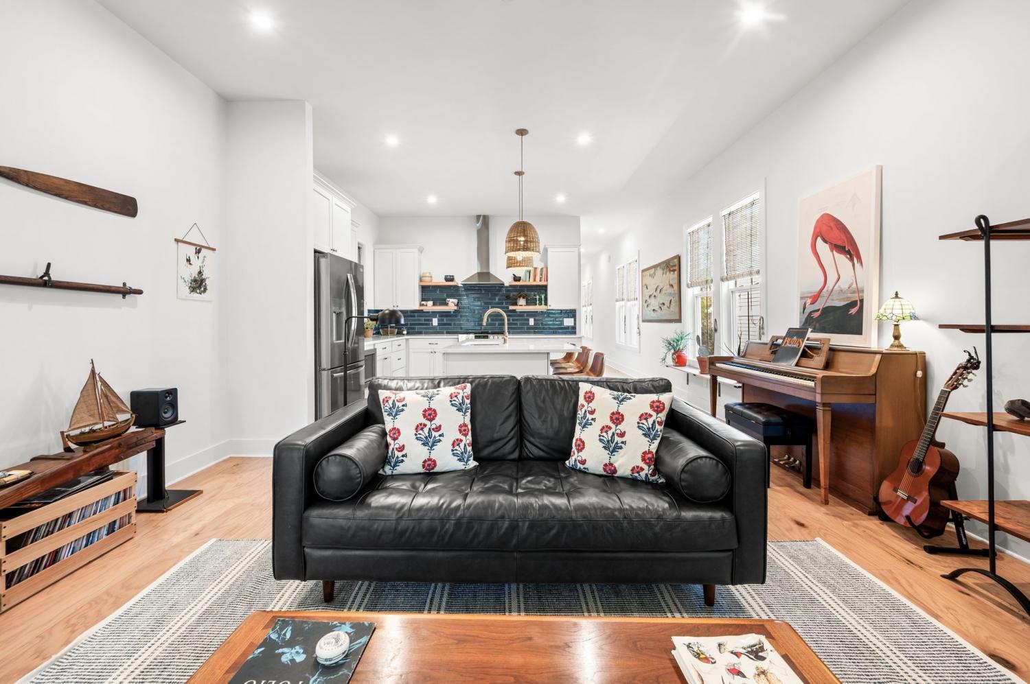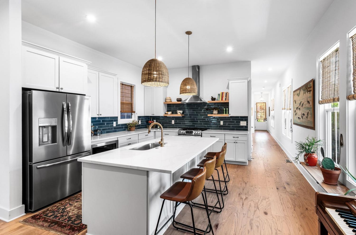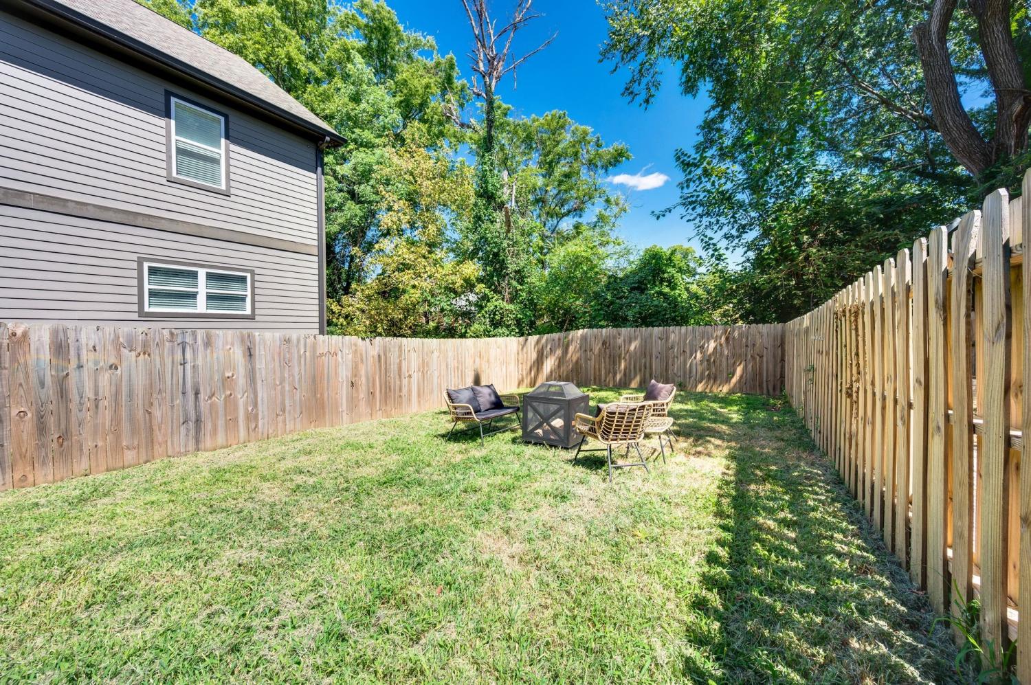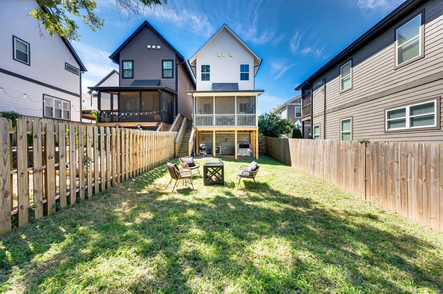 All bedrooms have private, en-suite bathrooms; full kitchen; screened back porch for relaxing; fenced back yard ready for your pup; two smart TVs- one downstairs and larger couch and smart TV living room area upstairs. Walking distance to Elegy Coffee, Nicoletto's Italian, Frankie's Pizza, Mickey's Tavern, Tiger Bar, Gramp's Garage, Anytime Fitness, YMCA, Grimey's, Living Waters Brewery; close to grocery stores; short distance to Riverside Village restaurants/bars; short drive to Shelby Park; 10 minutes to downtown, 15 minutes to airport. This recently built, beautifully designed home combines modern luxury with cozy comfort for a peaceful and convenient stay near downtown. A two-floor, light-filled open floor plan with natural wood floors and organic finishes throughout. The chefs kitchen features gas cooking and stainless steel appliances. Each of the three bedrooms includes a private en-suite bathroom and large closets. Includes attached garage plus additional parking, screened back porch, fenced backyard, and upstairs laundry room.
