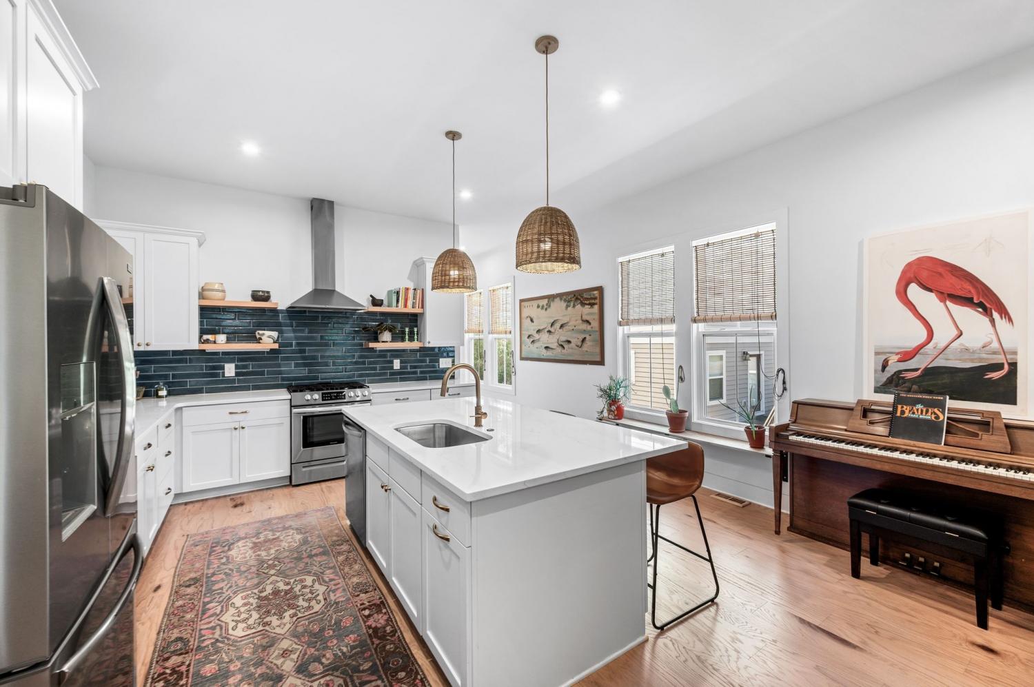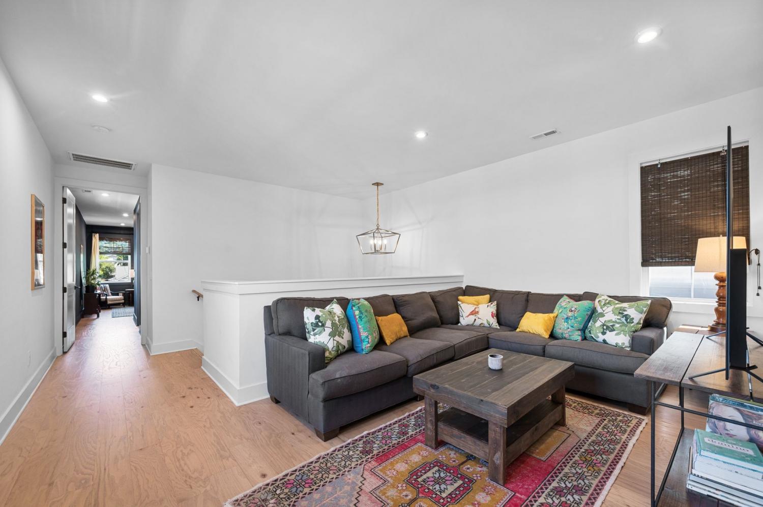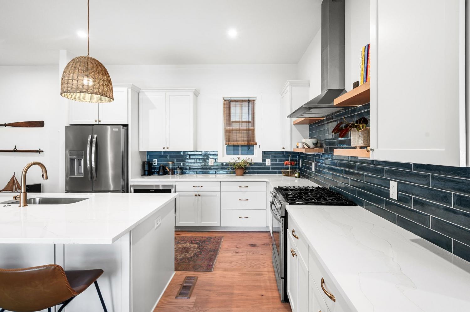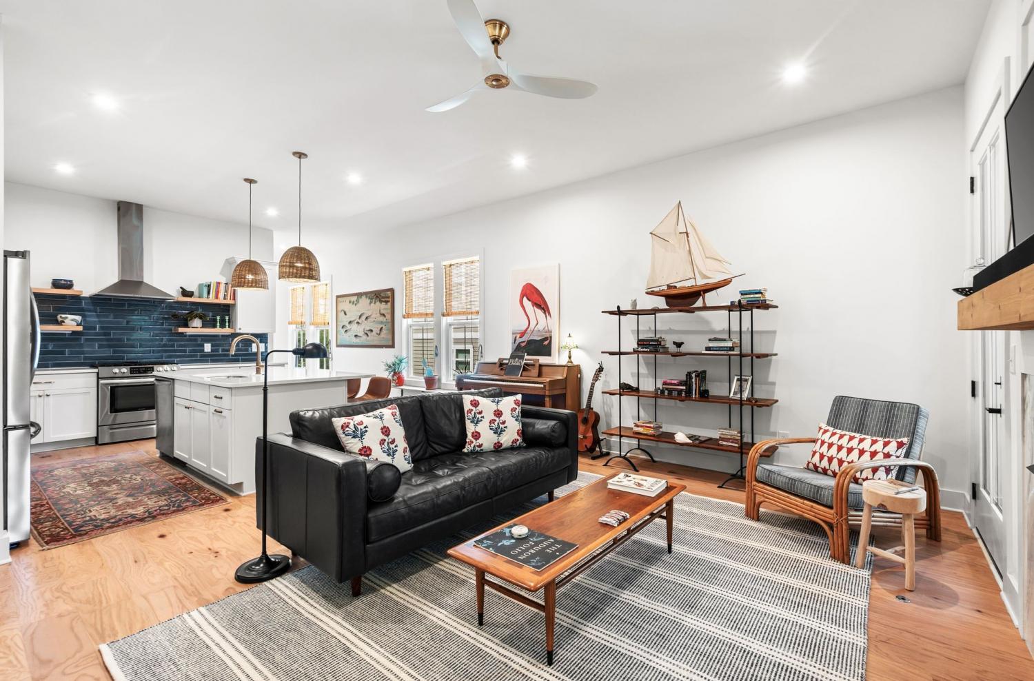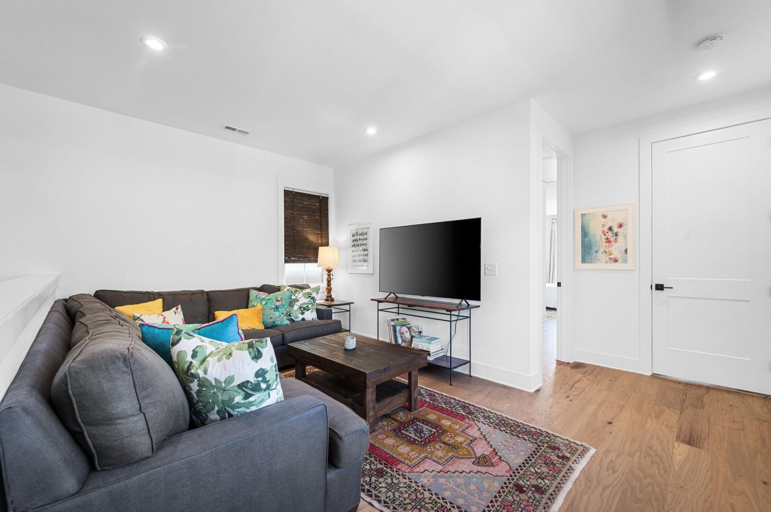 All bedrooms have private, en-suite bathrooms; full kitchen; screened back porch for relaxing; fenced back yard ready for your pup; two smart TVs- one downstairs and larger couch and smart TV living room area upstairs. Walking distance to Elegy Coffee, Nicoletto's Italian, Frankie's Pizza, Mickey's Tavern, Tiger Bar, Gramp's Garage, Anytime Fitness, YMCA, Grimey's, Living Waters Brewery; close to grocery stores; short distance to Riverside Village restaurants/bars; short drive to Shelby Park; 10 minutes to downtown, 15 minutes to airport. This recently built, beautifully designed home combines modern luxury with cozy comfort for a peaceful and convenient stay near downtown. A two-floor, light-filled open floor plan with natural wood floors and organic finishes throughout. The chefs kitchen features gas cooking and stainless steel appliances. Each of the three bedrooms includes a private en-suite bathroom and large closets. Includes attached garage plus additional parking, screened back porch, fenced backyard, and upstairs laundry room.
