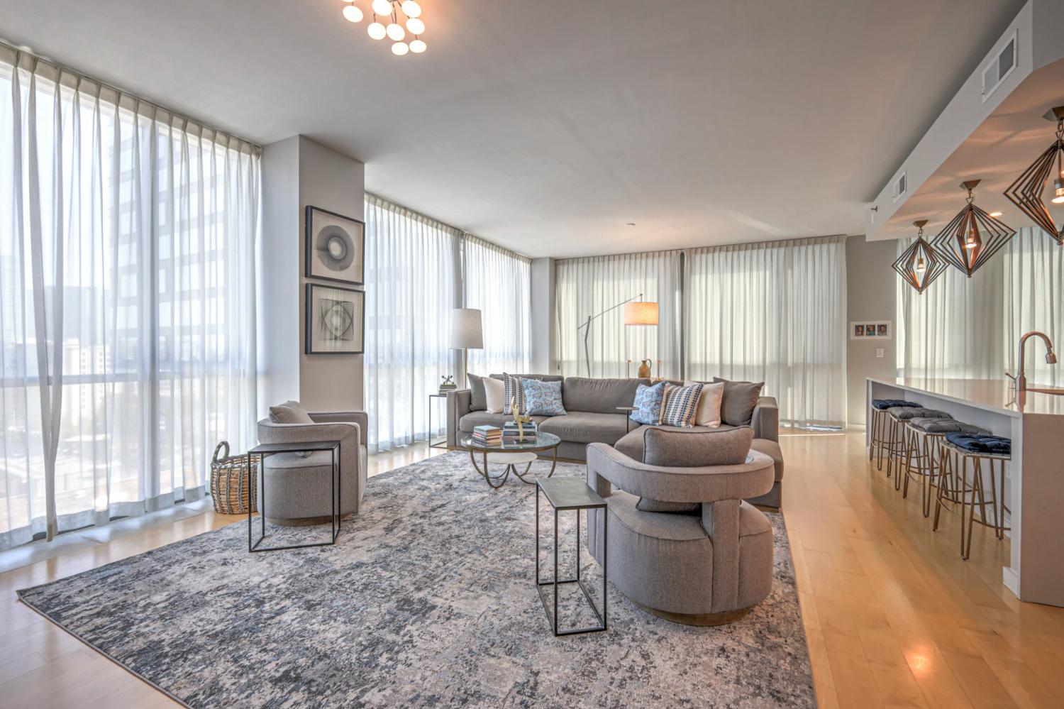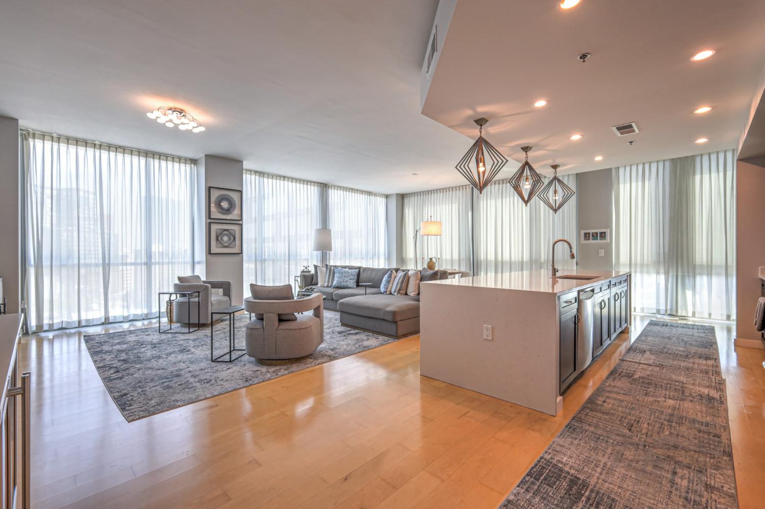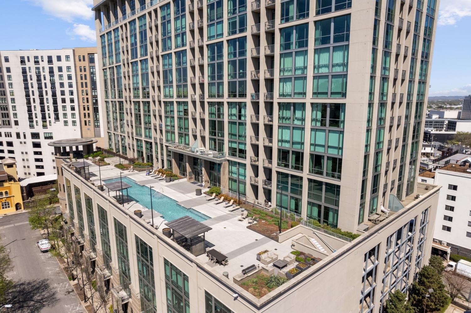 Stunning corner 2-bedroom unit in midtown's premier, high-rise condominium building. Situated steps away from Vanderbilt, Hillsboro Village, Belmont, and historic Music Row, this location offers unparalleled convenience and access to the best of Nashville. Open floor plan with floor-to-ceiling windows, custom window treatments, blackout draperies and hardwood flooring. Quartz contertops in kitchen and baths. 2 balconies off both bedrooms. 2 assigned parking spaces on 5th floor. One storage unit. Leasing restricitions: HOA approval required / waitlist / no short-term rentals. All appliances (including washer and dryer) are included. ALL OR SOME FURNITURE IS NEGOTIABLE. Adelicia: secure building with 24/7 Concierge service, Olympic pool, resident lounge with catering kitchen and sundeck, state-of-the-art 3000 SF fitness facility featuring on-site personal trainers, a Pilates/yoga room, and cutting-edge equipment. More: private dog park, private gated green space, 20,000 SF courtyard. Floorplan and HOA amenities in photos and links. See attached YouTube video.