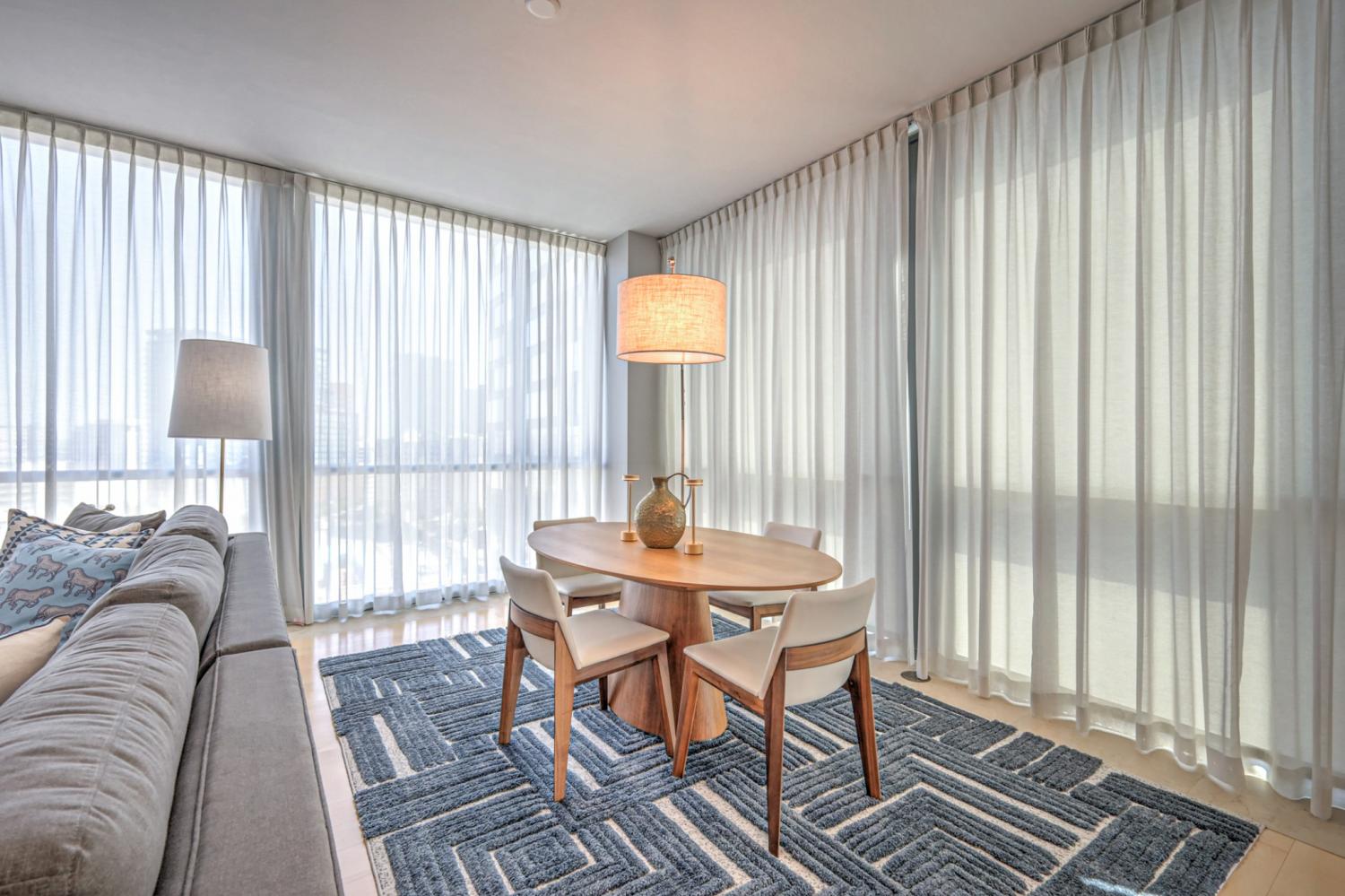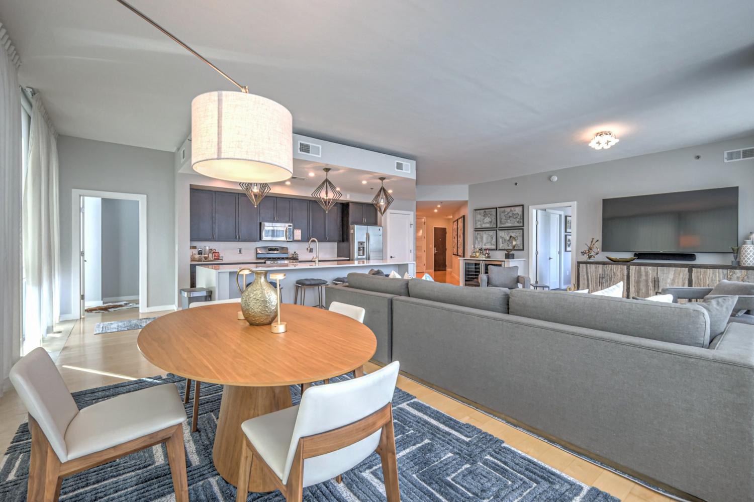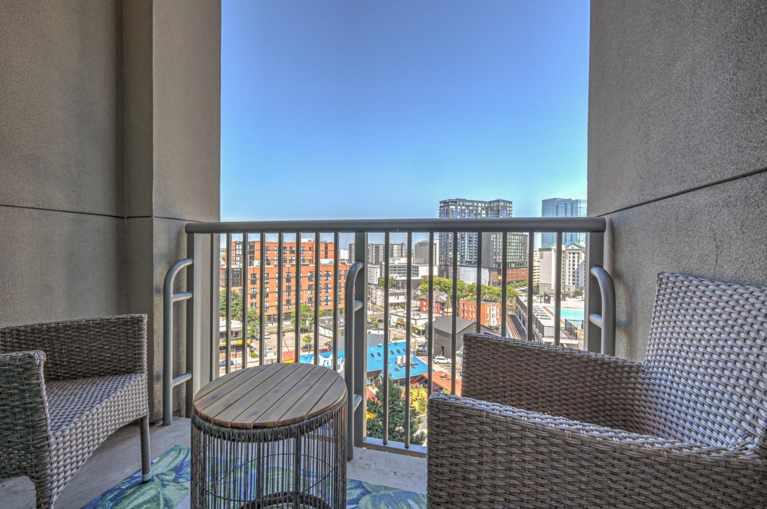 Stunning corner 2-bedroom unit in midtown's premier, high-rise condominium building. Situated steps away from Vanderbilt, Hillsboro Village, Belmont, and historic Music Row, this location offers unparalleled convenience and access to the best of Nashville. Open floor plan with floor-to-ceiling windows, custom window treatments, blackout draperies and hardwood flooring. Quartz contertops in kitchen and baths. 2 balconies off both bedrooms. 2 assigned parking spaces on 5th floor. One storage unit. Leasing restricitions: HOA approval required / waitlist / no short-term rentals. All appliances (including washer and dryer) are included. ALL OR SOME FURNITURE IS NEGOTIABLE. Adelicia: secure building with 24/7 Concierge service, Olympic pool, resident lounge with catering kitchen and sundeck, state-of-the-art 3000 SF fitness facility featuring on-site personal trainers, a Pilates/yoga room, and cutting-edge equipment. More: private dog park, private gated green space, 20,000 SF courtyard. Floorplan and HOA amenities in photos and links. See attached YouTube video.
