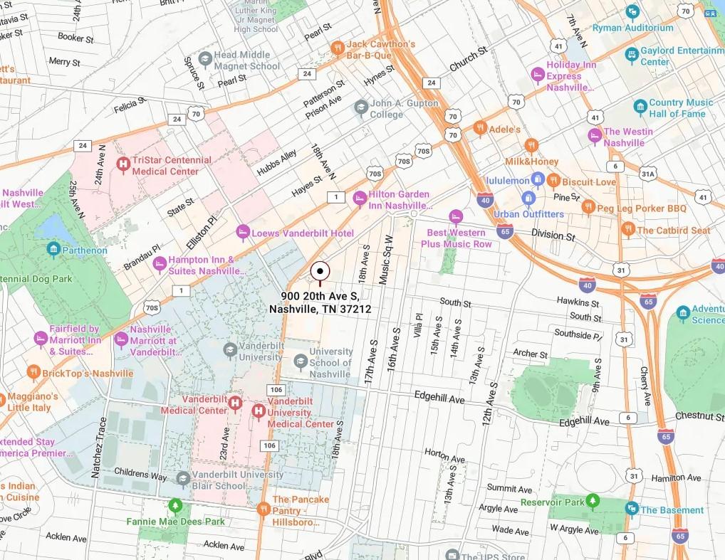 From Downtown, head West on Broadway;. Veer left on Division Street. Turn left on 20th Ave S. Entrance is on the corner of Chet Atkins and 20th Ave. S. Guest parking on Chet Atkins to left of building, by dog park or metered street parking.