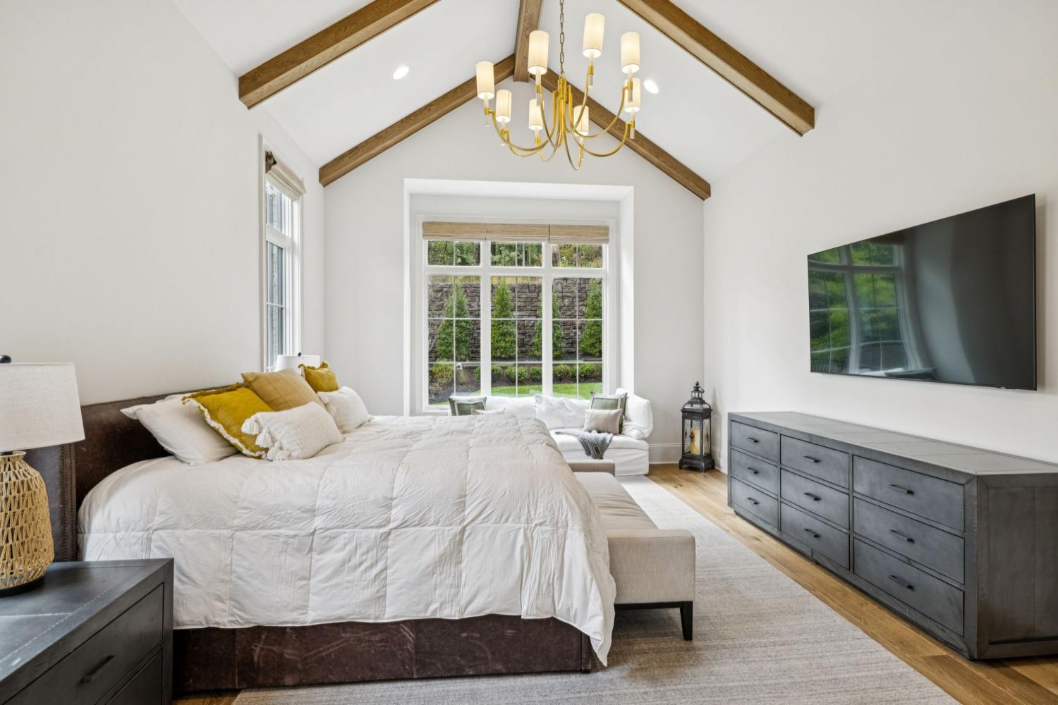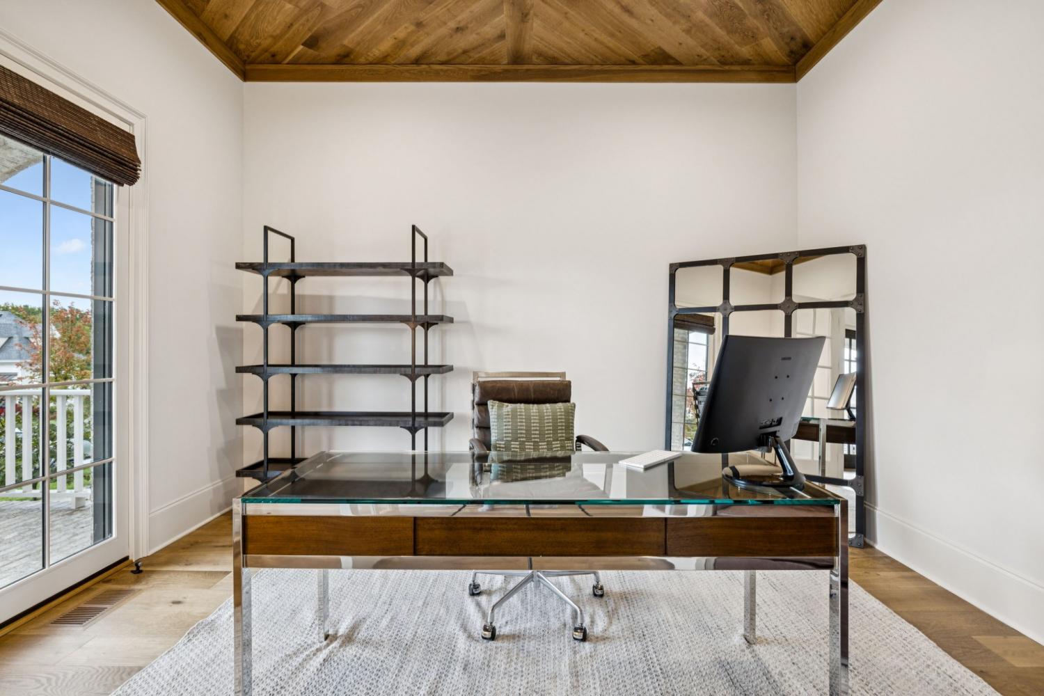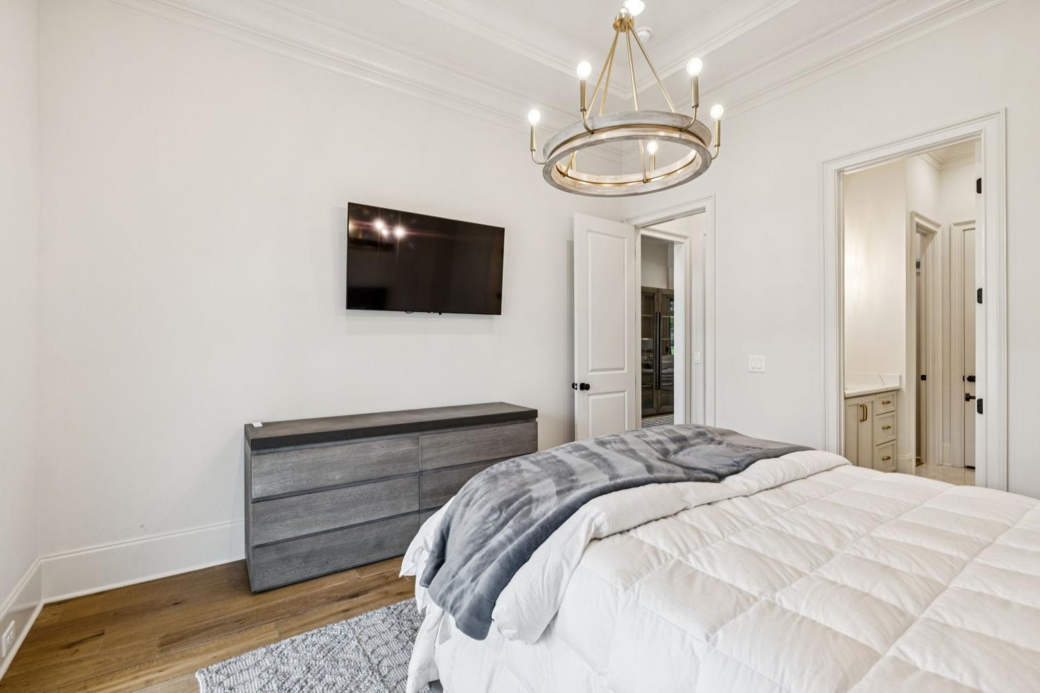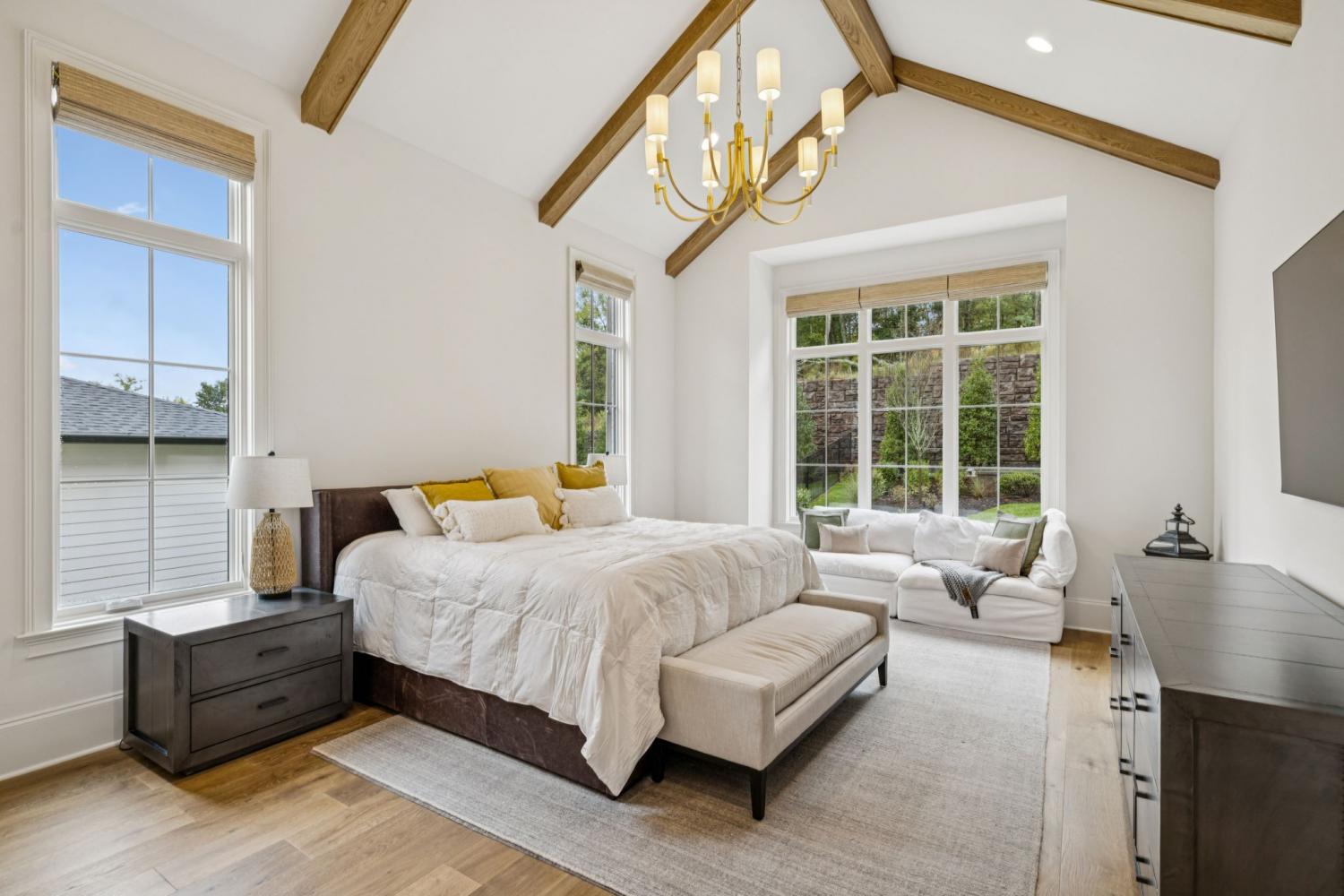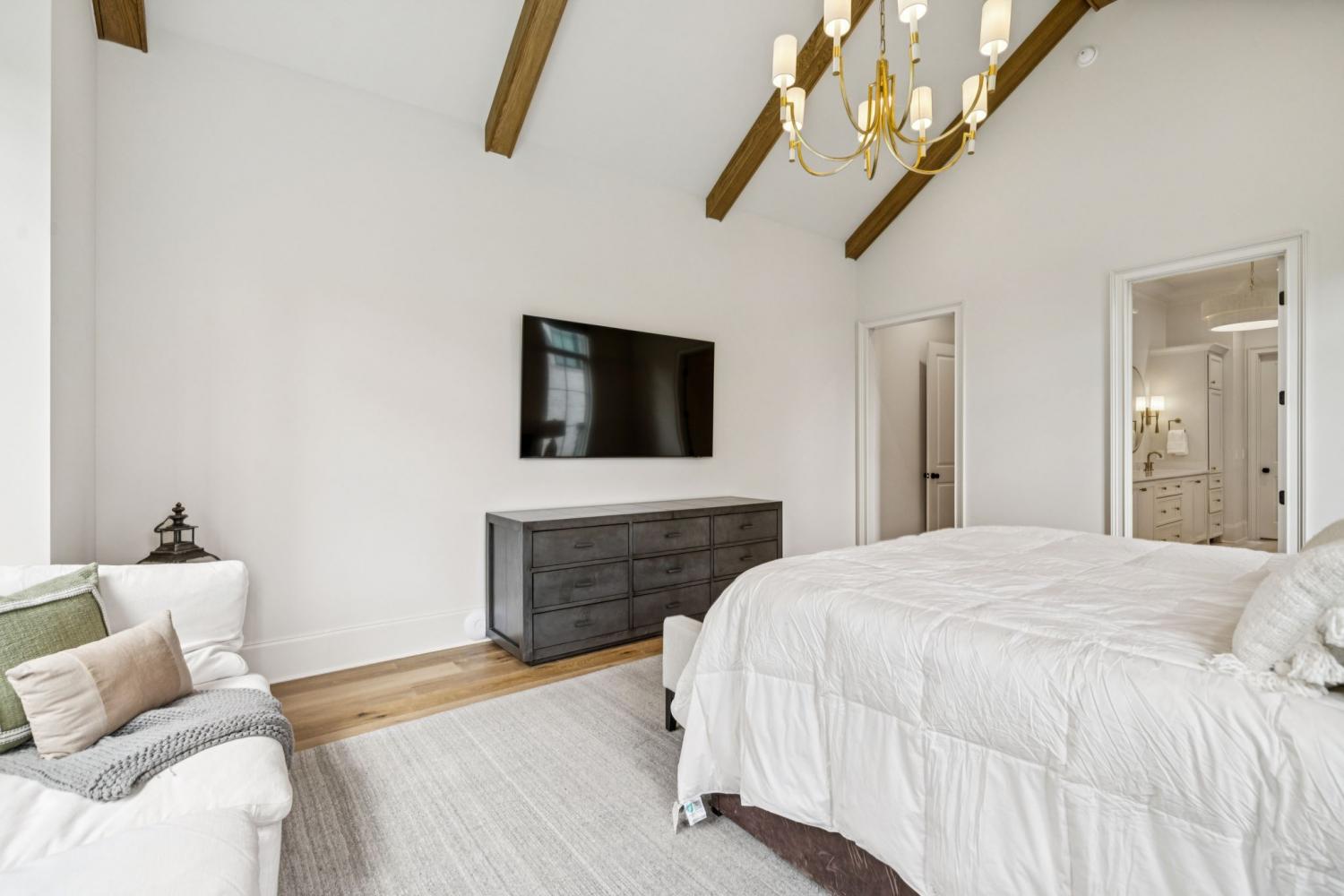 Experience The Grove living in this beautiful Georgian-style home built by Ford Homes! Featuring not one, but two charming covered front porches. The flexible floor plan is a true highlight, featuring a highly sought-after main-level Primary Suite, complete with a vaulted ceiling and a huge walk-in closet. The main floor is designed for effortless entertaining: an open Great Room full of natural light with stunning exposed wood beams, a dedicated dining area, and an exquisite chef's kitchen. Step outside to the ideal outdoor oasis: a covered porch with retractable screens and a wood-burning fireplace for year-round enjoyment, plus an uncovered grilling patio. The main floor also offers an additional second bedroom and a private study. The second level has three more bedrooms, a large equipped game/media room with a wet bar. Make sure to visit The Grove's clubhouse and amenity center to see the pool, tennis, restaurant, golf, and more!
