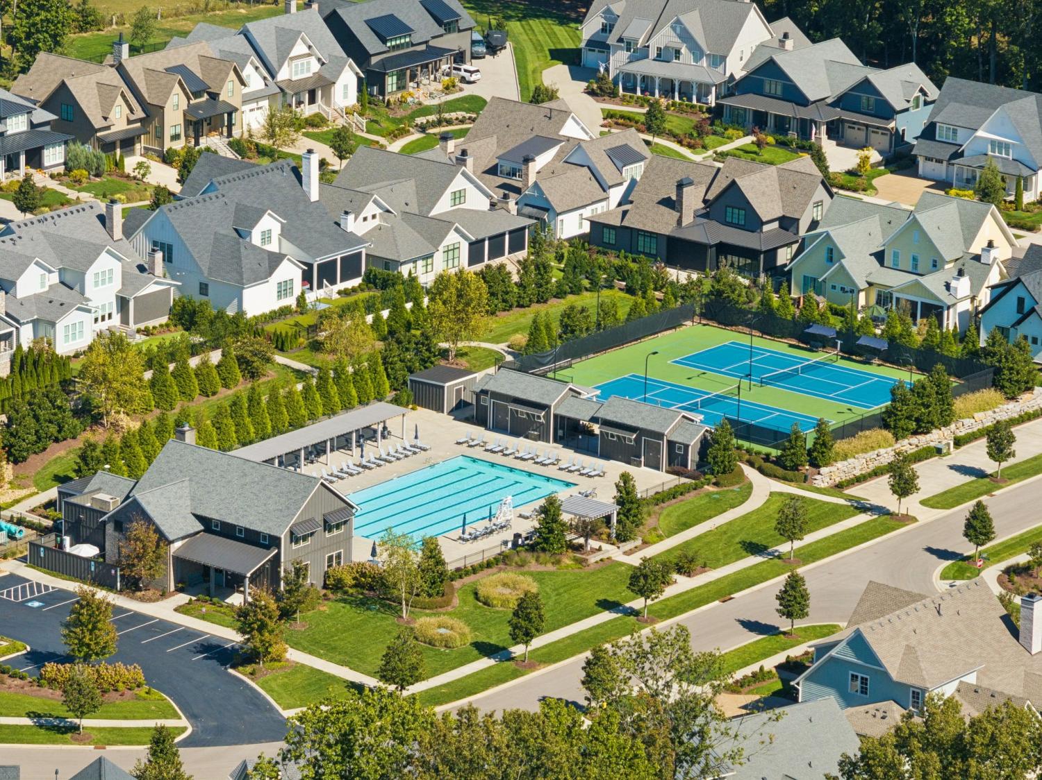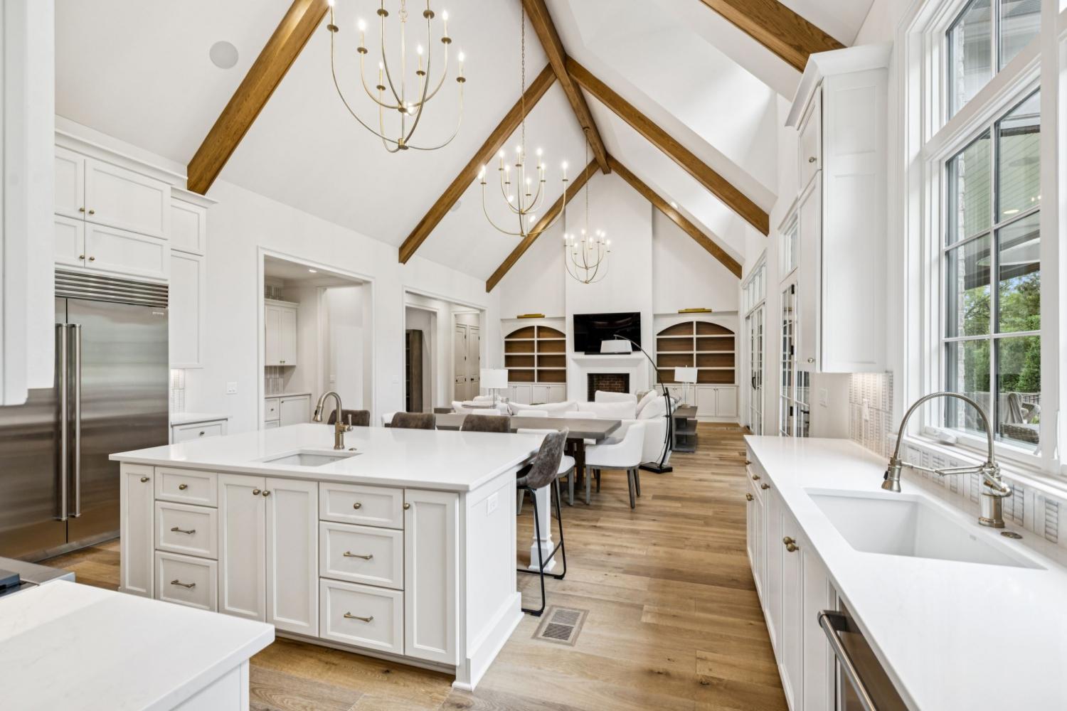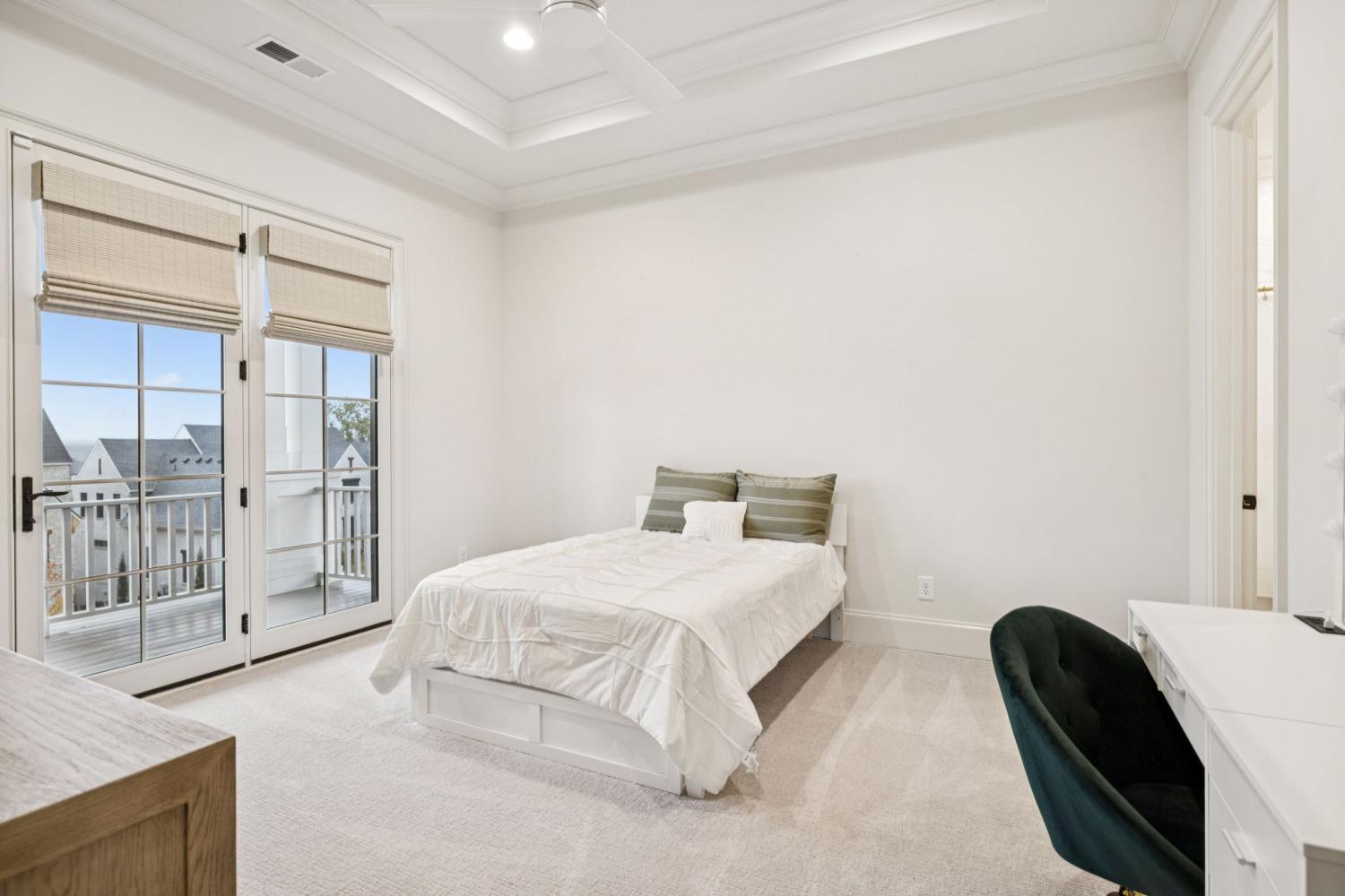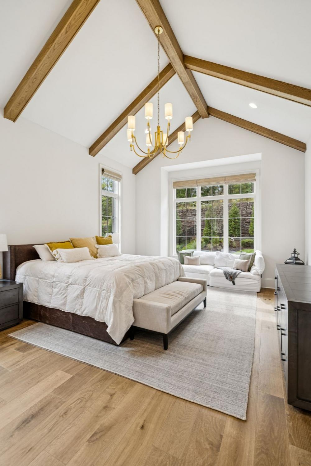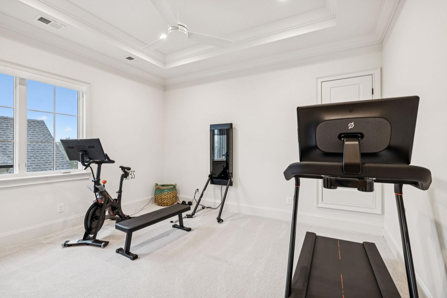 Experience The Grove living in this beautiful Georgian-style home built by Ford Homes! Featuring not one, but two charming covered front porches. The flexible floor plan is a true highlight, featuring a highly sought-after main-level Primary Suite, complete with a vaulted ceiling and a huge walk-in closet. The main floor is designed for effortless entertaining: an open Great Room full of natural light with stunning exposed wood beams, a dedicated dining area, and an exquisite chef's kitchen. Step outside to the ideal outdoor oasis: a covered porch with retractable screens and a wood-burning fireplace for year-round enjoyment, plus an uncovered grilling patio. The main floor also offers an additional second bedroom and a private study. The second level has three more bedrooms, a large equipped game/media room with a wet bar. Make sure to visit The Grove's clubhouse and amenity center to see the pool, tennis, restaurant, golf, and more!