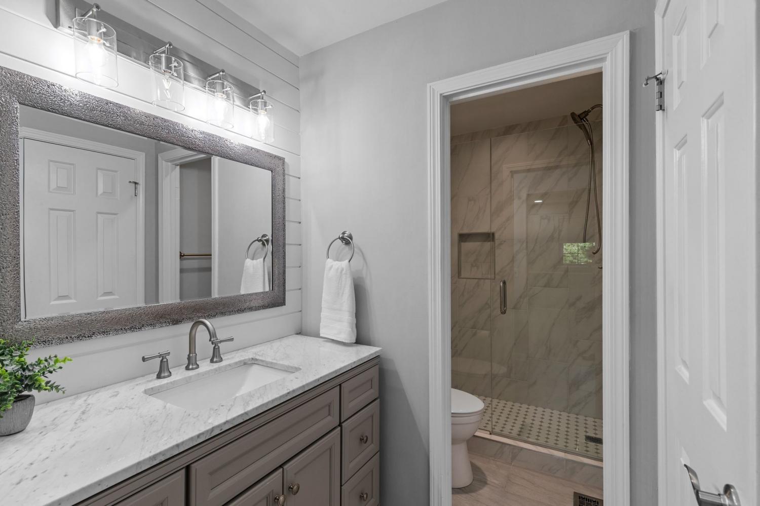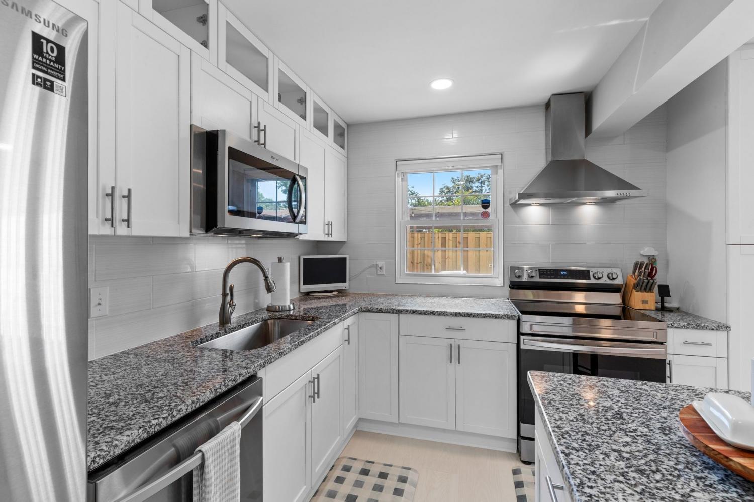 Completely renovated like NEW and move in ready. Den w/floor to ceiling stacked stone FP. Kitchen with new Stainless Steel appliances, granite countertops, tile backsplash and island for sitting to eat. New carpet in primary bedroom and large walk in closet. New tile shower in primary. New flooring, new plumbing, fixtures, toilets and new bathtub with new shower door. New Quartz Hearth privacy blinds installed. New front door. New light fixtures/fans. New washer and dryer. New concrete and paver patio with new fence. Extra parking in back of patio.