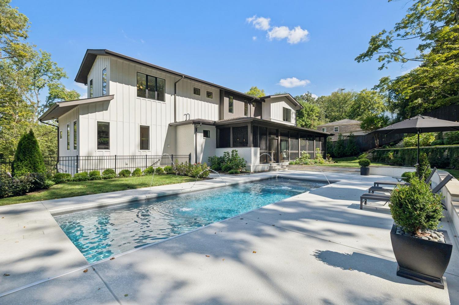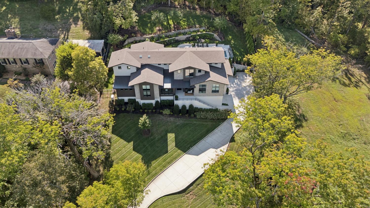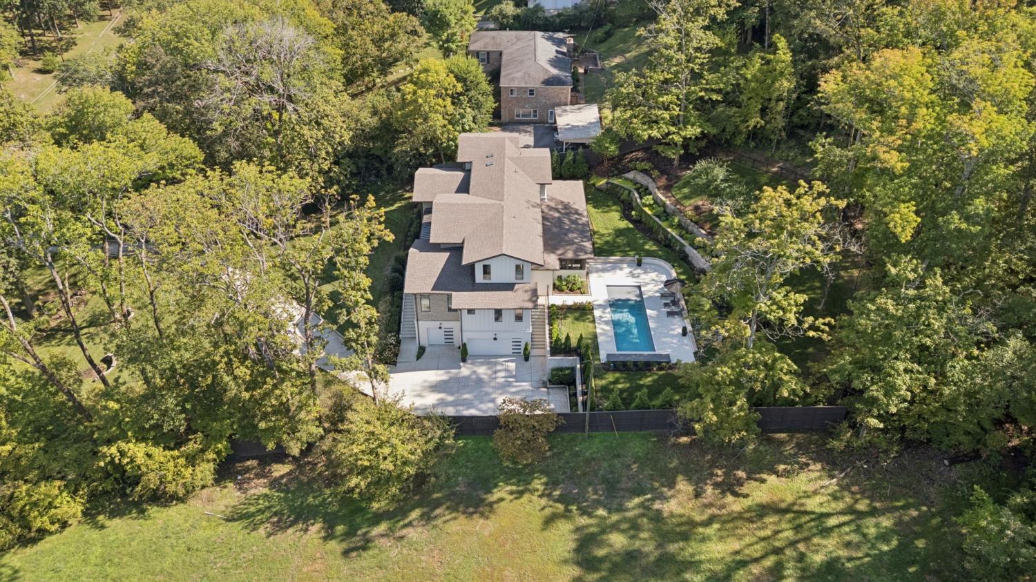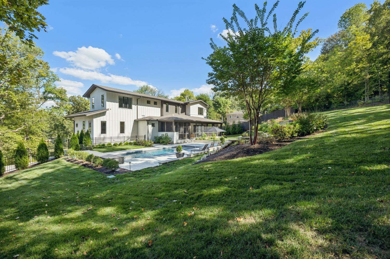 Perched above the treetops, this 5-bedroom West Meade luxury home by BUILD Nashville blends contemporary design with timeless charm. Located on nearly 2 acres in one of Nashville’s most desirable neighborhoods, this new construction retreat offers the rare combination of privacy, style, and sweeping views—creating an atmosphere of both elegance and ease. On the main level, you’ll find the primary suite, a guest room, home office, and laundry—a highly sought-after layout for convenience and functionality. The heart of the home features multiple indoor and outdoor entertaining spaces, including a screened-in patio, outdoor kitchen, and spacious gathering areas that flow seamlessly from inside to out. A gorgeous butler’s pantry and massive walk-in pantry elevate both hosting and everyday living. Upstairs, discover three additional bedrooms and a spacious media room (potential for 6th Bedroom). Each guest suite includes an en suite bathroom with designer tilework and a built-out walk-in closet, providing comfort and privacy for family or visitors. Throughout the home you’ll also find abundant storage closets, and the thoughtful design even allows for a future elevator installation if desired. Practical upgrades enhance the everyday experience, including a whole-home generator with automatic transfer switch, and a garage finished with epoxy floors, built-in workbench, and wall rack storage system—perfect for organization and functionality. Set on almost 2 acres, the property offers a rare combination of beautiful landscaping, usable yard space, and a heated pool with retractable cover—ideal for year-round enjoyment. Perfectly positioned in West Meade, this luxury home is just minutes from local shopping, restaurants, Costco, major interstates, and John C. Tune Airport—offering easy access to everything Nashville has to offer while maintaining the serenity of hilltop living.