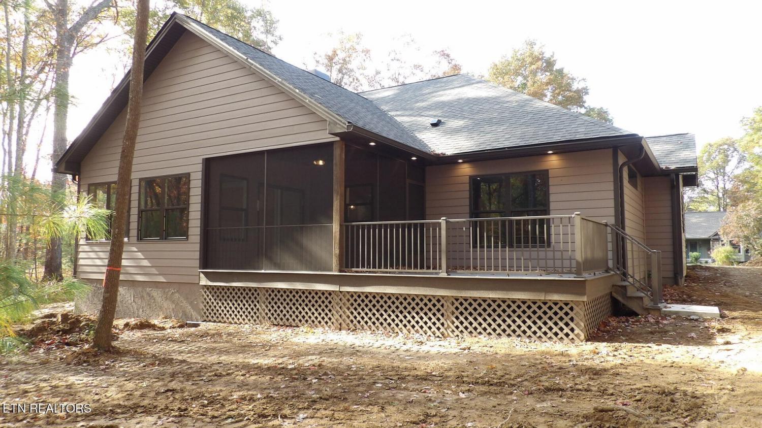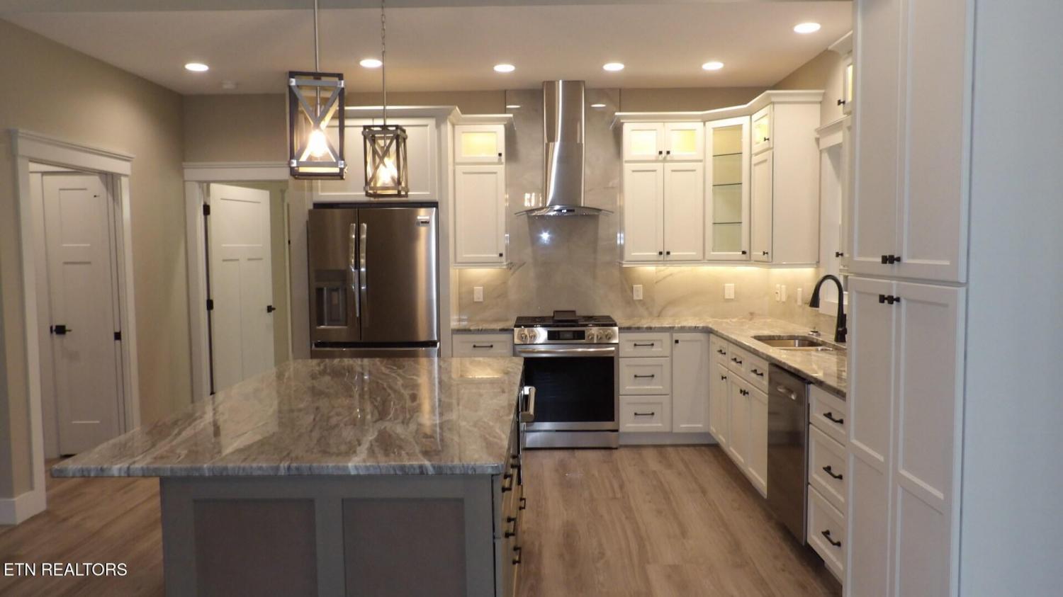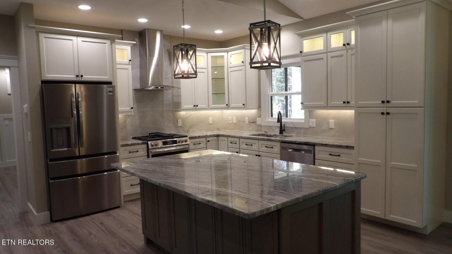 Quality built 3 bedroom, 2 bath home with cathedral ceiling in living room and a gorgeous gas fireplace that catches the eye from the front door entry, living room is open to the dining room with wainscoting on wall, and open to the beautiful kitchen with white cabinetry, double stacked upper cabinets with glass door and lights, built in pantry with pull out shelving, the island is a soft green to compliment the Fantasy Brown granite and tile backsplash, the island has storage on both sides, Frigidaire Gallery appliances, luxury vinyl plank flooring throughout the home with ceramic tile in the utility and baths. The master bedroom features a coffered ceiling, pocketdoor entry ensuite with double vanity and walk in tile shower with rainfall shower head, walk in closet with custom shelving. 2 guest bedrooms and bath on the opposite end of the home each featuring custom closet shelving. Spacious sunroom with large windows for natural lighting gives access to the screen porch with tongue & grove ceiling and open deck. Tankless water heater in the 2 car garage and concrete drive.